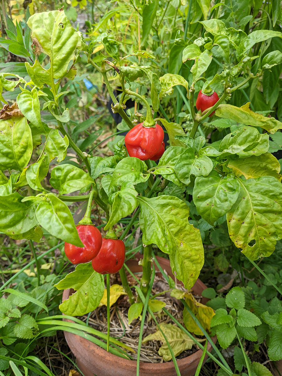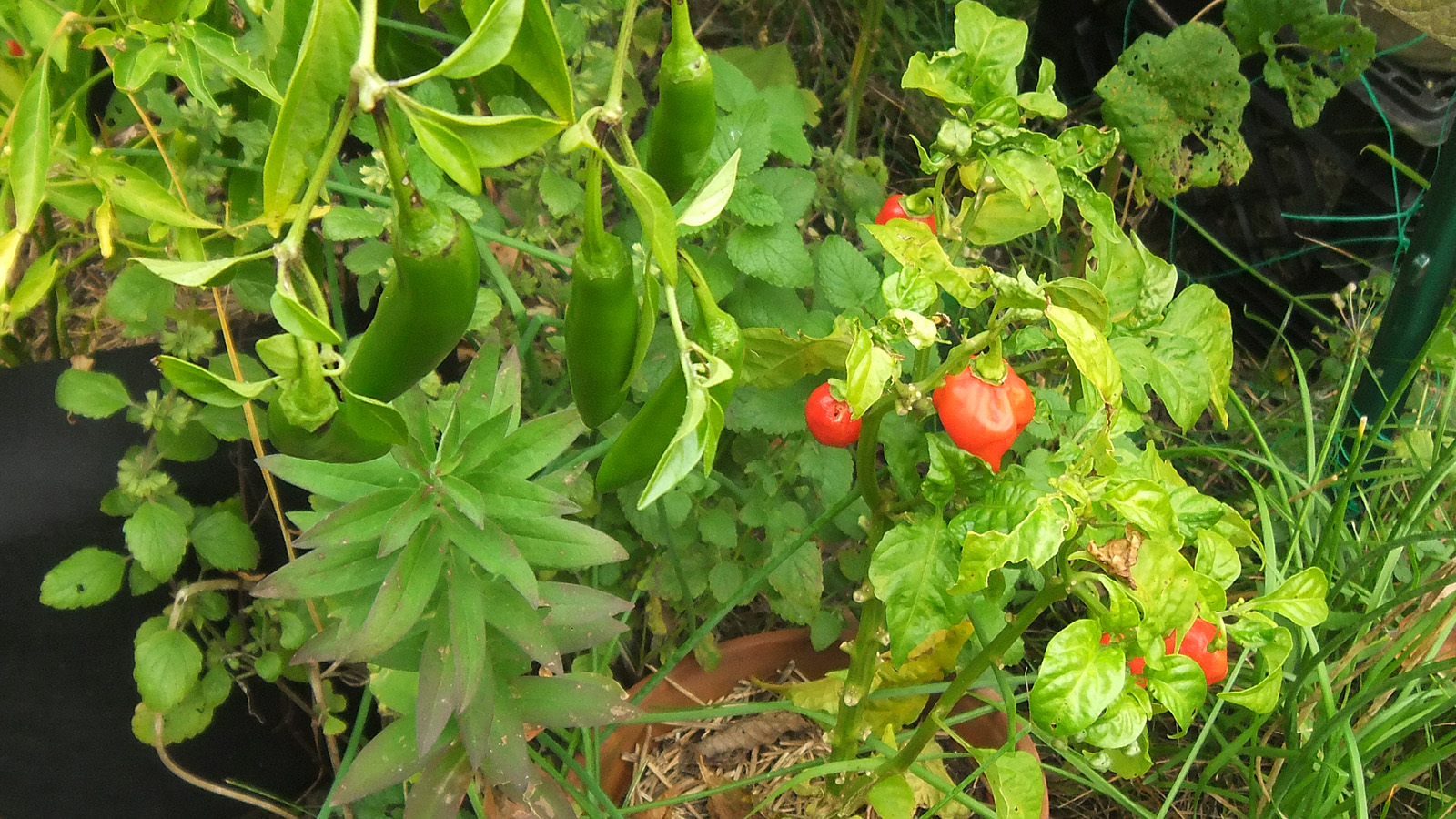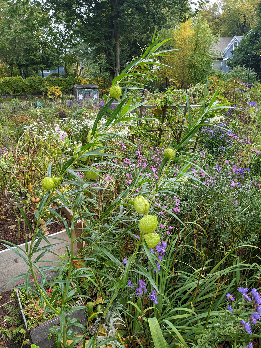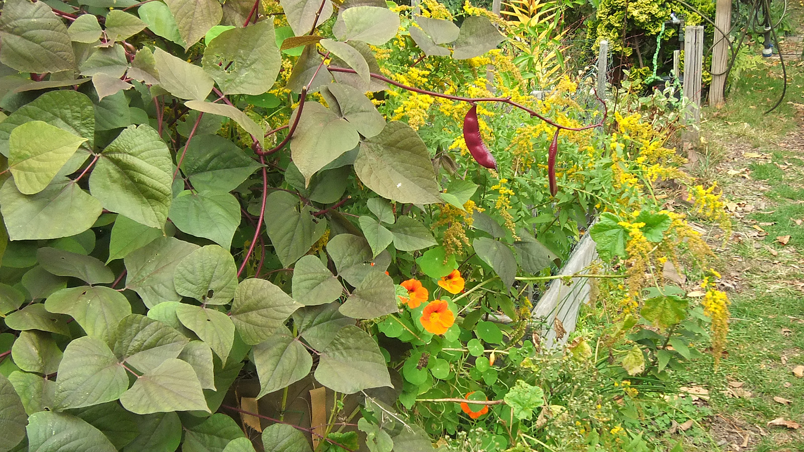 back at home, i walked down to the community garden to work on my plot. i got an e-mail from anne marie yesterday saying my garden was getting a little wild and suggested i trim it back from the paths. the last time i was there was 3 weeks ago. yes, my garden was a little crazy, but it wasn't that bad. i brought my 3D fuji camera to take some photos before starting to trim back the garlic chives and goldenrods, the main culprits. once that was done, i collected a few tomatoes and peppers (serrano and habaneros). there were tons of hyacinth beans but i wasn't in the mood to pick them, i'll do that some other time. besides, i felt some rain drops, and decided to head home before i got soaked.
