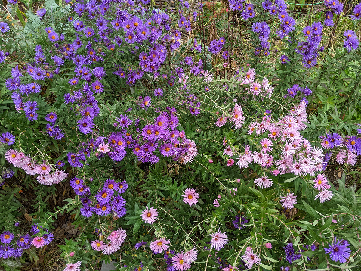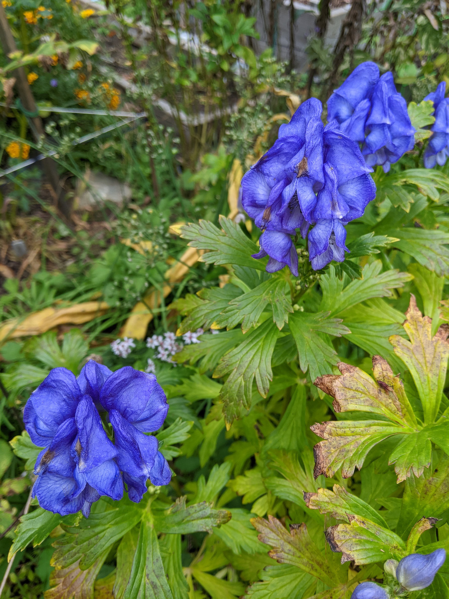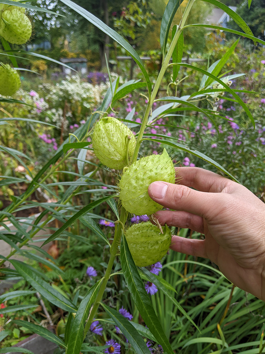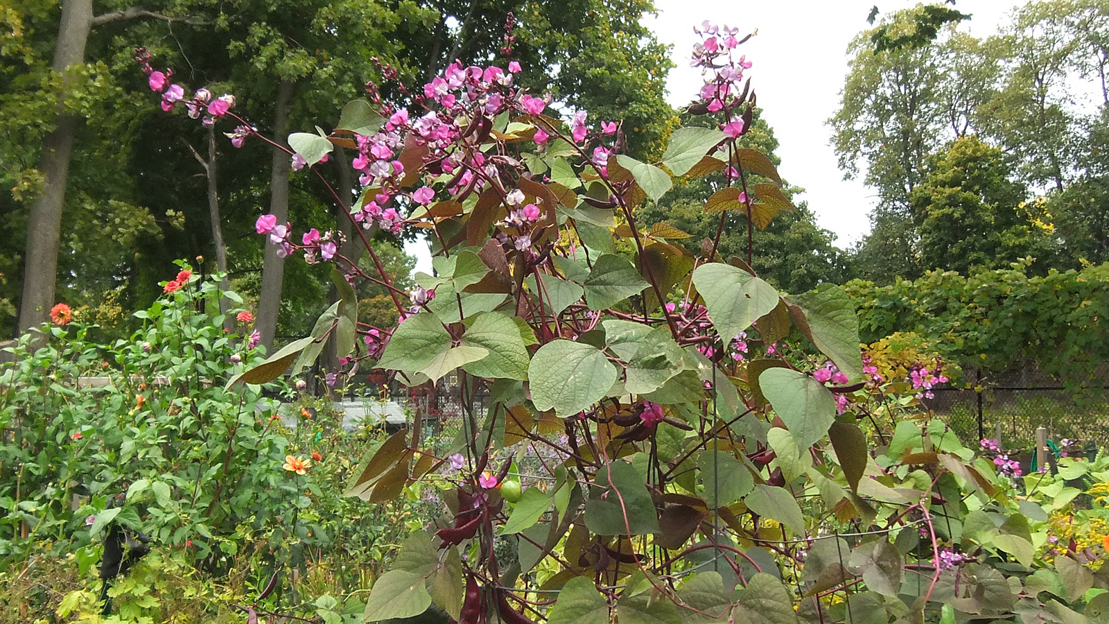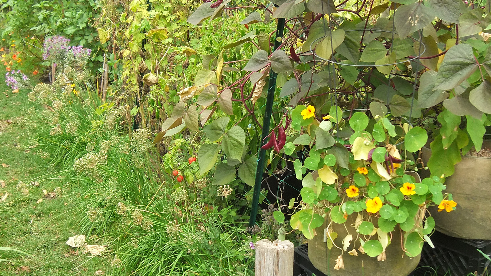 back at home, i walked down to the community garden to work on my plot. i got an e-mail from anne marie yesterday saying my garden was getting a little wild and suggested i trim it back from the paths. the last time i was there was 3 weeks ago. yes, my garden was a little crazy, but it wasn't that bad. i brought my 3D fuji camera to take some photos before starting to trim back the garlic chives and goldenrods, the main culprits. once that was done, i collected a few tomatoes and peppers (serrano and habaneros). there were tons of hyacinth beans but i wasn't in the mood to pick them, i'll do that some other time. besides, i felt some rain drops, and decided to head home before i got soaked.