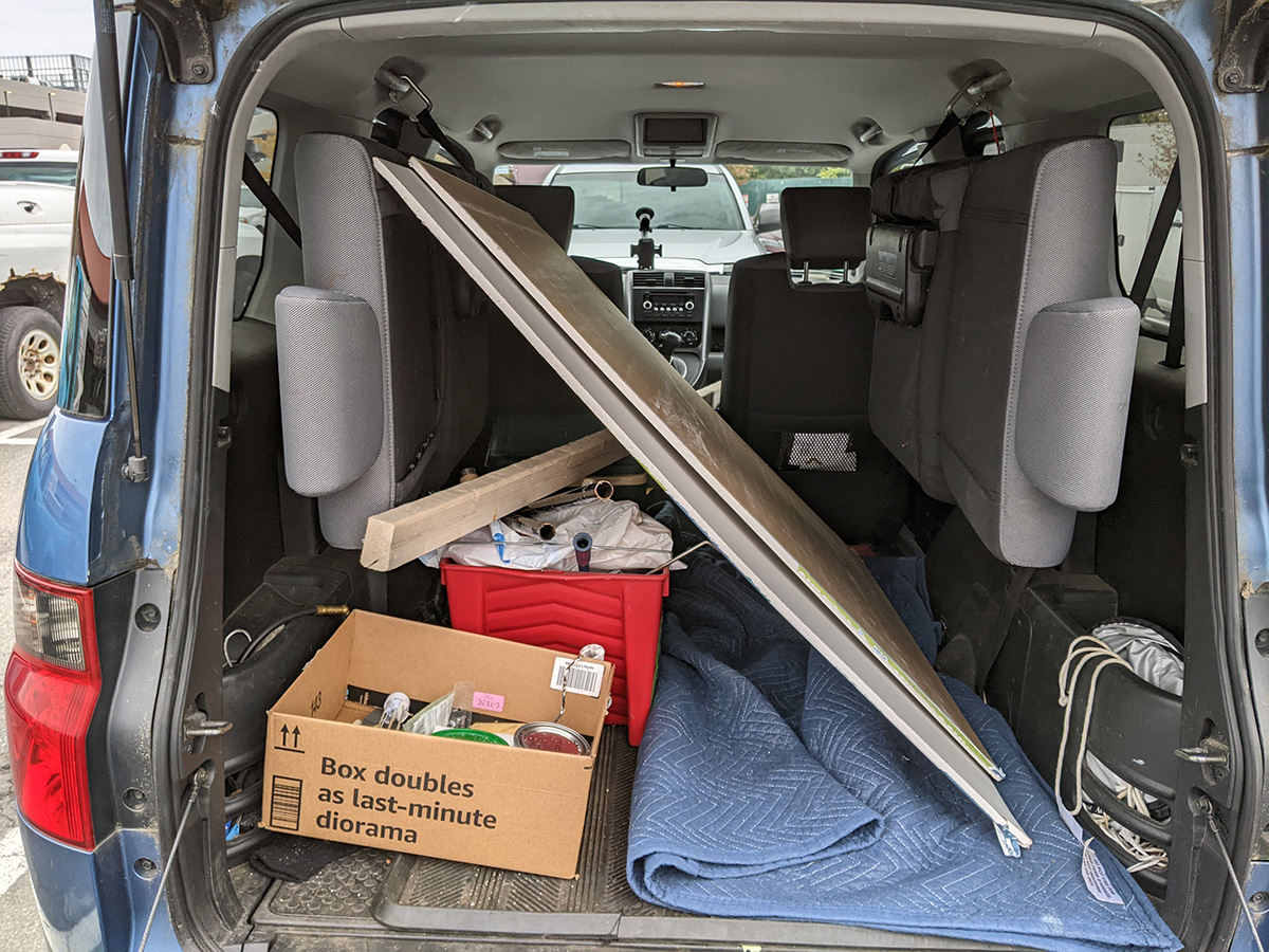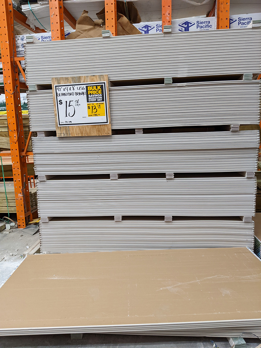 i needed to get a piece of sheetrock ($15.98 for 1/2"x4x8"). for some reason they were bundled together in pairs. i found a lumber associate to help me, the guy kind of looked like a stoner, he warned me he was new at the job but would try to help. apparently the sheets can be sold individually. my next problem was i couldn't fit the entire piece in the car and needed it to be cut to size. so this guy said he could score the middle with a boxcutter and folded the sheetrock in half. it was still large, but not so heavy i couldn't lift it on my own, and would now better fit inside the honda element.