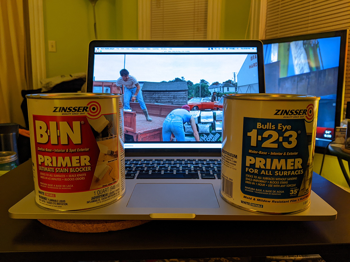i finally started with my bathroom work around 7:30pm. the only thing i could do today was prime the torn drywall paper. this was something i should've done a long time ago, before the drywall managed to soak up a year's worth of bathroom moisture. originally it was going to be a quick and easy task, but while i was cleaning the wall, i noticed chunks of it was already peeling, so i ended up ripping off more painted surfaces from the wall. i used the zinsser 123 primer with a nylon brush, decided to return the BIN primer (specially since it costs nearly $24 for a little can). i finally finished priming the exposed areas an hour later.