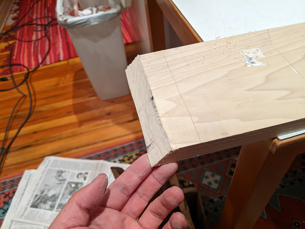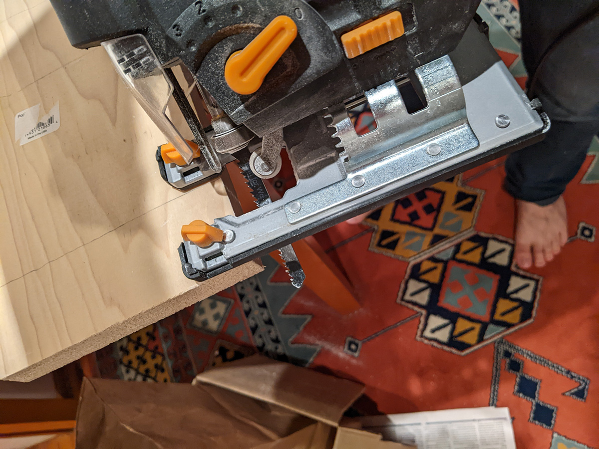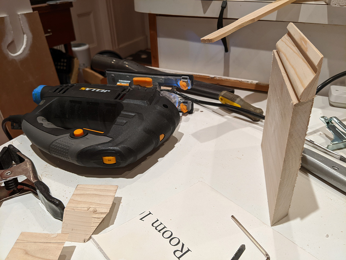 making the baseboard cutout was more challenging. there was the material consideration: the poplar baseboard is not only a harder material but thicker too. the only saving grace is the cutout portions themselves are relatively straight-lined with some slight curves. the second challenge was cutting a 45° bevel for where the corners meet.