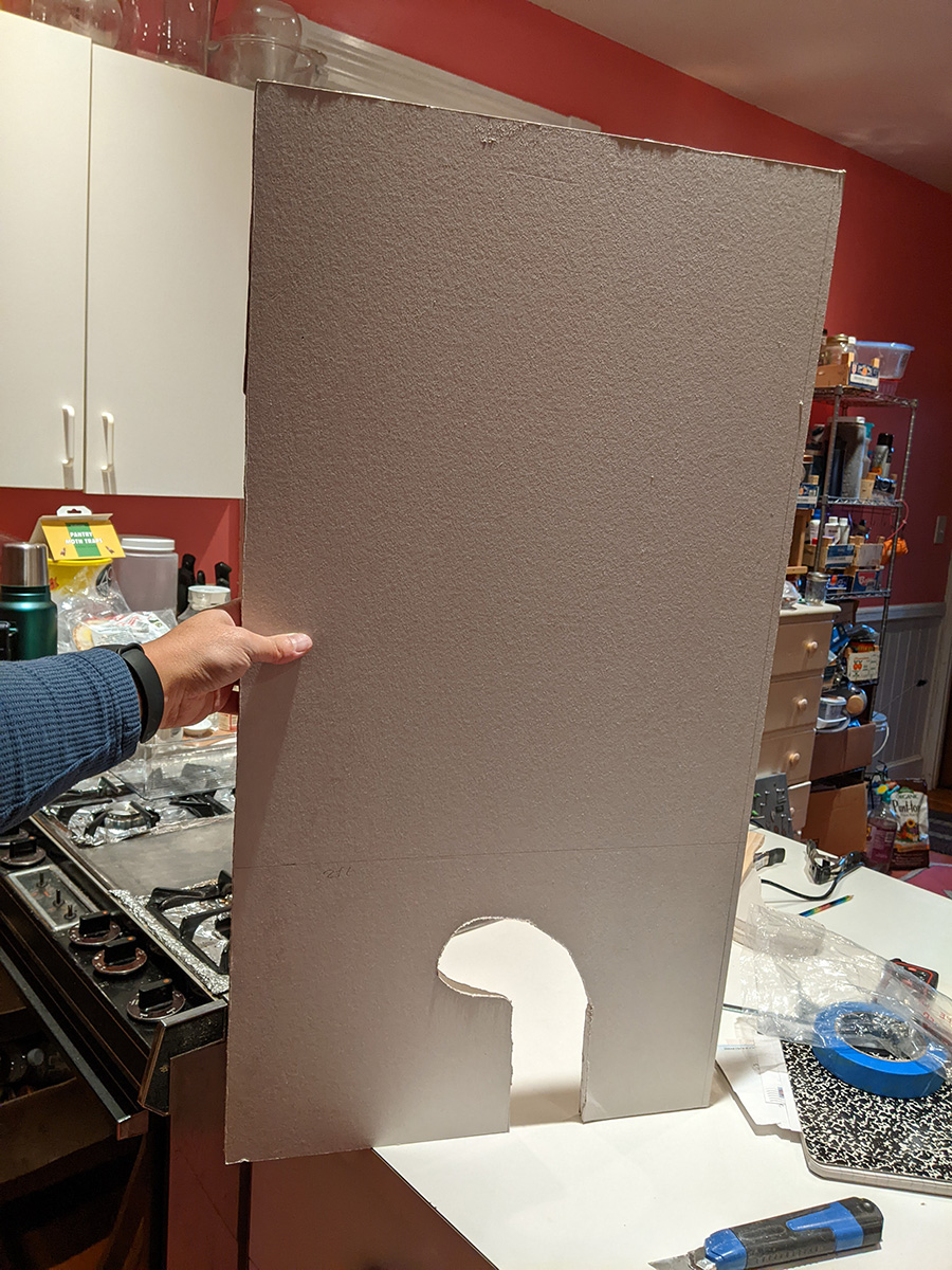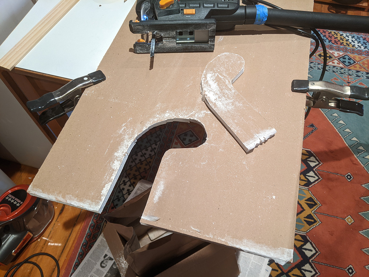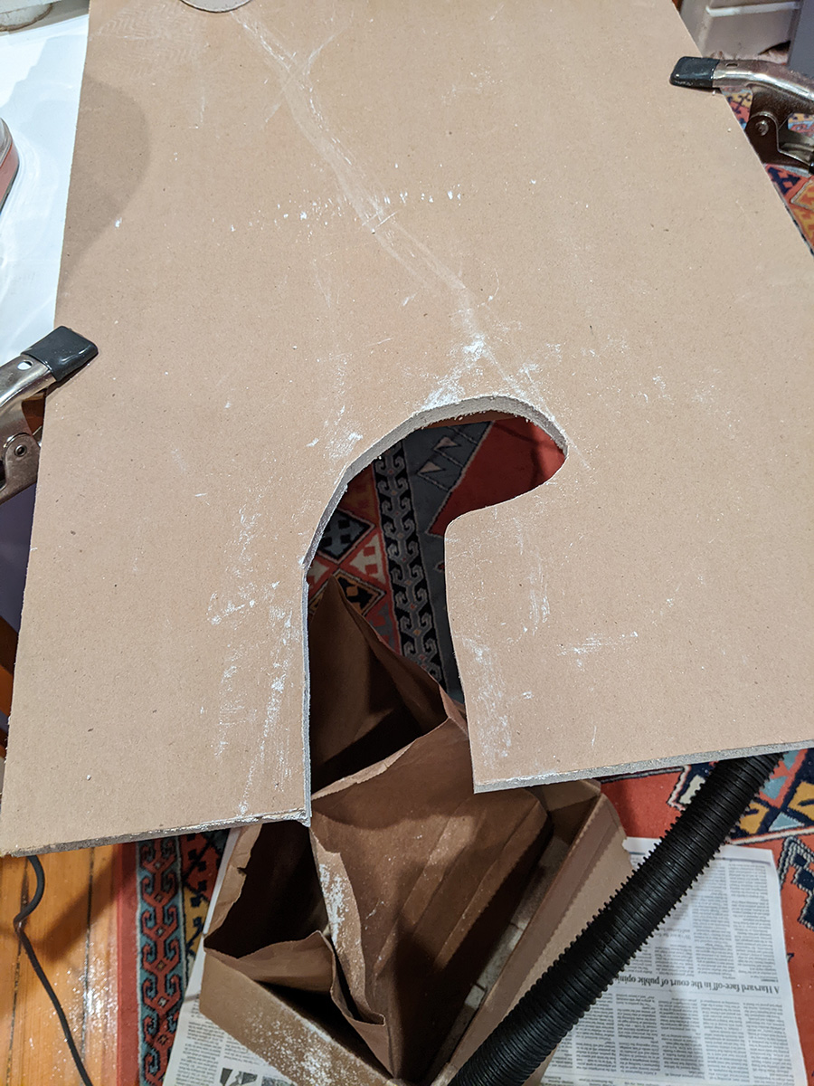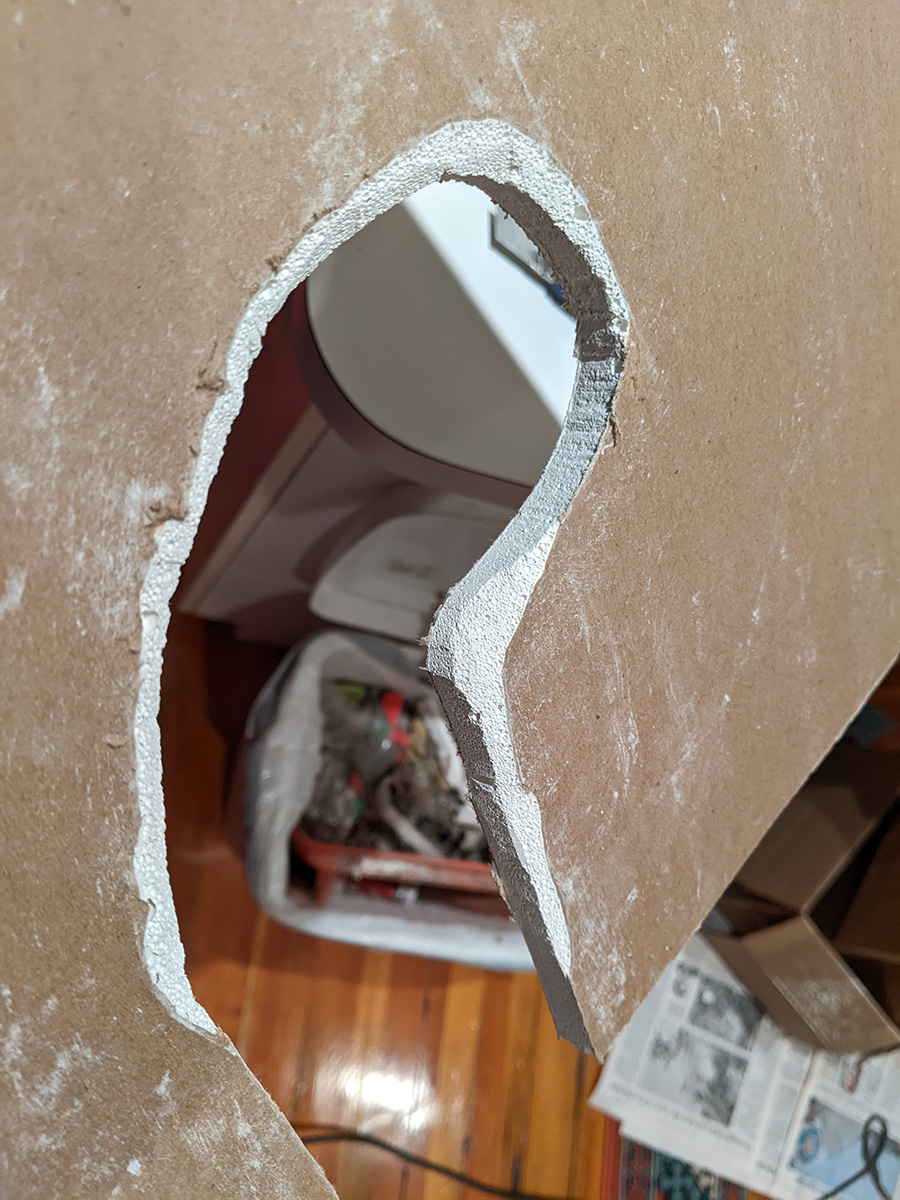 i figured it'd take a few cutout attempts before i got the right shape, for the first pass, i wasn't too worried about getting it exactly right. it was my first time using the jigsaw on drywall, i didn't think i'd get it perfect on my first try. when i went to see if the cutout drywall would fit, there were all sorts of issues. for one thing, my original template was relatively flat, so i didn't have to take the thickness of material into consideration. drywall is different, much thicker. second issue was with my original template i was able to insert the poster board inside of the wall; i couldn't do it with the drywall, so my measurements were off.