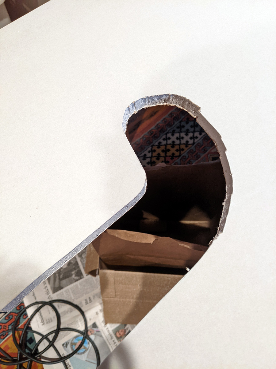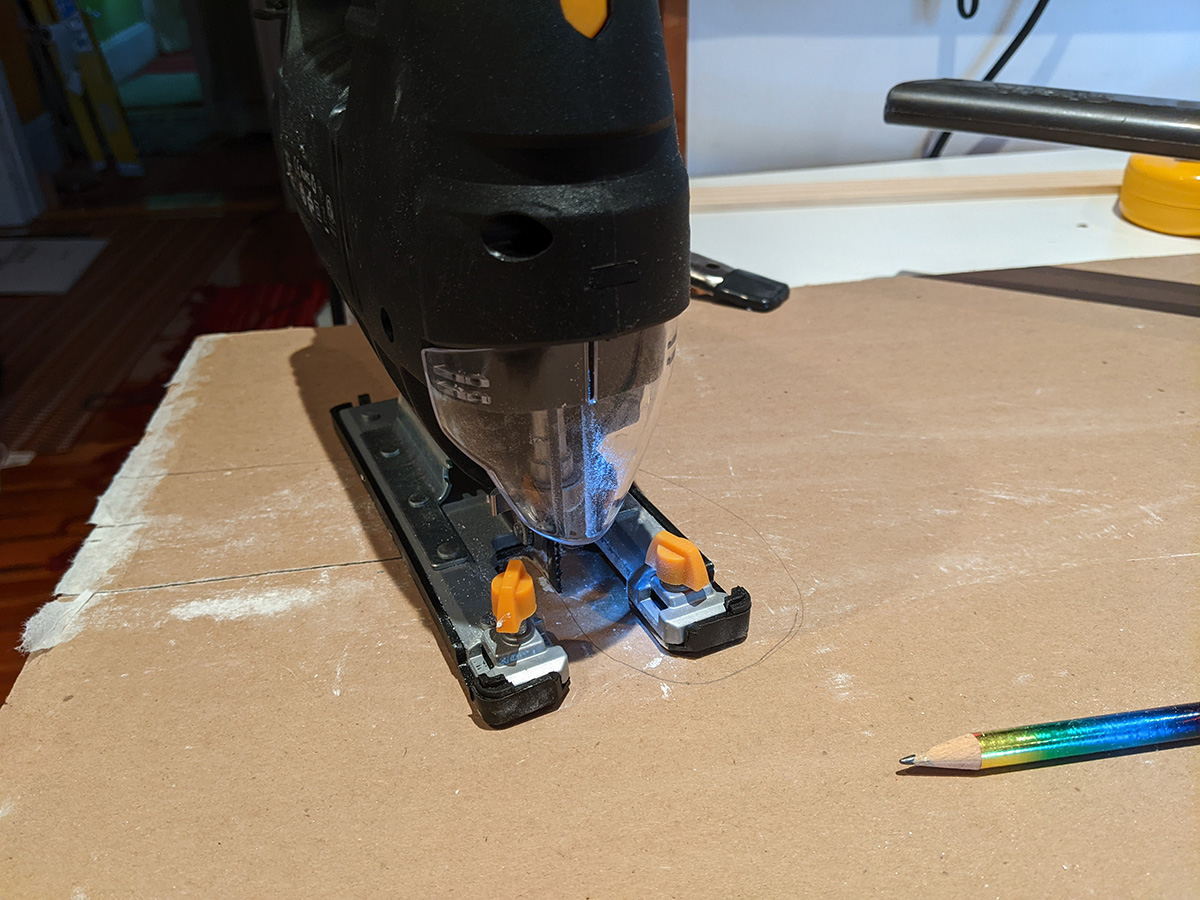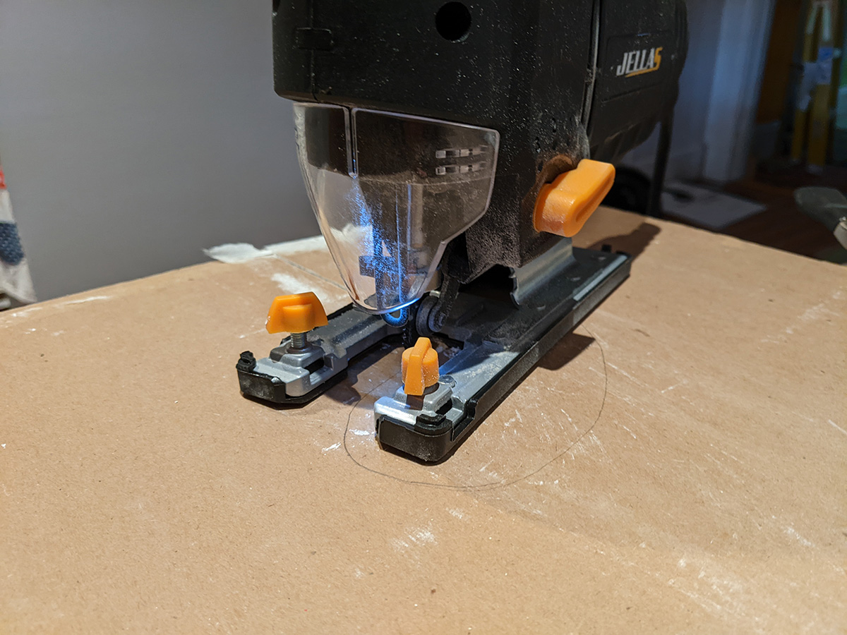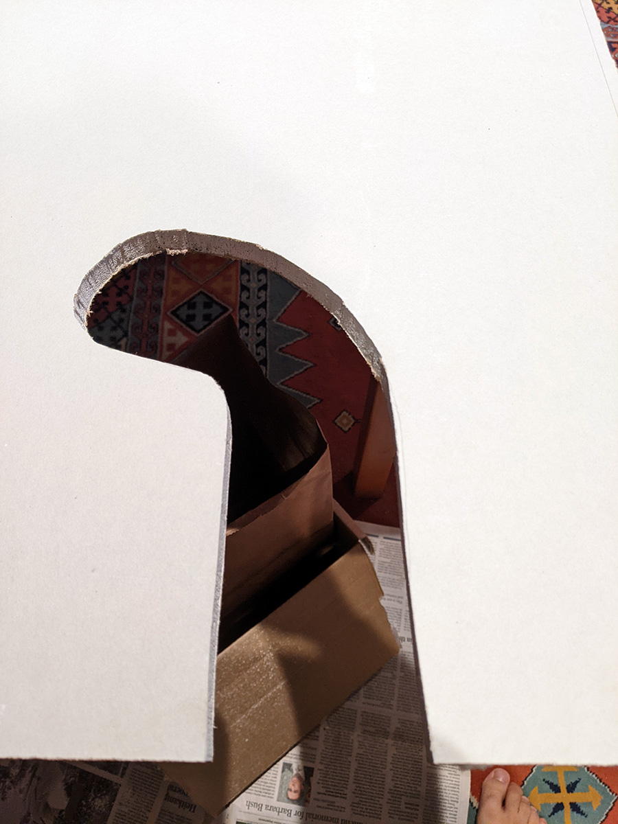 i figured it'd take a few cutout attempts before i got the right shape, for the first pass, i wasn't too worried about getting it exactly right. it was my first time using the jigsaw on drywall, i didn't think i'd get it perfect on my first try. when i went to see if the cutout drywall would fit, there were all sorts of issues. for one thing, my original template was relatively flat, so i didn't have to take the thickness of material into consideration. drywall is different, much thicker. second issue was with my original template i was able to insert the poster board inside of the wall; i couldn't do it with the drywall, so my measurements were off.