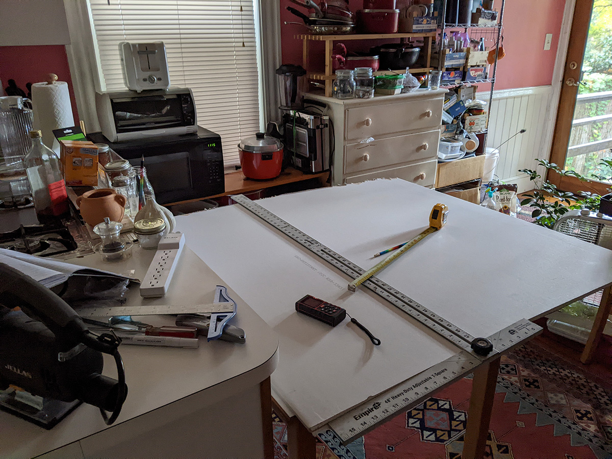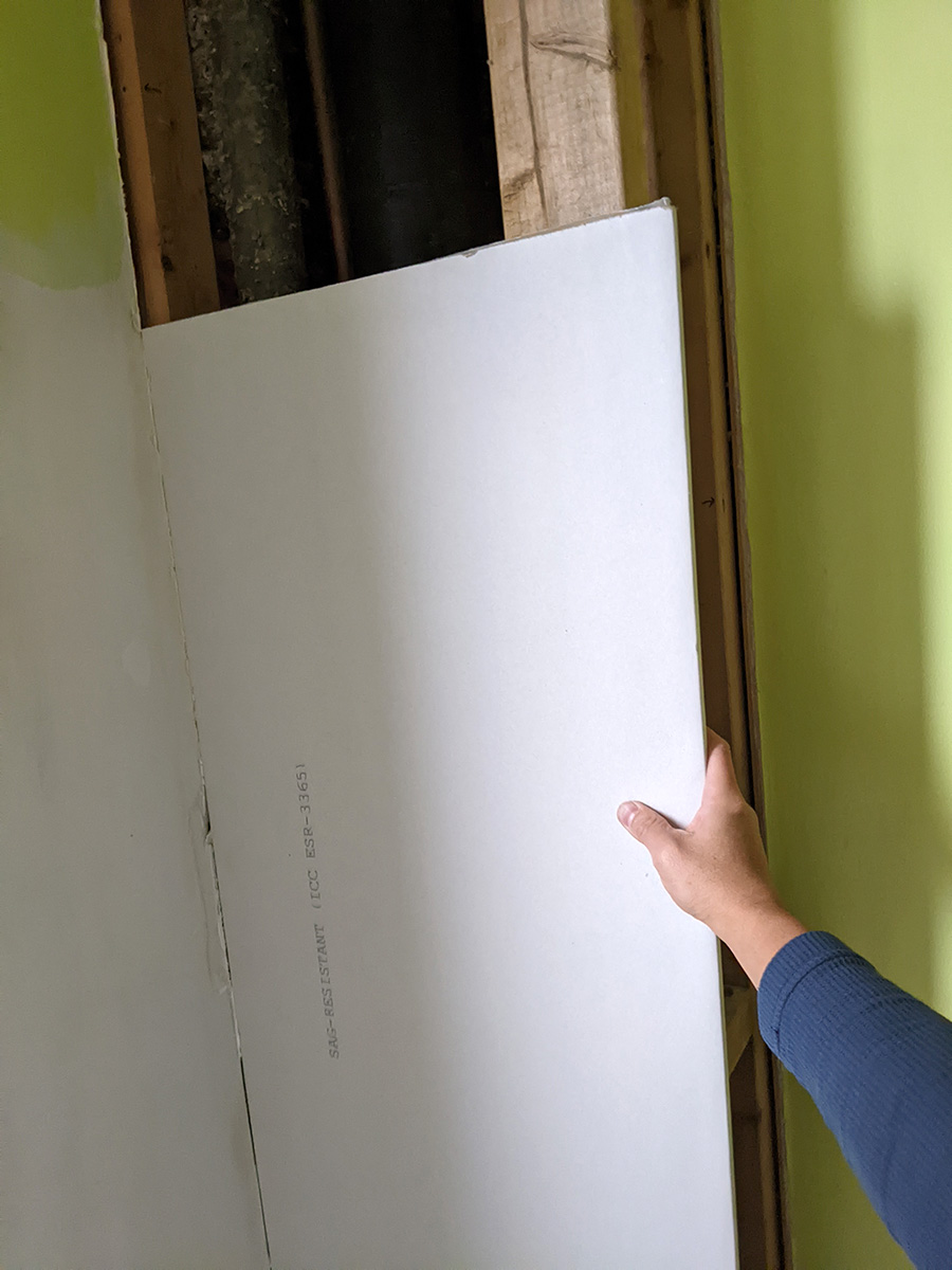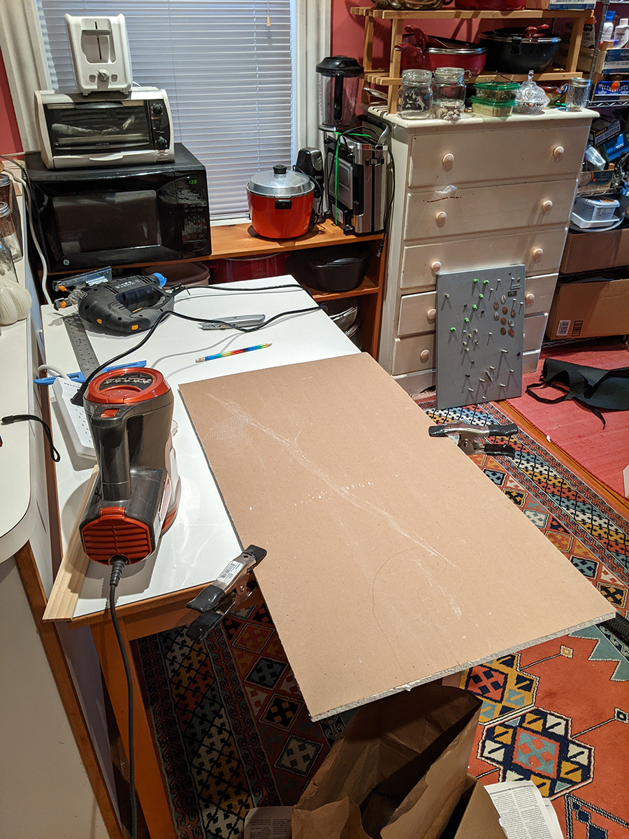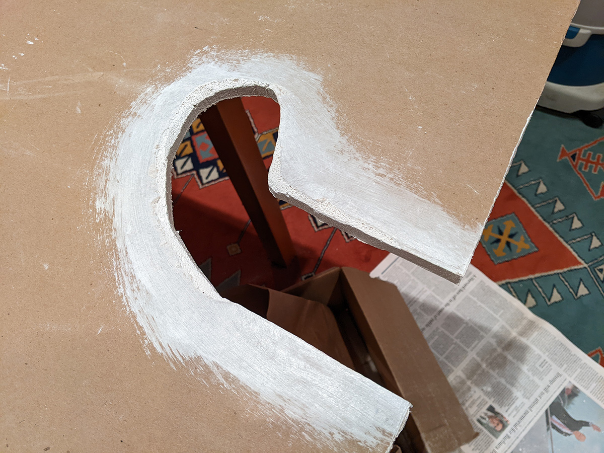 i figured it'd take a few cutout attempts before i got the right shape, for the first pass, i wasn't too worried about getting it exactly right. it was my first time using the jigsaw on drywall, i didn't think i'd get it perfect on my first try. when i went to see if the cutout drywall would fit, there were all sorts of issues. for one thing, my original template was relatively flat, so i didn't have to take the thickness of material into consideration. drywall is different, much thicker. second issue was with my original template i was able to insert the poster board inside of the wall; i couldn't do it with the drywall, so my measurements were off.