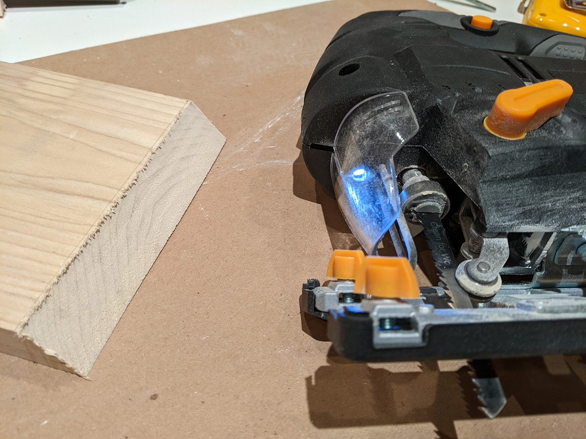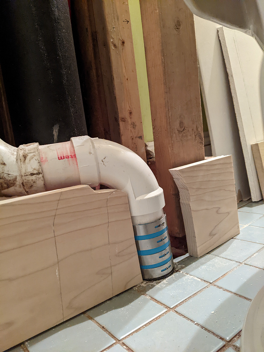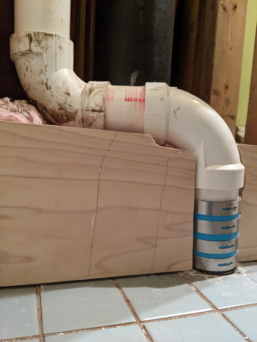 i started by making the bevel cut, since it was the hardest part. if i could just do this, everything else would be easy. first try, i got it close to perfect. the trick was changing the jigsaw blade to an all purpose wood blade and going relatively slow. the rest was easy, i even redid the other part of the baseboard (wall to pipe) to improve on the first version.