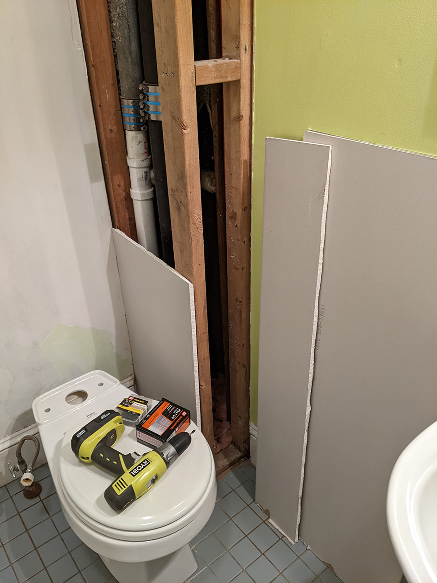 next i started breaking apart the piece of 4x8 ft drywall. something that i didn't realize until my father brought it to my attention (and that the home depot guy demonstrated to me when he split the original full-sized drywall in half) is that drywall can be easily split apart using nothing more than a utility knife. score the drywall with the knife and then crack it at the seam. of course a ruler is super useful as well for scoring straight lines and measuring, but really, all you need is a knife. for some reason i thought i'd have to cut all the drywall pieces with the jigsaw tool. the hardest part though is to get the correct measurements. it didn't help that my bathroom pipe boxing has different dimensions depending on whether you're near the floor or the ceiling. but i cut up long pieces of drywall for the two sides of the boxing and another piece that would be for the piping cutout.