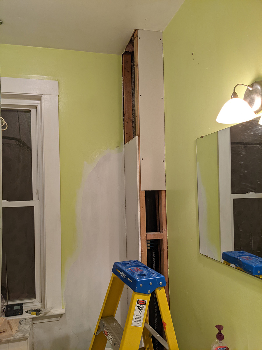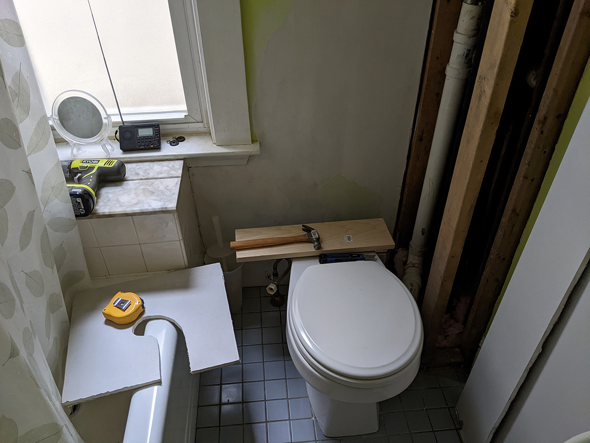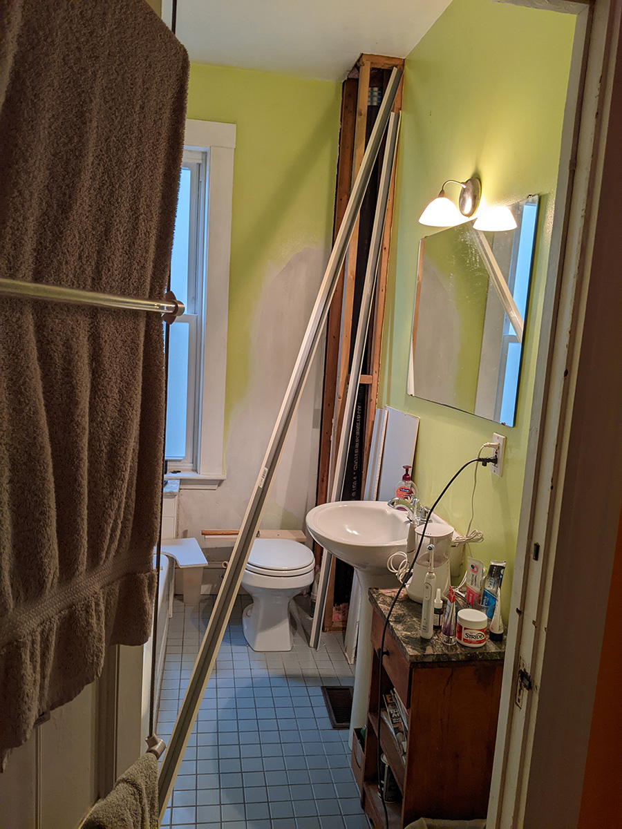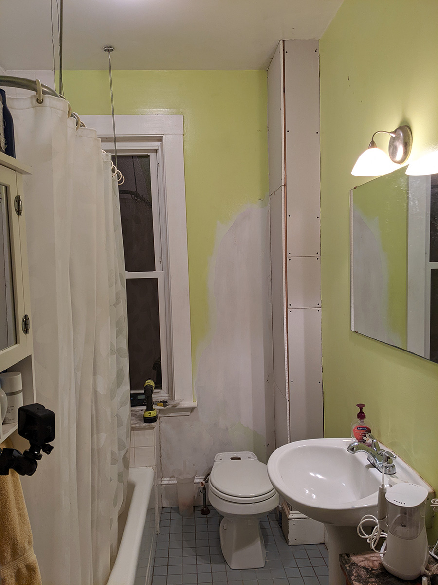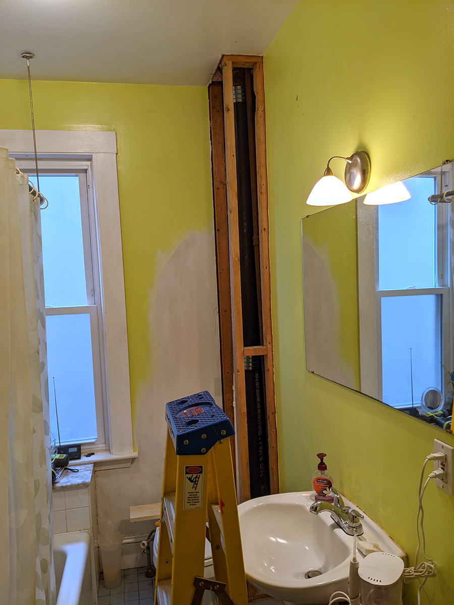 the 9ft long 2x4 that i nailed to the bathroom friday night? my little kickoff renovation? well, turns out the wooden beam had enough twisting warping that i needed to realign it. that was the first thing i had to do. it actually took longer than you'd imagine, and i didn't finish realigning the beam until almost 11am.