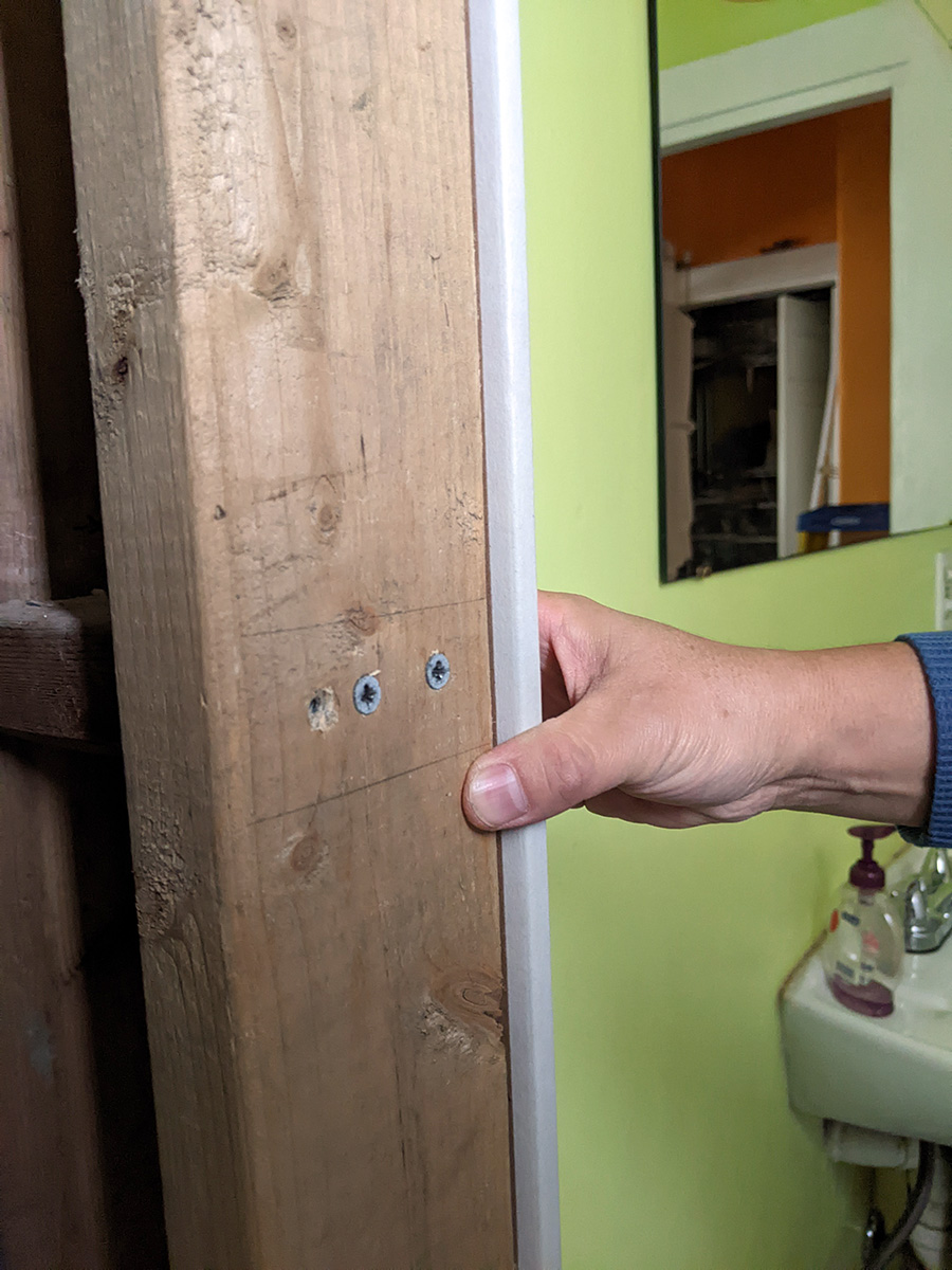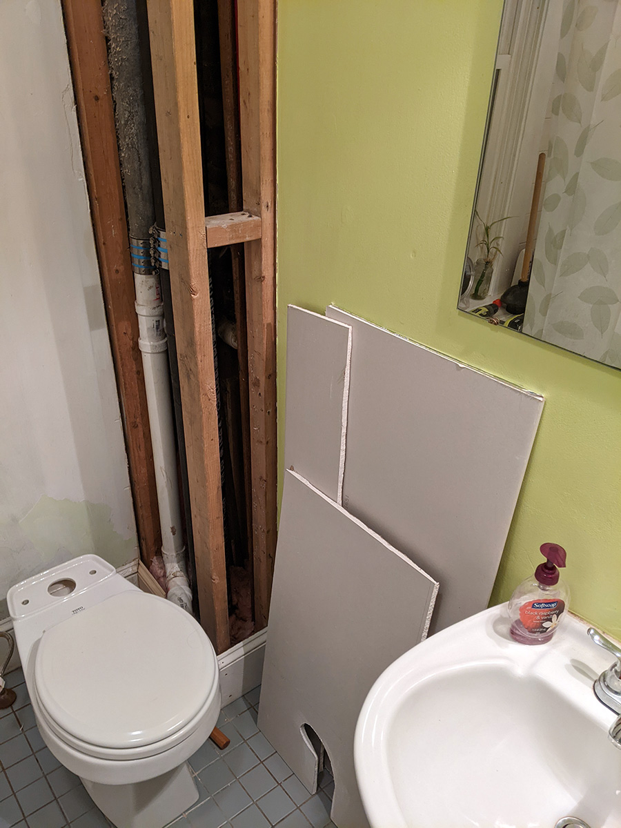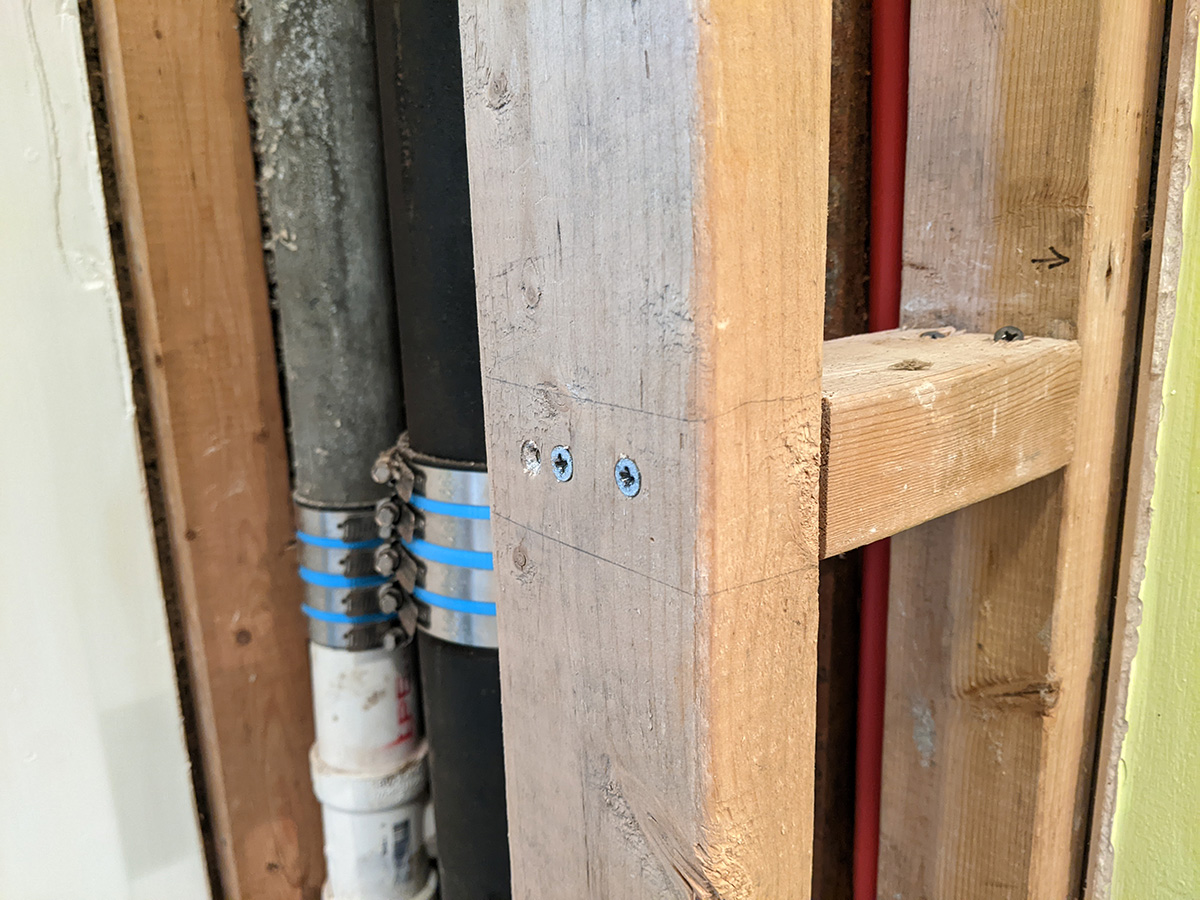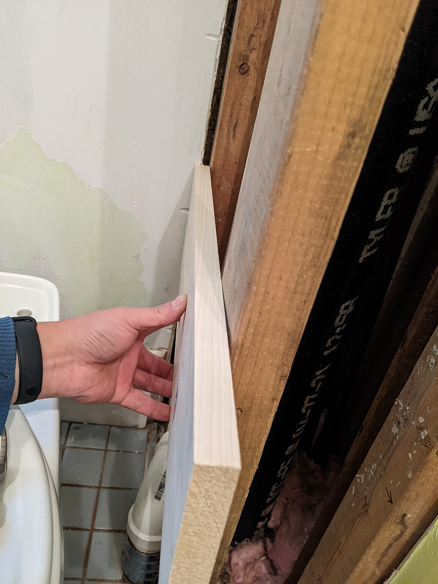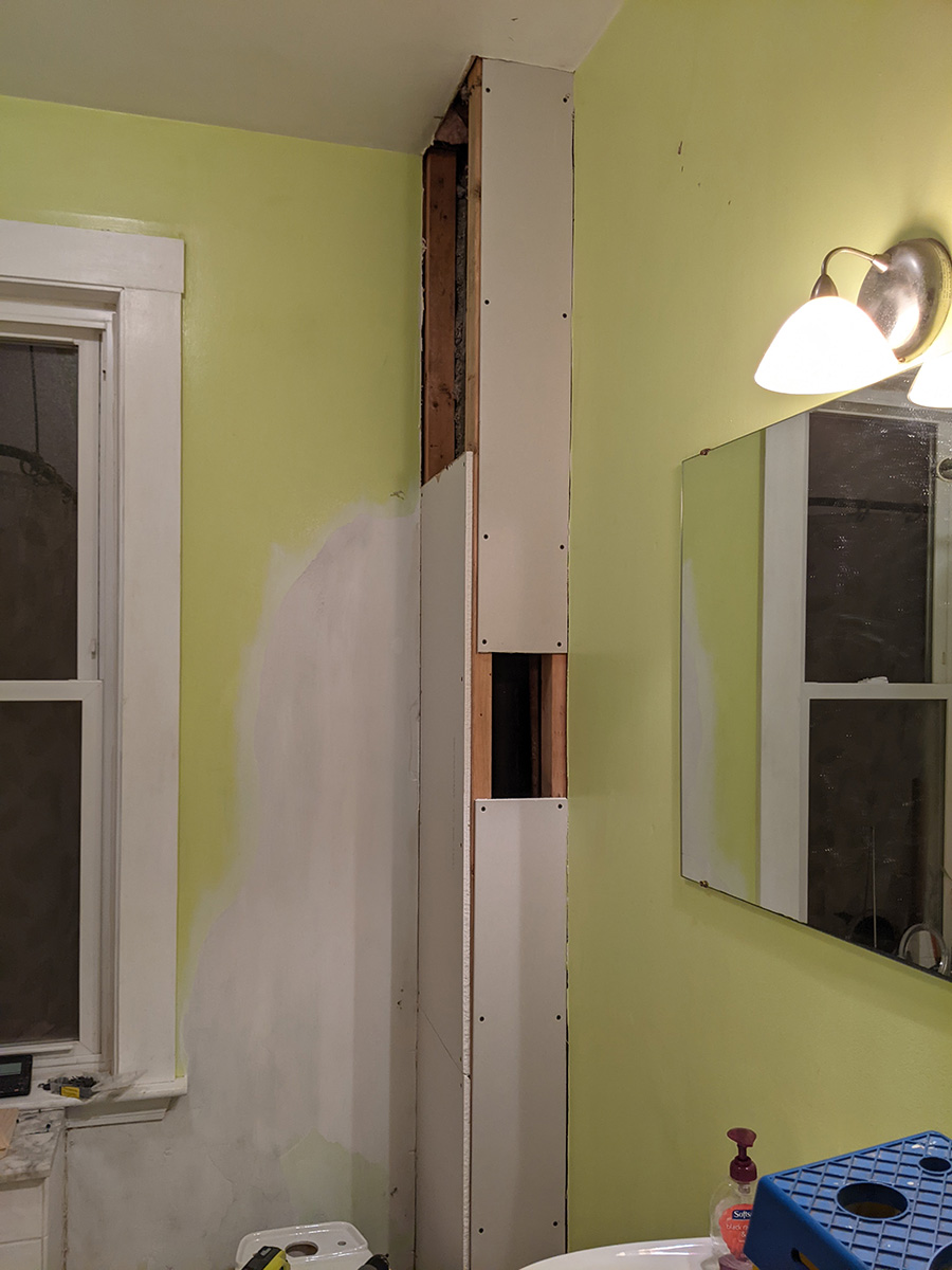 the 9ft long 2x4 that i nailed to the bathroom friday night? my little kickoff renovation? well, turns out the wooden beam had enough twisting warping that i needed to realign it. that was the first thing i had to do. it actually took longer than you'd imagine, and i didn't finish realigning the beam until almost 11am.