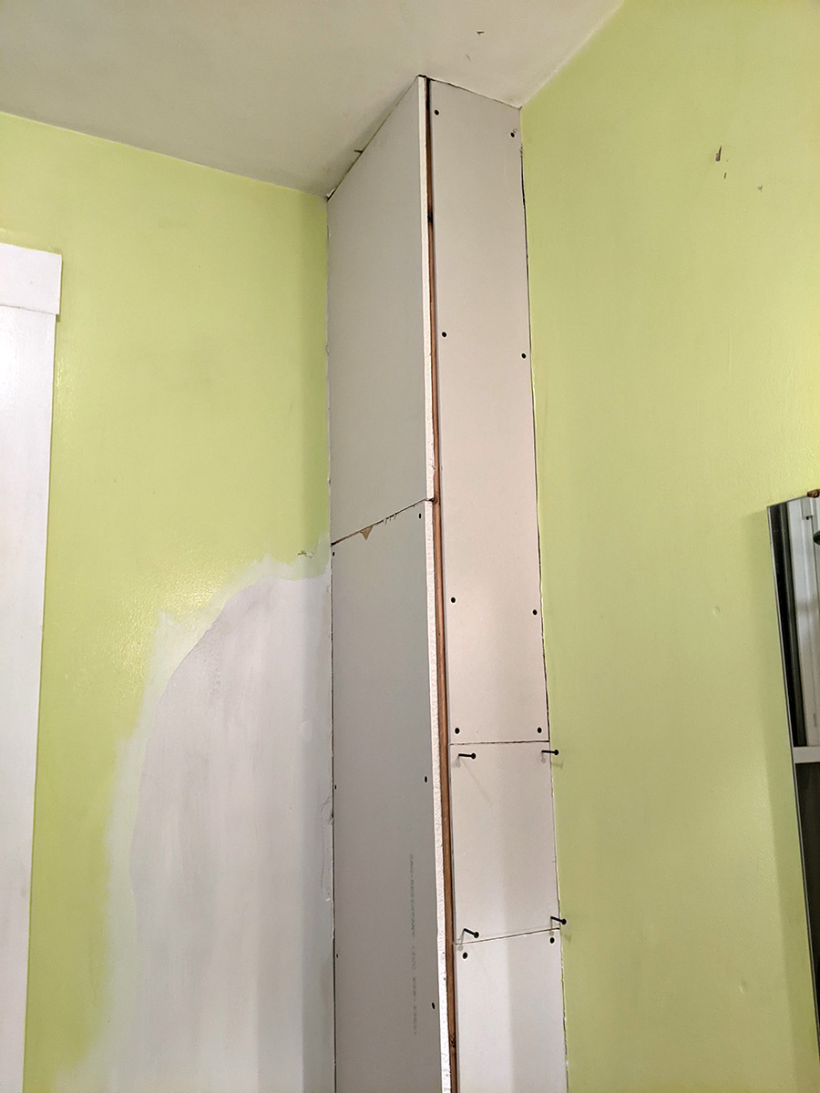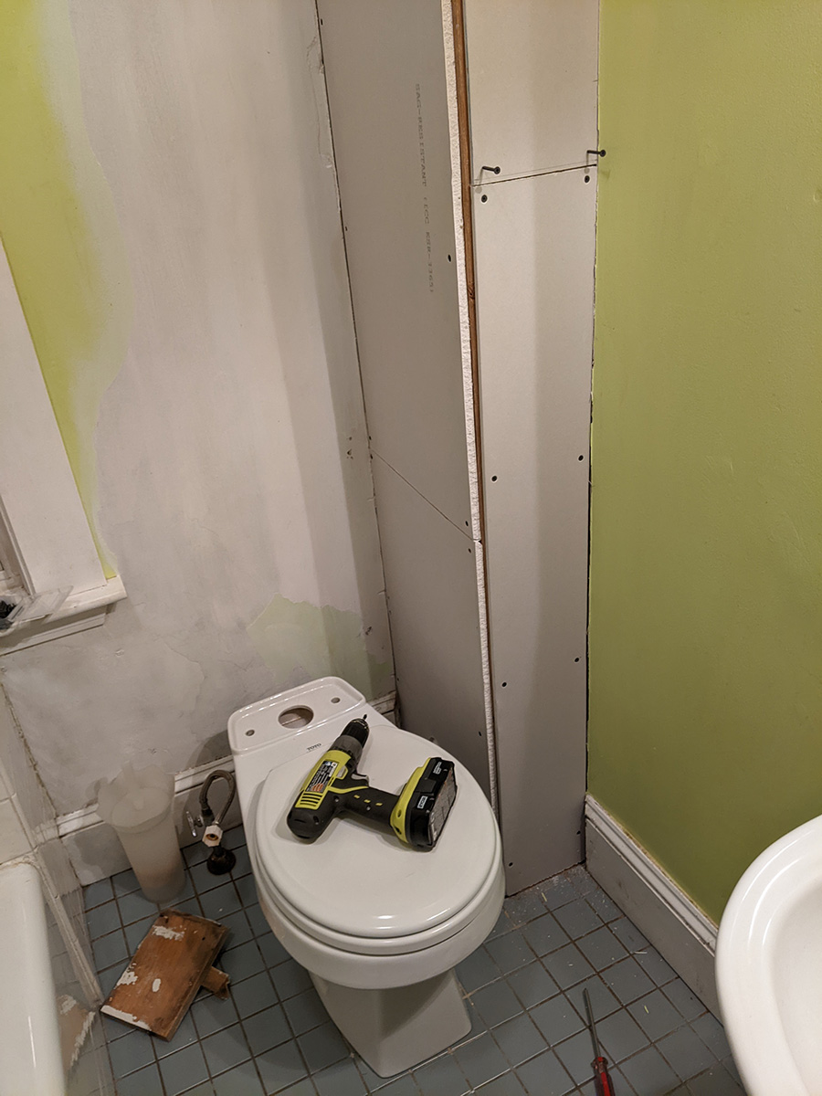 starting at 10pm i started covering up the pipe boxing with slabs of precut drywall. not sure what was louder: cutting material in my kitchen with the jigsaw or drilling screws into the drywall/lumber. the screws would dig into the wood, vibrating the whole house it seems. i thought about telling my upstairs neigbors but it was already late, and i figured the quicker i work, the quicker i get it all done. even this portion of the project - which seems like it'd be easy - had it's challenges. screws along the outer corner were easy to secure, but the ones up against the walls required screwing into the wood at an angle. often times the screws didn't like that, and wouldn't go all the way in. it also took me a while to figure out the settings on the cordless drill, and the proper technique to attach a screw (steady drive, some inward pressure).
