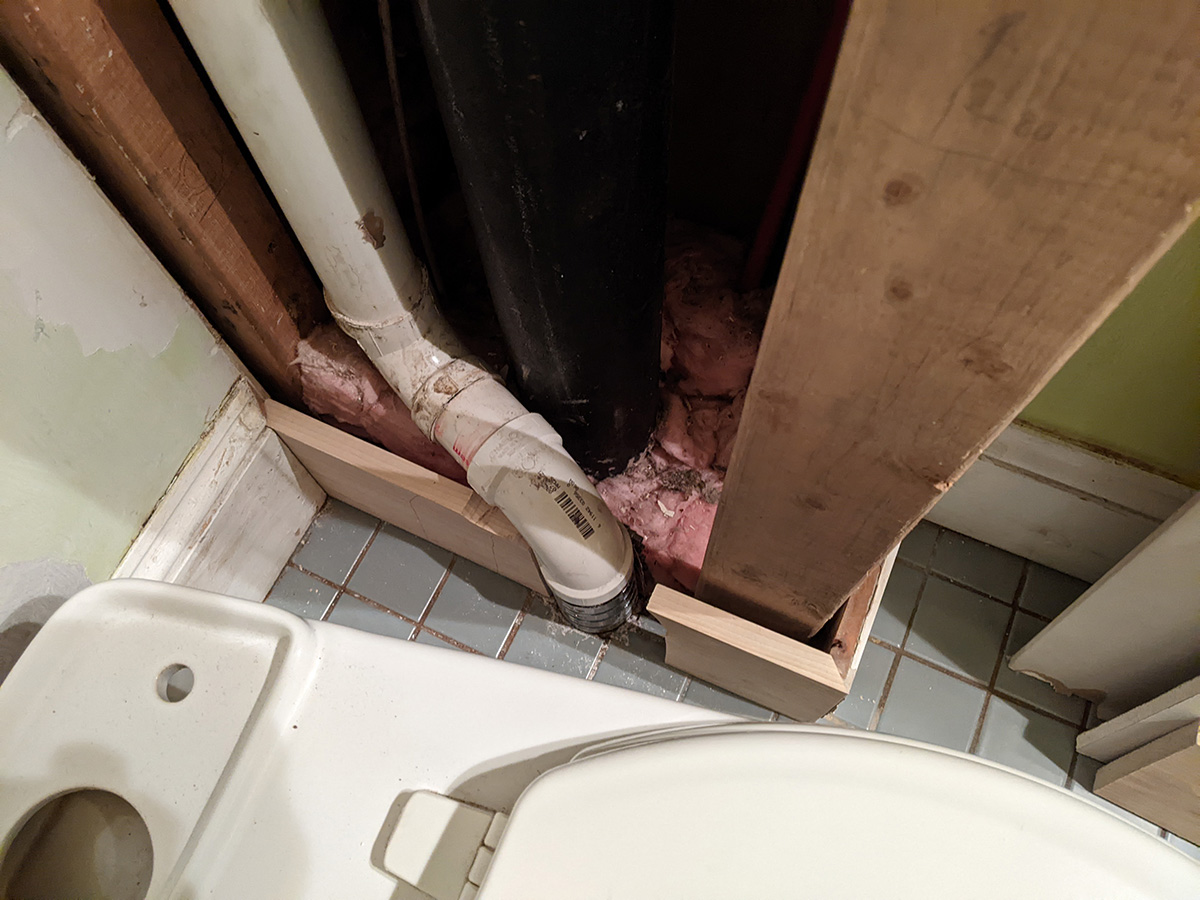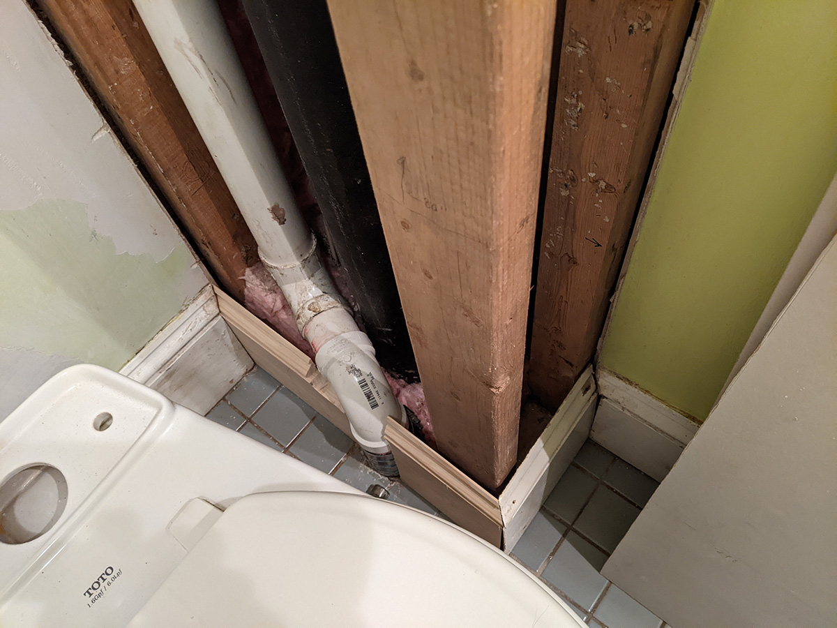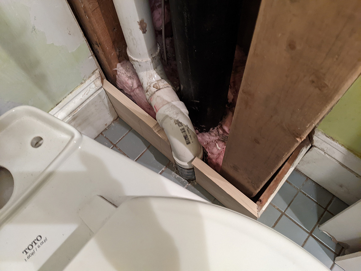 the first half of the baseboard - from the wall to the pipe - i managed to cut that without issues. the second half of the basement - from pipe to the outer wall corner - that was more challenging, and required the dreaded bevel cut. my first attempt was good, but it was just a test, and i trimmed it off in order for the real piece. maybe it was performance anxiety, but my first real attempt was skewed, and wasn't good at all. i tried following my pencil line, by i ended up cutting diagonally. my second attempt wasn't straight either (failed to follow the pencil line), and there was also a curve to the bevel. i tried to make it flat by sanding, but no matter how much i sanded, i couldn't flatten it down. so i decided to do a 3rd bevel cut. this was make or break, since i was running out of poplar. having cut the bevel already 3 times, i had enough practice. this 3rd real attempt i cut it close to perfect. proud of myself, i cut the wood on the other end and took it to the bathroom. my eyes flickered for a slight second as i realized i cut it too short.