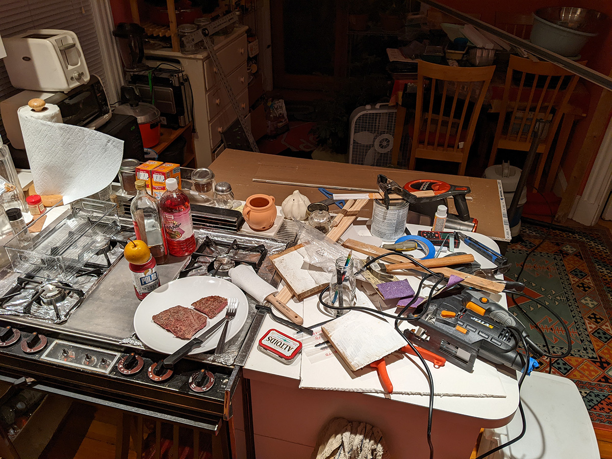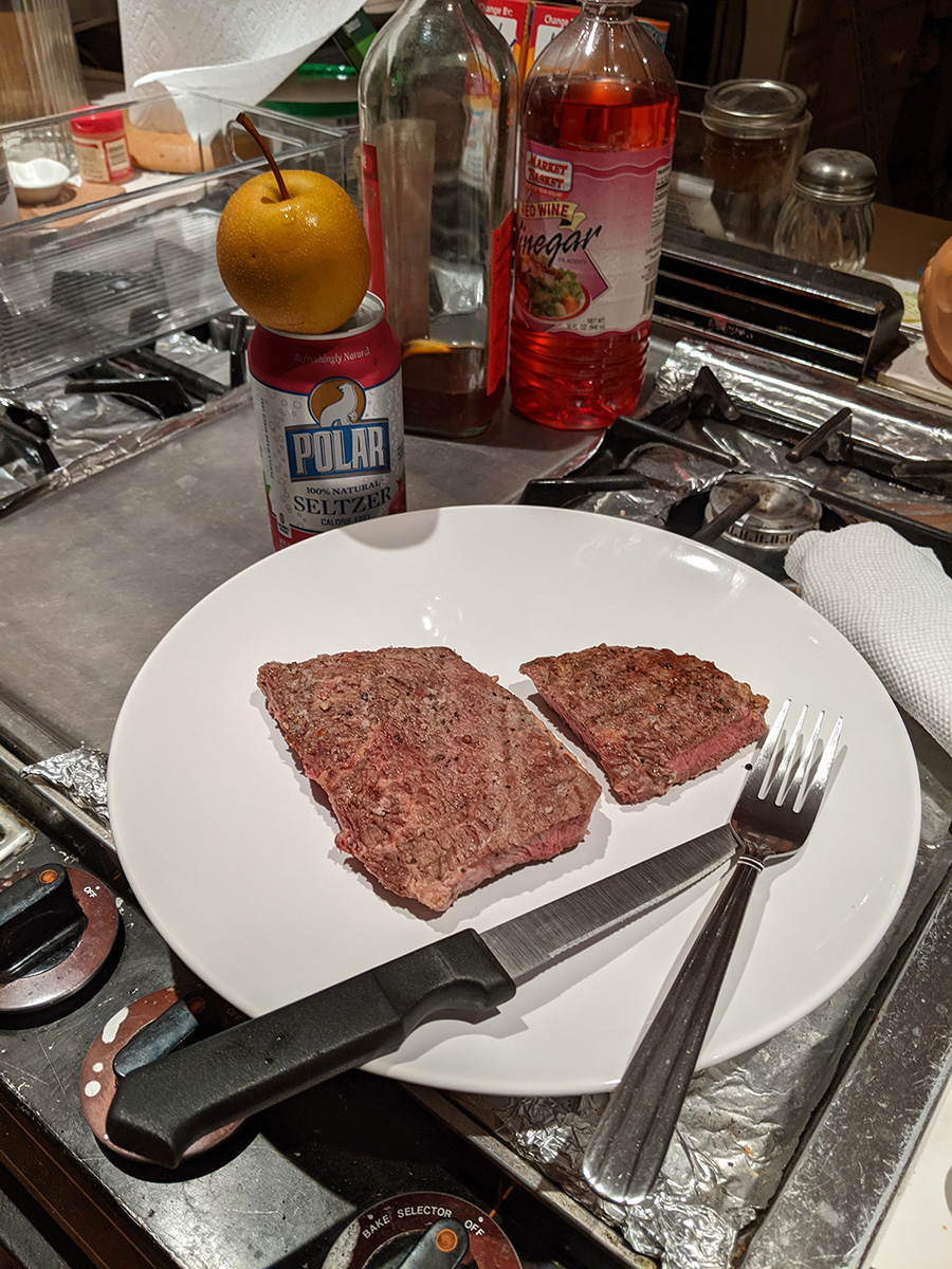 i finally had all the drywall pieces screwed into place (including the cutout) by 12:30am. i was in daze but relieved to be done with the hardest part of the project. i went to the kitchen to look for something to eat. i remembered my parents giving me some leftover steaks from last night, so i ate them cold while watching tv in the living room.