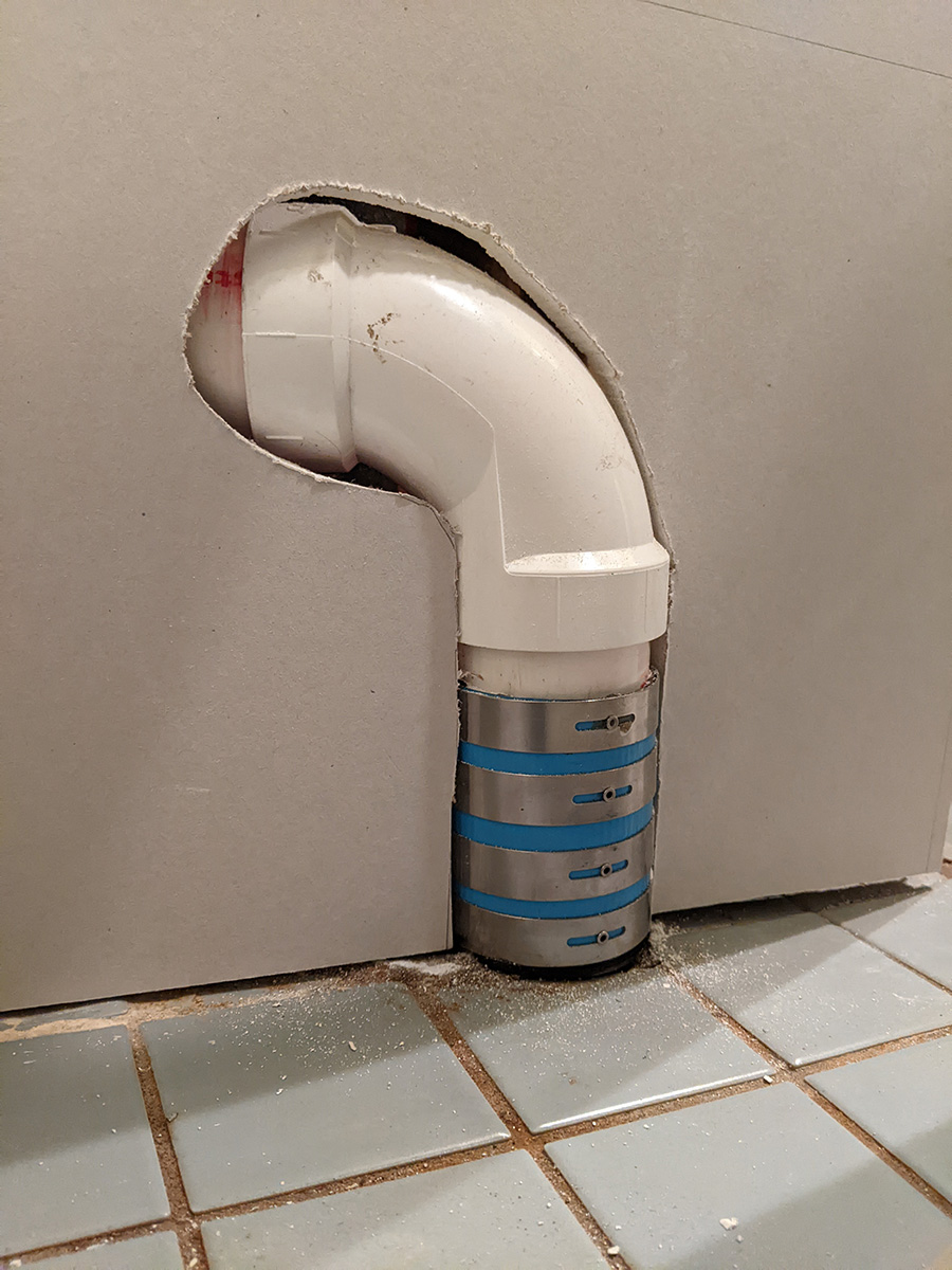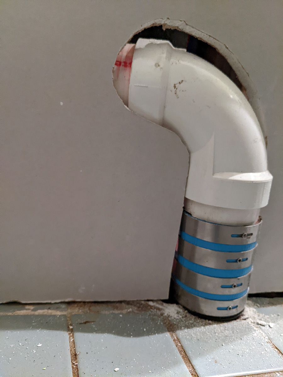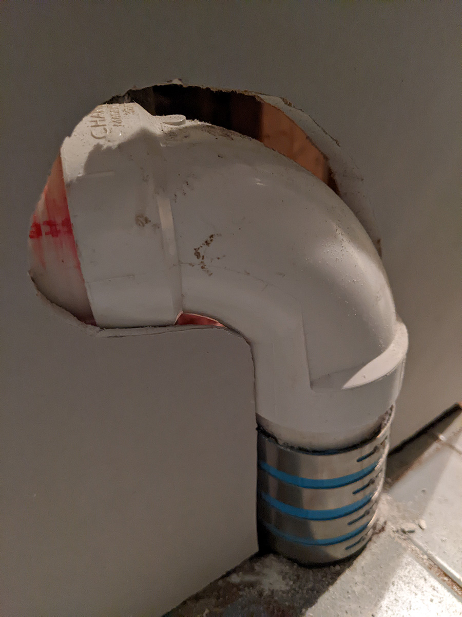 i went ahead for a 2nd attempt at making the cutout with another piece of drywall. i had enough to make 3 attempts before i needed to start worrying if i have enough drywall material to cover everything. the 2nd try worked better. i had the measurements right, and i managed to fit it in place after shaving the back of the drywall material to match the contours of the ventilation pipe. i had a pretty good cutout, something that i could live with. by that point it was abut 1:30pm.