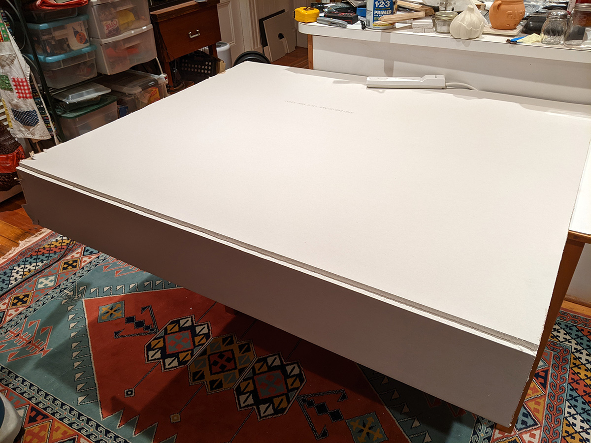 the 2nd drywall cutout was okay, but since i had a spare drywall piece leftover, i wanted to improve on my 3rd attempt, make it even better. so i got to cutting with the jigsaw, and had a new drywall cutout by 5pm that was the best yet. instead of installing it right away, i decided to prime the exposed areas of the cutout, to prevent future moisture from seeping into the material. i left it to dry while i tackled the next item on my list: cutting the cutout from the wooden baseboard.