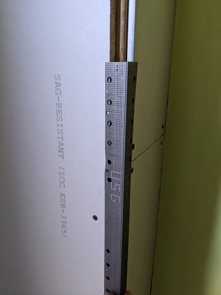once that was done (5:30pm) i took a break. next step was papering the inner corners and applying the corner bead on the out corner. but before i could do that, there was a large gouge in the drywall near an inside corner that needed to be patched before i could do any papering. so i decided to do that (6:50pm) first, as well as patch any screw holes.