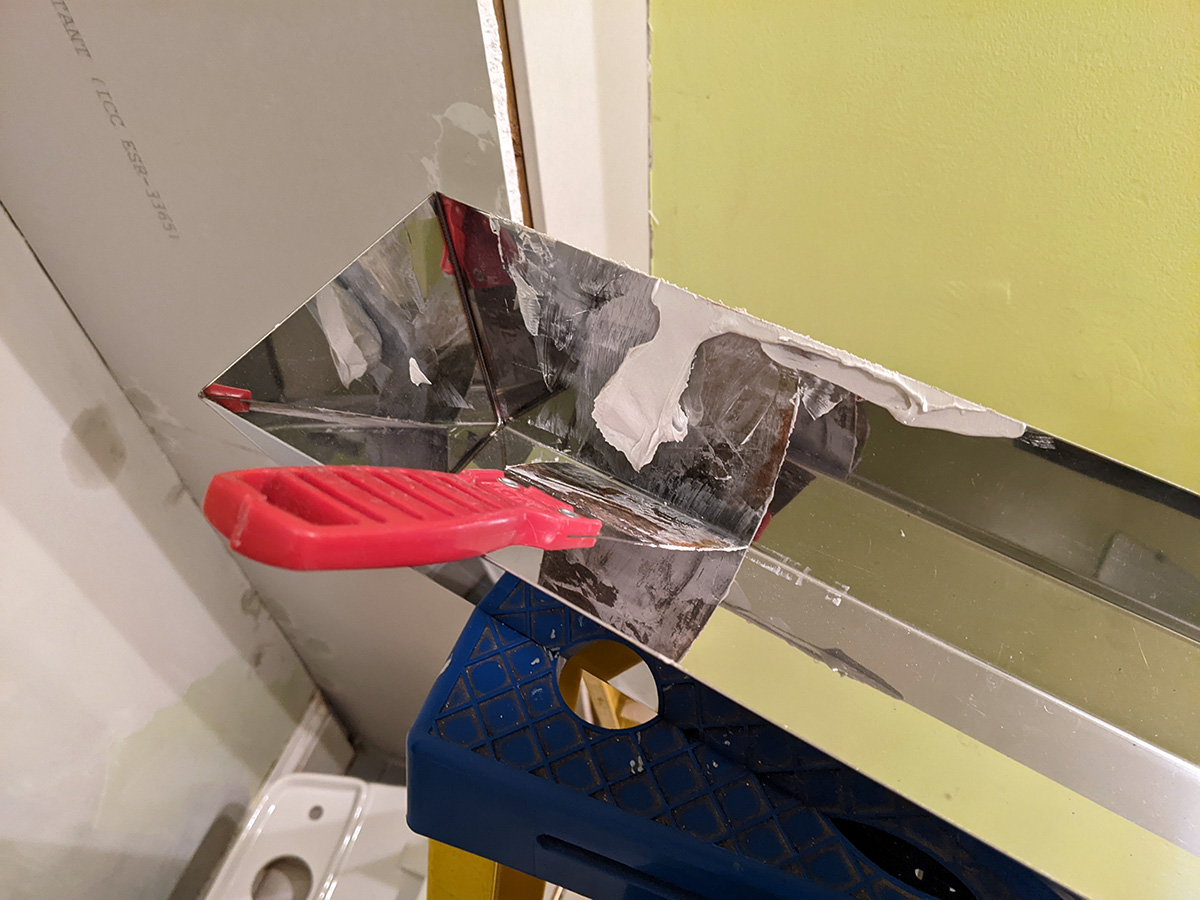 in the past when i worked with joint compound i scooped it directly from the container. that's bad because i end up with dried pieces of compound while i'm working. learning from the pros, i got myself a 12" long stainless steel mud pan. it's a little scary because the edges are so sharp, like holding a box with knife-edges on every single side. having never used one before, i found it kind of intuitive. i used the edge of the pan to scrape off excess compound, or to shape the compound when i need to apply it thicker or thinner. i really should be wearing gloves, i'll remember to do that next time.