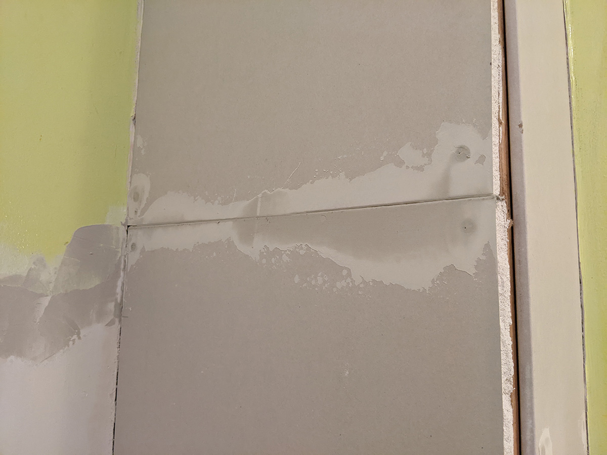 while i was at it, i also patched the back wall with the partially torn drywall paper. it was kind of a mess, i'll need to sand afterwards to make sure it's all smoothed out. i noticed while i was patching that earlier spots were already starting to dry, turning from a wet grey to a dry white. i finished by 6:50pm, washed the 4" putty knife and mud pan.
