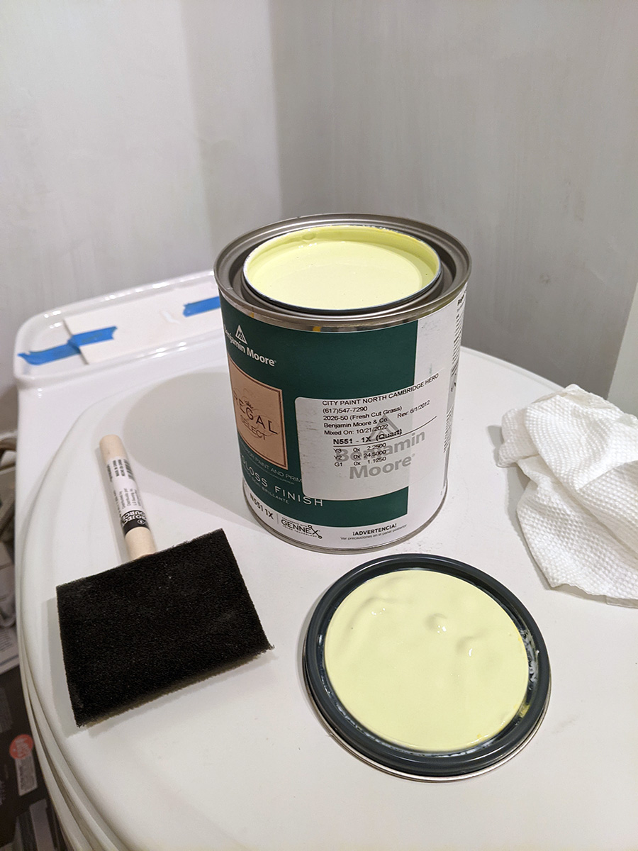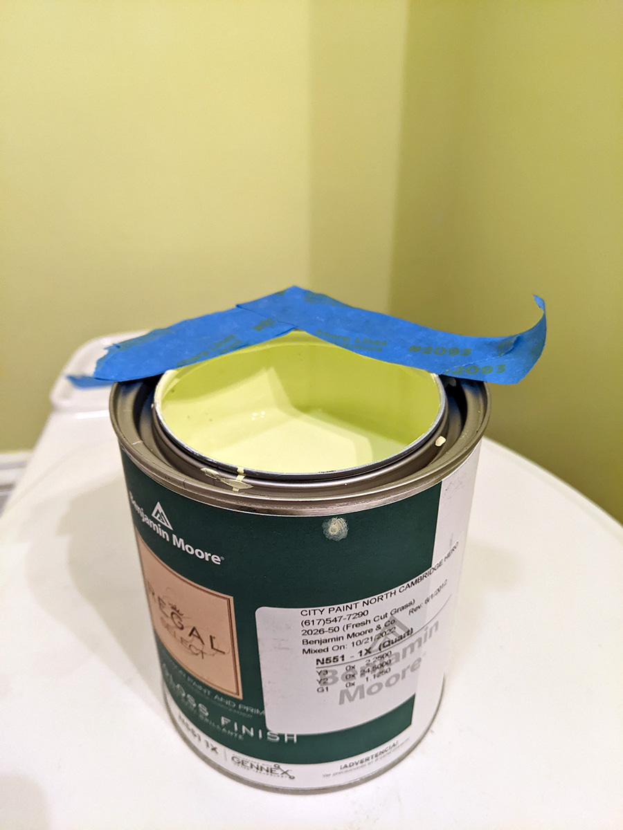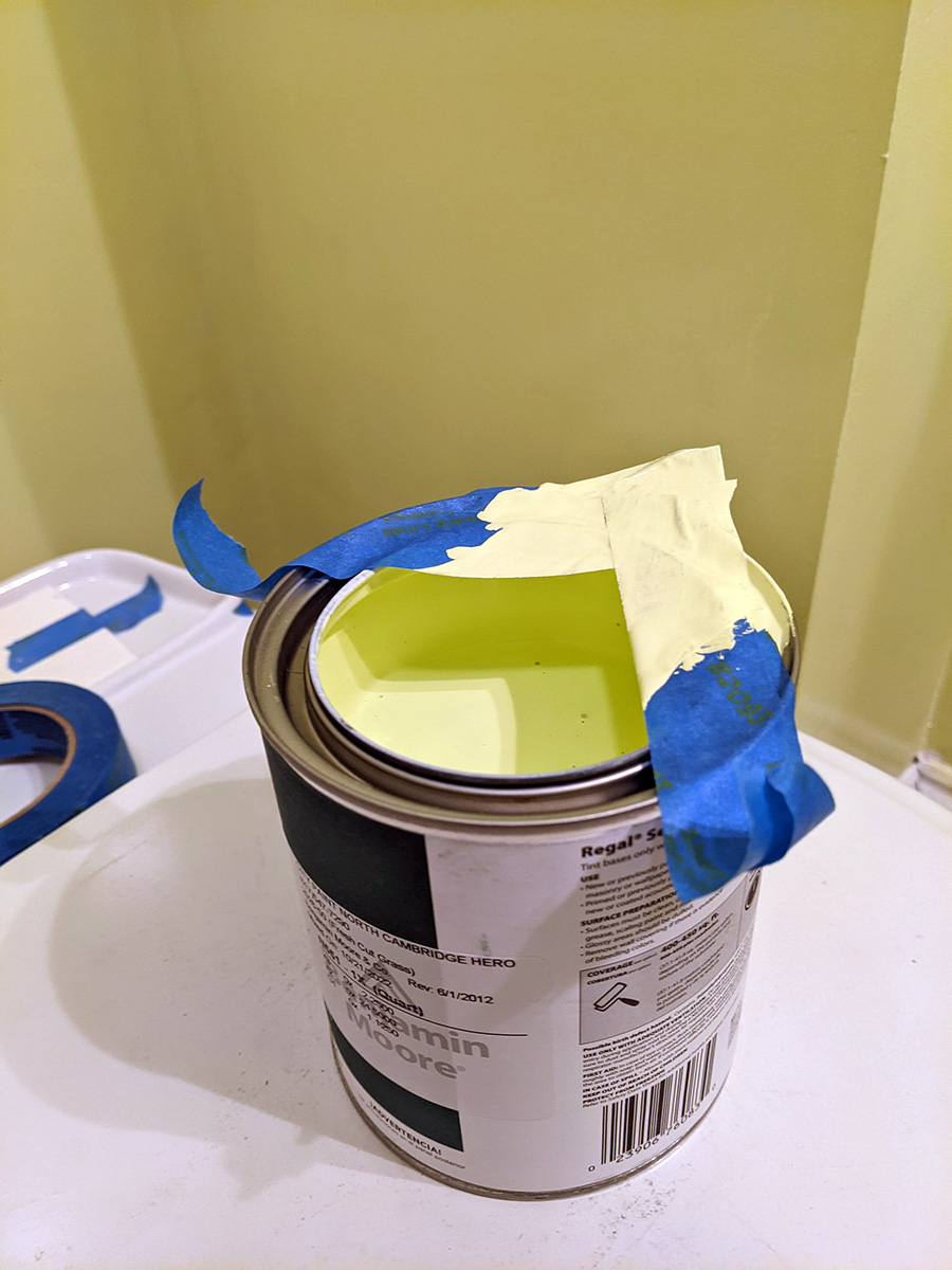 unlike with the primer coat, i had to be more careful with the final coat. i used 3 different brushes: a foam brush, a 3" angled brush, and a 7" roller. i ran into some issues in the beginning because i couldn't figure out how to pour out the paint without making a big mess. earlier i watched a youtube video where they used a hack that involves using tape to form a spout. i tried it and it didn't really work. benjamin moore is pretty thick, and the paint was heavy enough that it tried to burst through the tape. might i need another supply run to get a quart-size pour spout for the paint can? but i tried the tape hack again - it was all i got - and this time it kind of worked, even though it still made a mess.