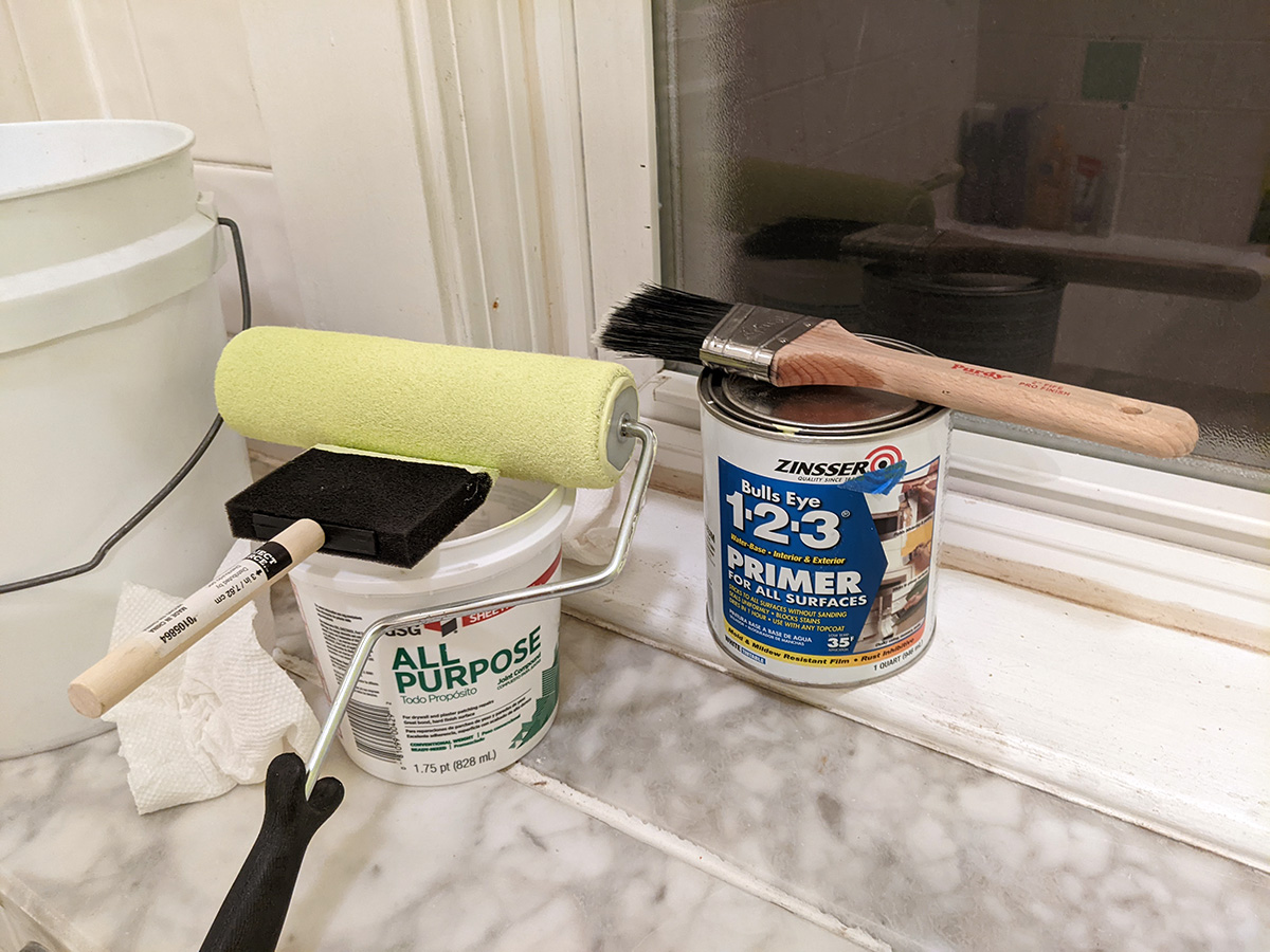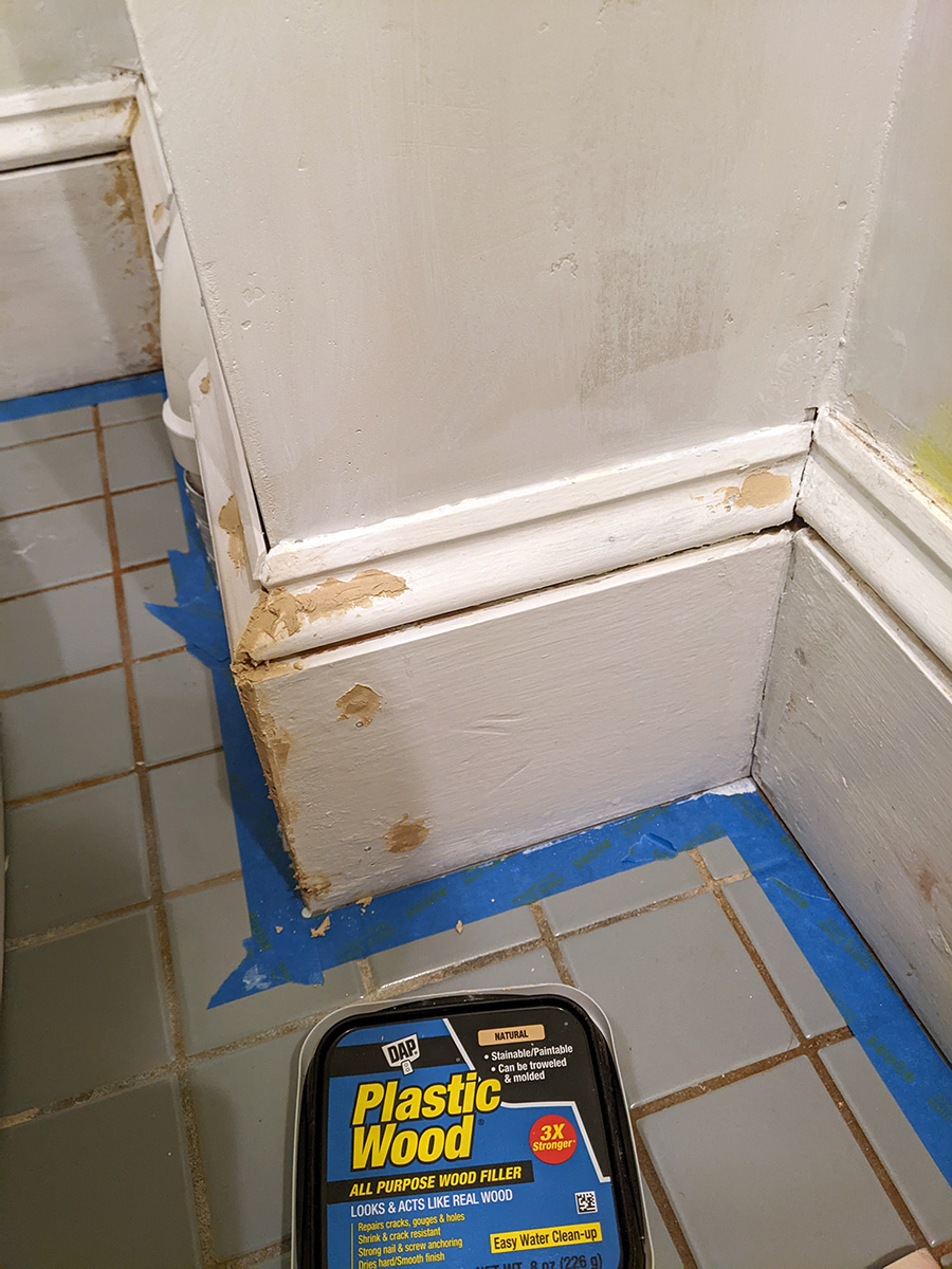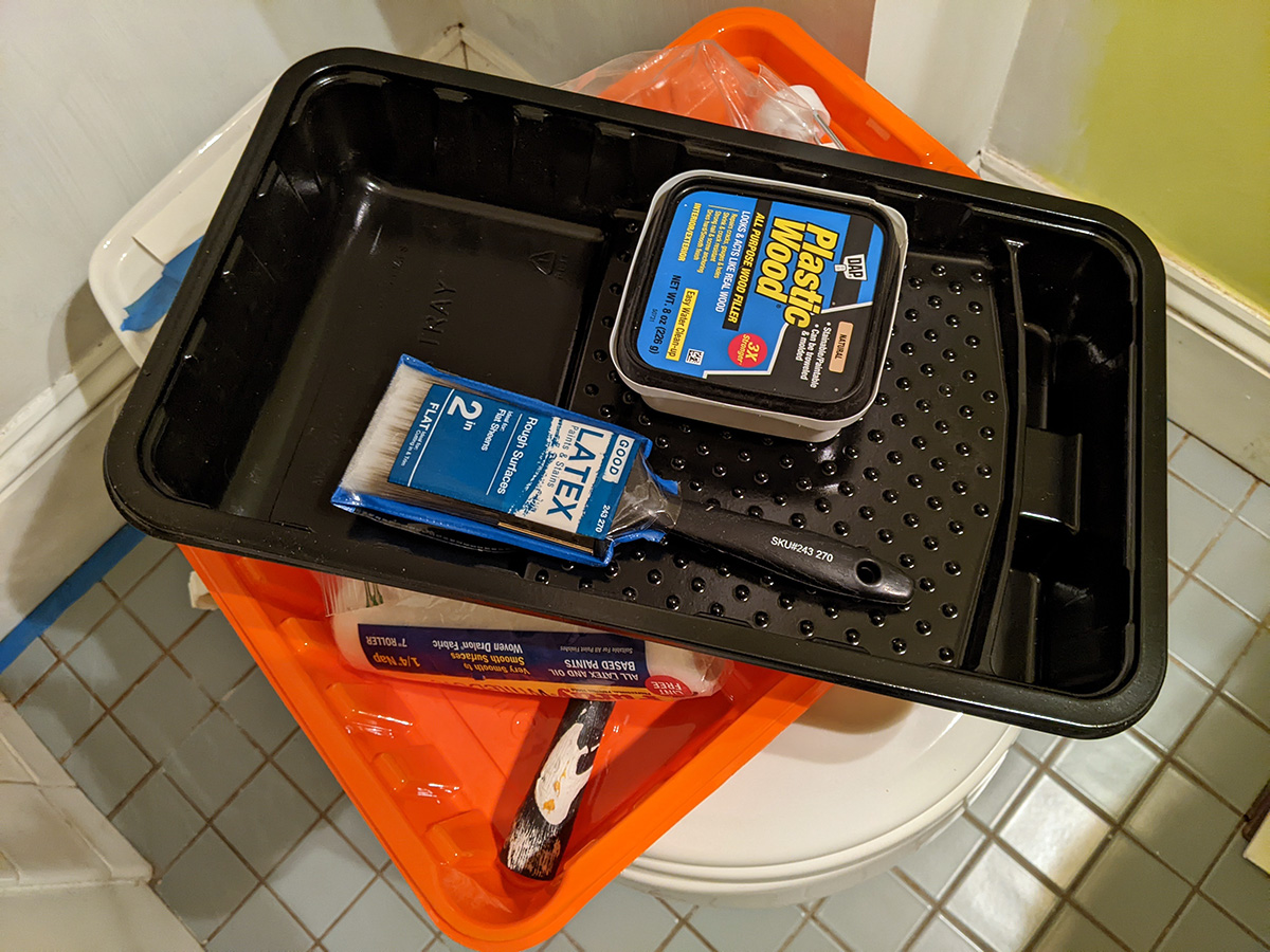 back at home, i was excited to start painting the 1st of two final coats. but i was worried that the quart of benjamin moore wouldn't be enough, even though i did the math (40 square feet of bathroom wall requiring painting) and a quart of paint should provide 100-120 square feet of coverage. instead of a bigger roller (9 inches), i wanted to use a smaller roller (7 inches). but that meant using a smaller paint tray, one that isn't as wasteful. i also wanted to patch the gaps in my loosely attached wood trims. when i checked my two containers of wood filler, they had all dried up.