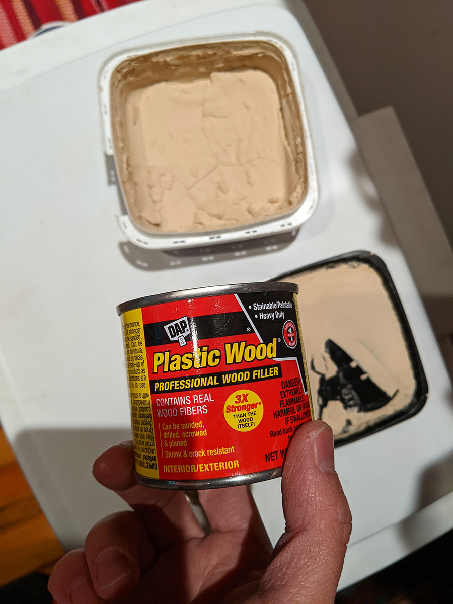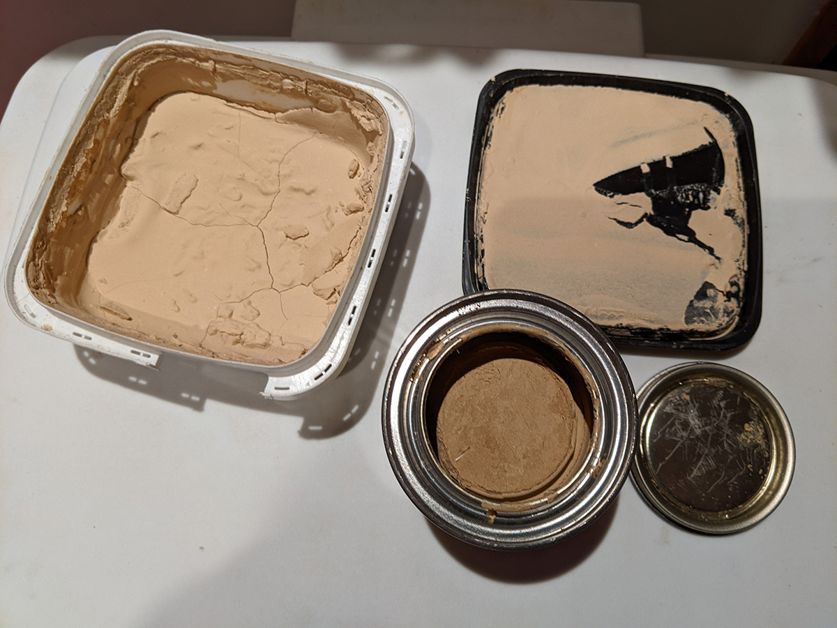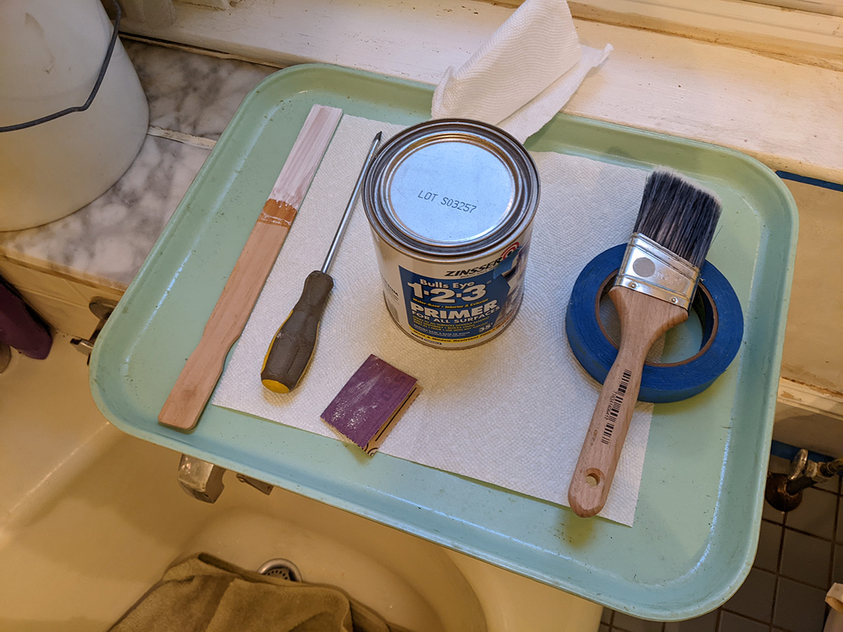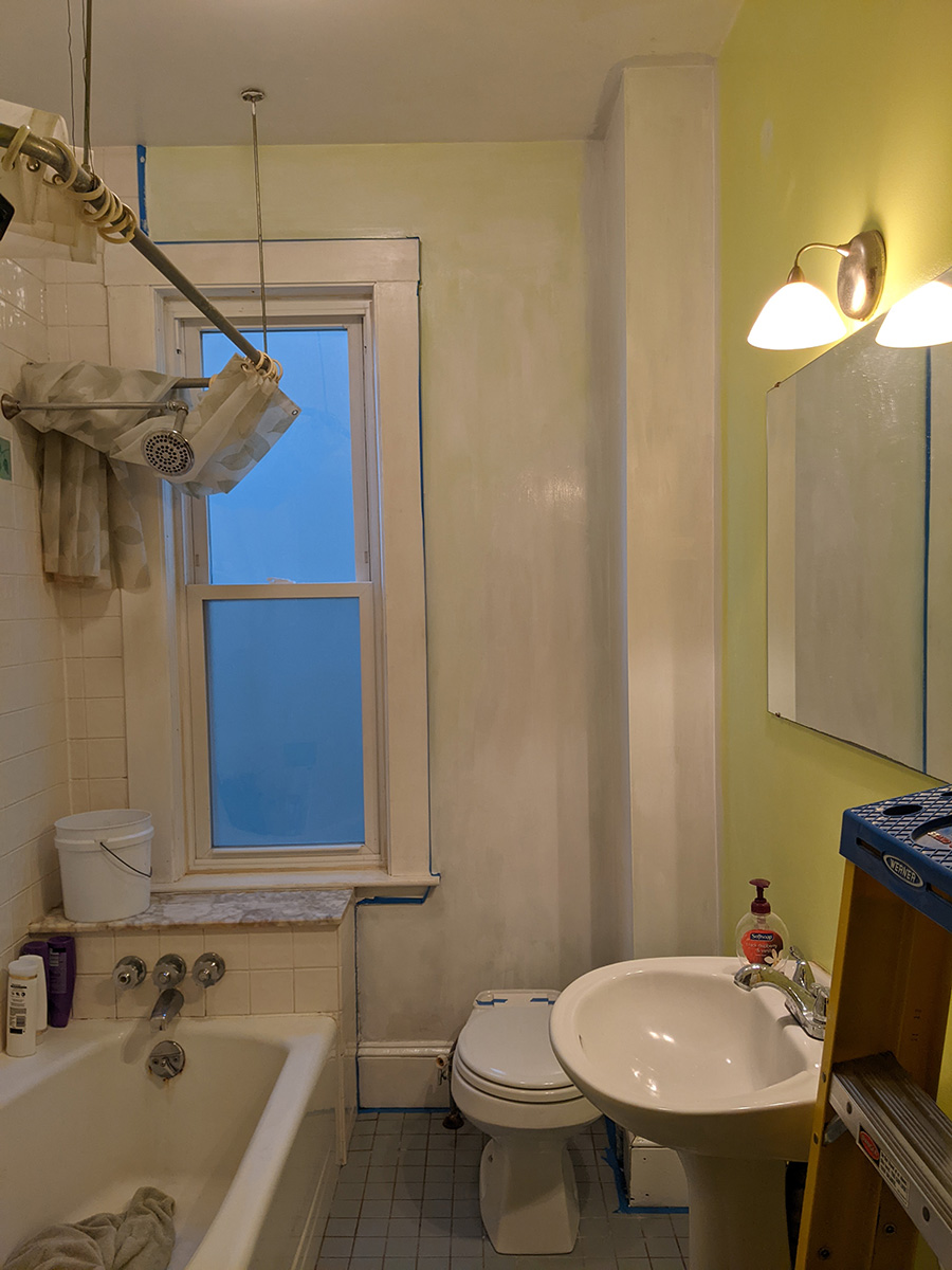 back at home, i was excited to start painting the 1st of two final coats. but i was worried that the quart of benjamin moore wouldn't be enough, even though i did the math (40 square feet of bathroom wall requiring painting) and a quart of paint should provide 100-120 square feet of coverage. instead of a bigger roller (9 inches), i wanted to use a smaller roller (7 inches). but that meant using a smaller paint tray, one that isn't as wasteful. i also wanted to patch the gaps in my loosely attached wood trims. when i checked my two containers of wood filler, they had all dried up.