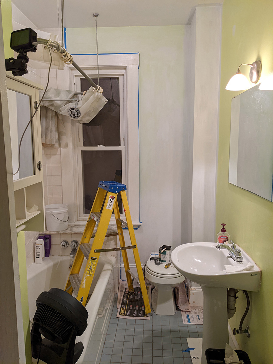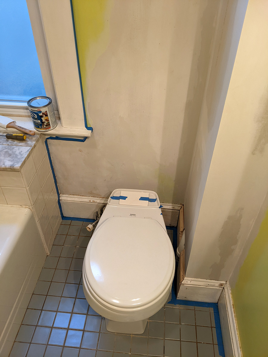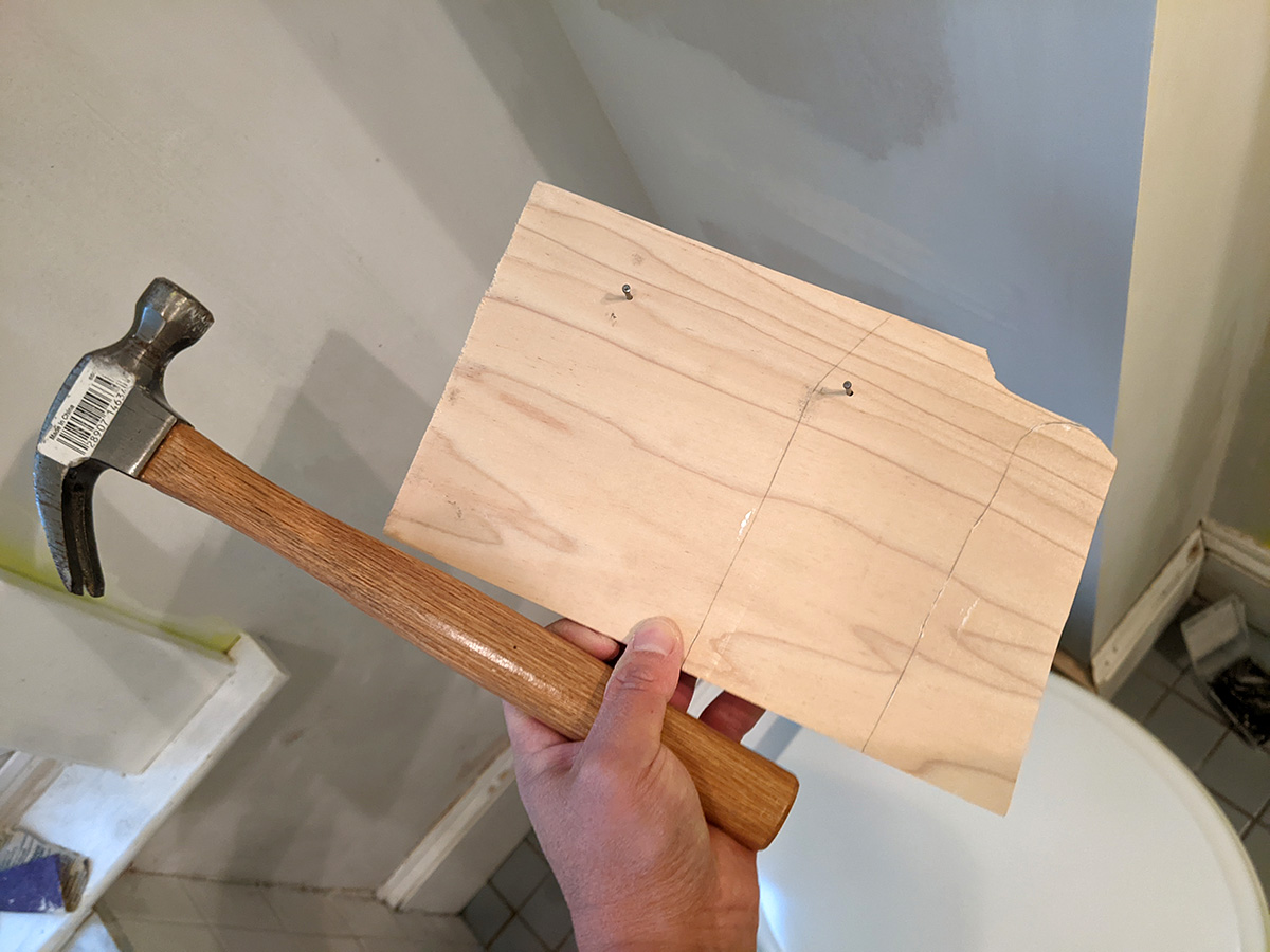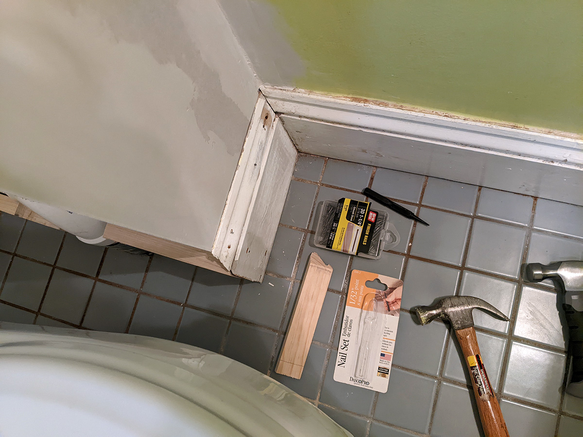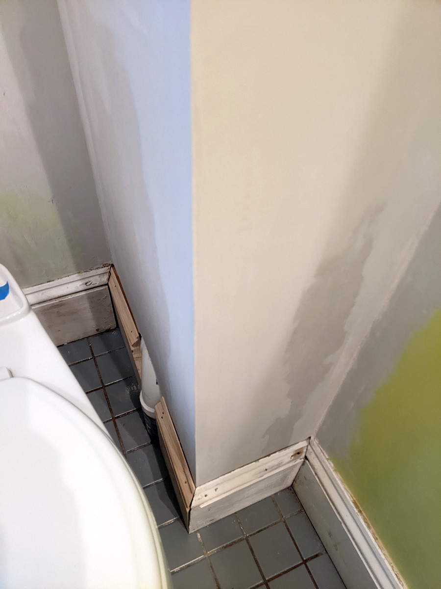 today was painting day. in order to do that, i needed to attach the baseboard and molding to the bottom of the piping box. the molding i bought was a slight mismatch (smaller), so i decided to reuse the old molding, just a bit of sanding to remove the old paint, it was practically new. because the baseboard and molding is right next to the toilet, there wasn't a lot of clearance for a hammer. i naturally suck at hammering nails, but to do so in a confined space with a stubby hammer made it nearly impossible. to help me out, i drove in the finishing nails so they were nearly poking out from the other end before affixing them to the drywall. even then it seemed impossible to hammer. i also felt bad because it was pretty noisy, and i sent an apology text to jeff upstairs (he said it didn't bother them).