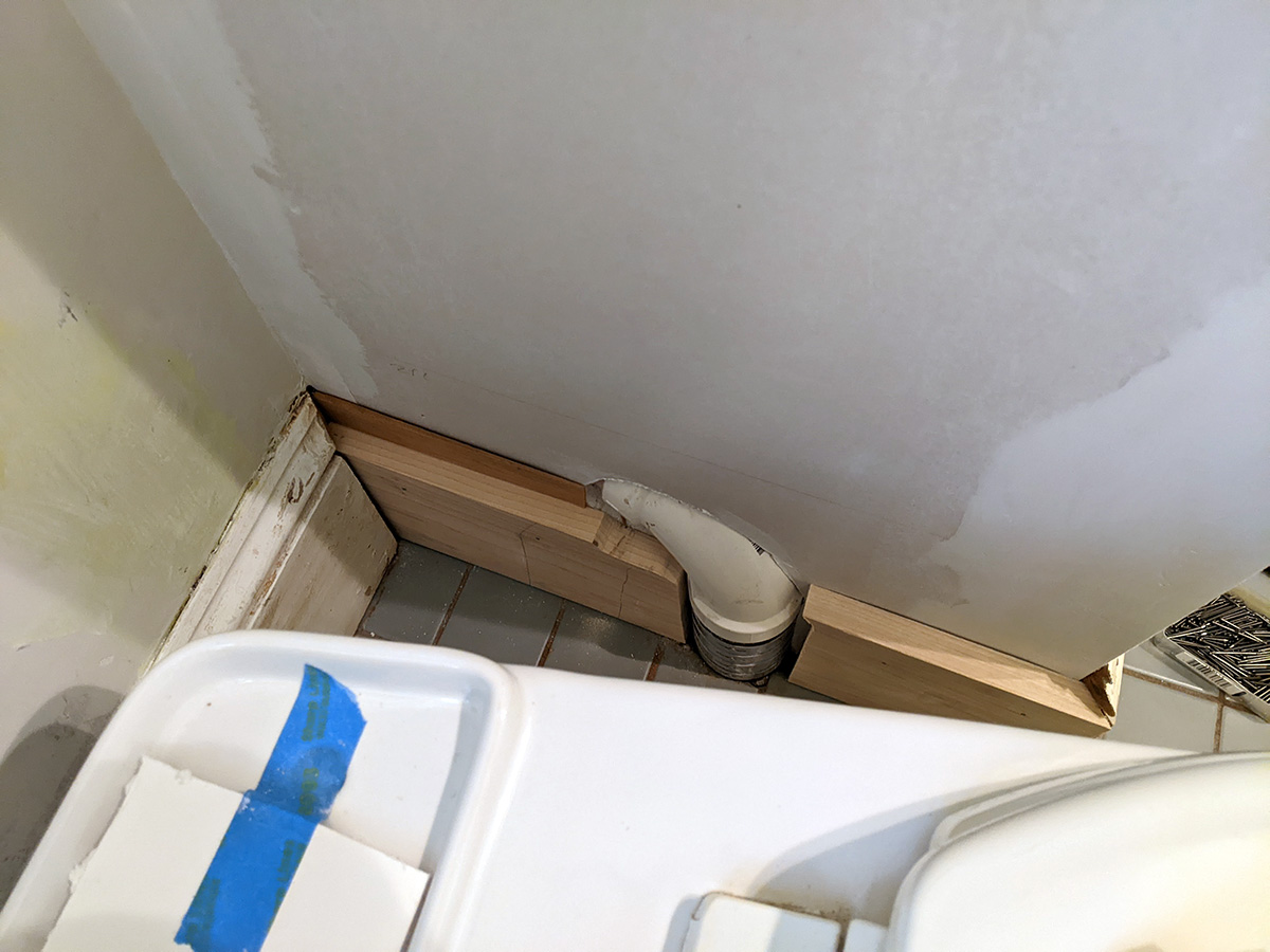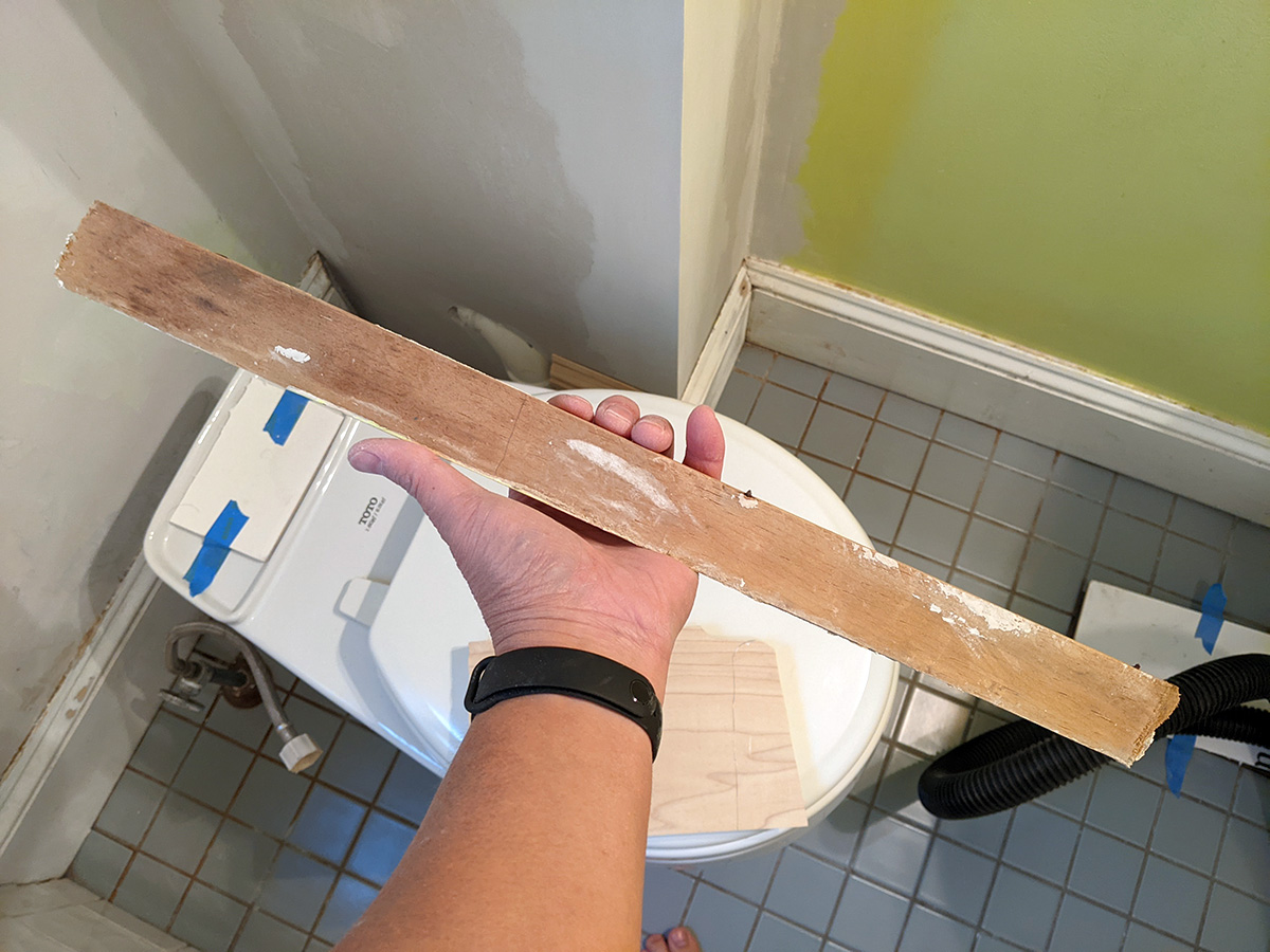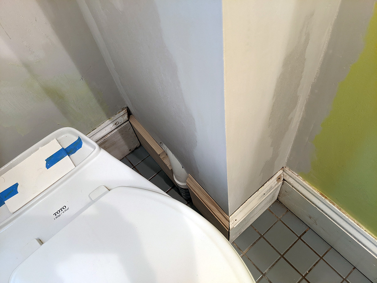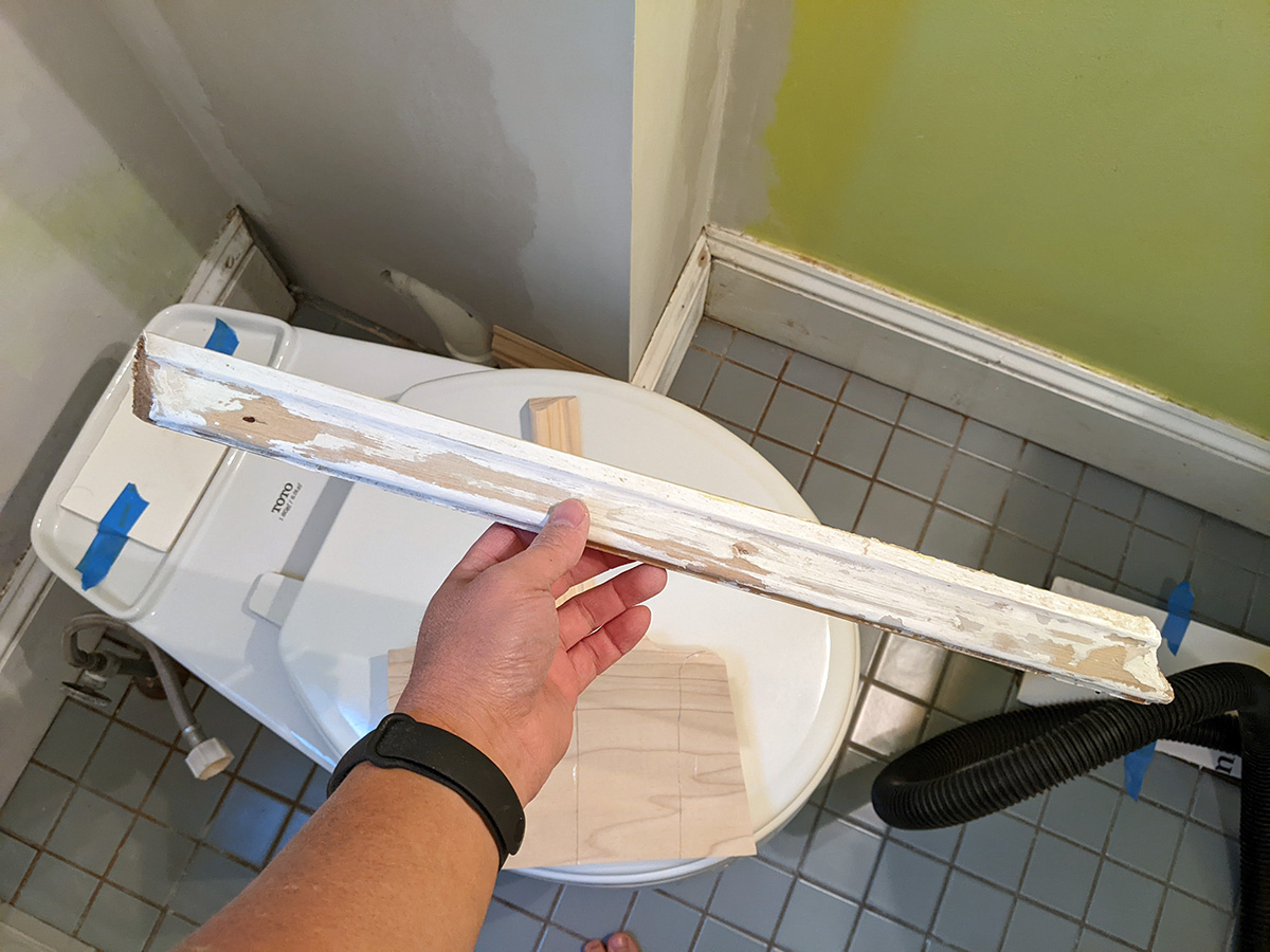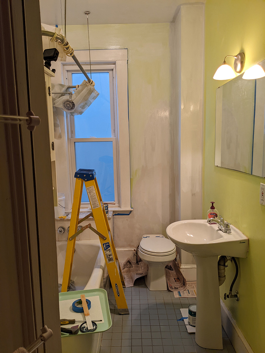 today was painting day. in order to do that, i needed to attach the baseboard and molding to the bottom of the piping box. the molding i bought was a slight mismatch (smaller), so i decided to reuse the old molding, just a bit of sanding to remove the old paint, it was practically new. because the baseboard and molding is right next to the toilet, there wasn't a lot of clearance for a hammer. i naturally suck at hammering nails, but to do so in a confined space with a stubby hammer made it nearly impossible. to help me out, i drove in the finishing nails so they were nearly poking out from the other end before affixing them to the drywall. even then it seemed impossible to hammer. i also felt bad because it was pretty noisy, and i sent an apology text to jeff upstairs (he said it didn't bother them).
