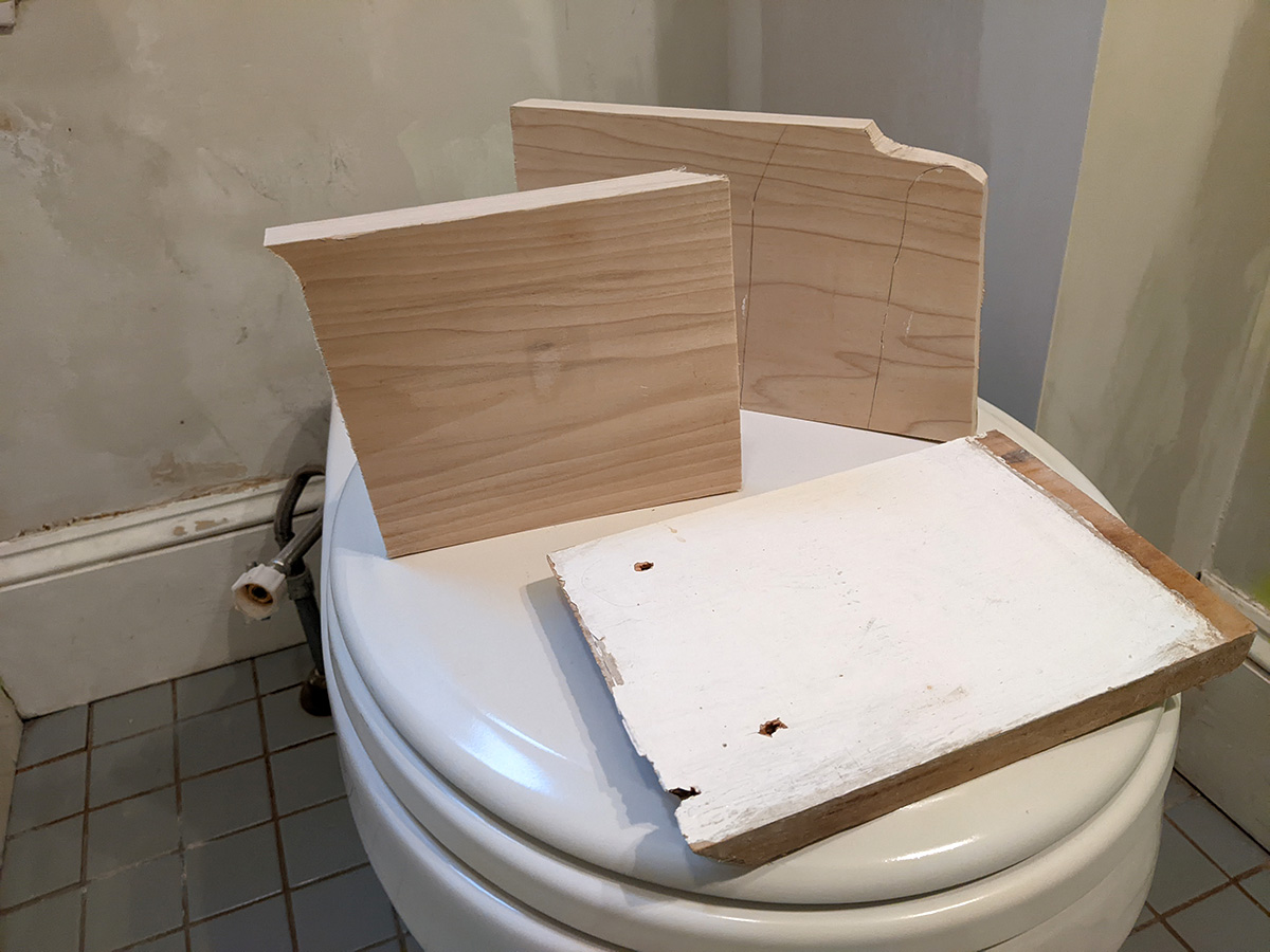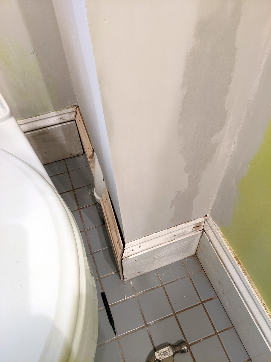 i basically gave up around 1pm. there were 2 separate pieces of baseboard plus molding; i managed to attach the ones coming from the walls. the one from the exposed piping to the outer corner, that one i had the most problems with, and that's also the one that's closing to the toilet. i decided to try some wood glue instead, and hop on the motorcycle and sped to the watertown home depot.