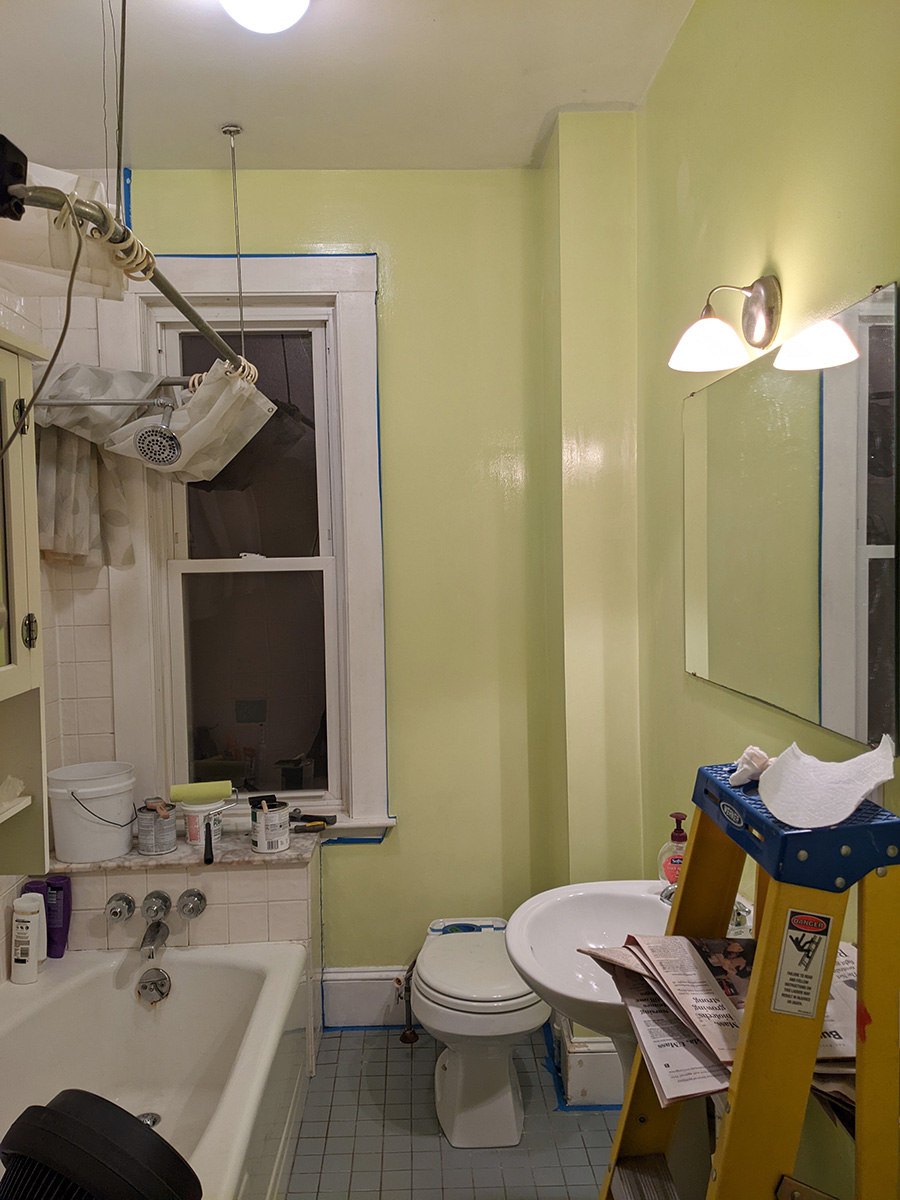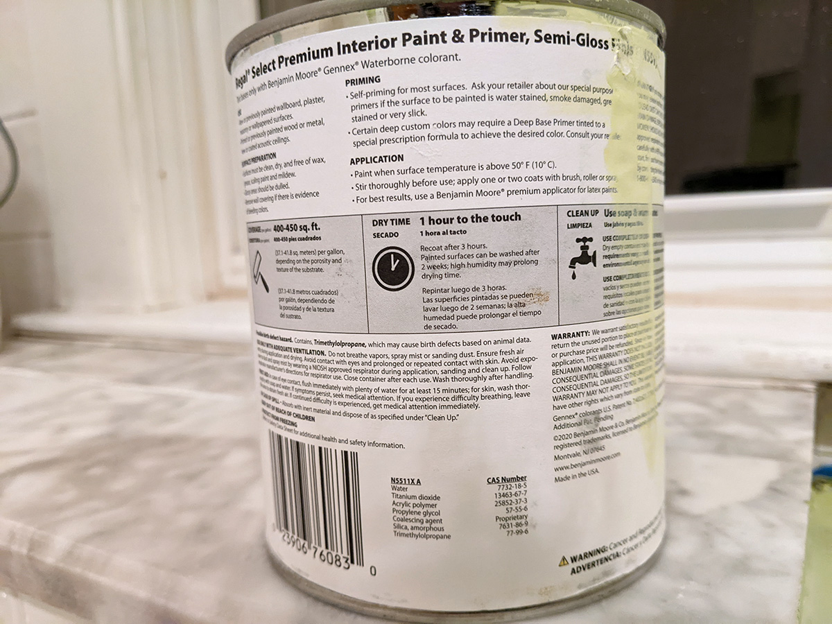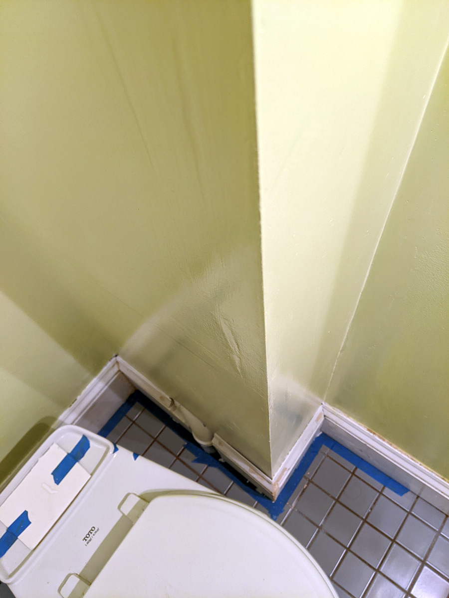 when midnight rolled around, i was back in the bathroom, painting the second and final coat. reading the benjamin moore instructions on the can, apparently it's self-priming, so the part where i painted with 123 primer was unnecessary. however 123 primer can also stain-block and provides a mold & mildew resistant barrier. another thing about benjamin moore paint is it doesn't necessarily need a second coat. in fact, when examining the first coat, it was already pretty good, i could've stopped there.