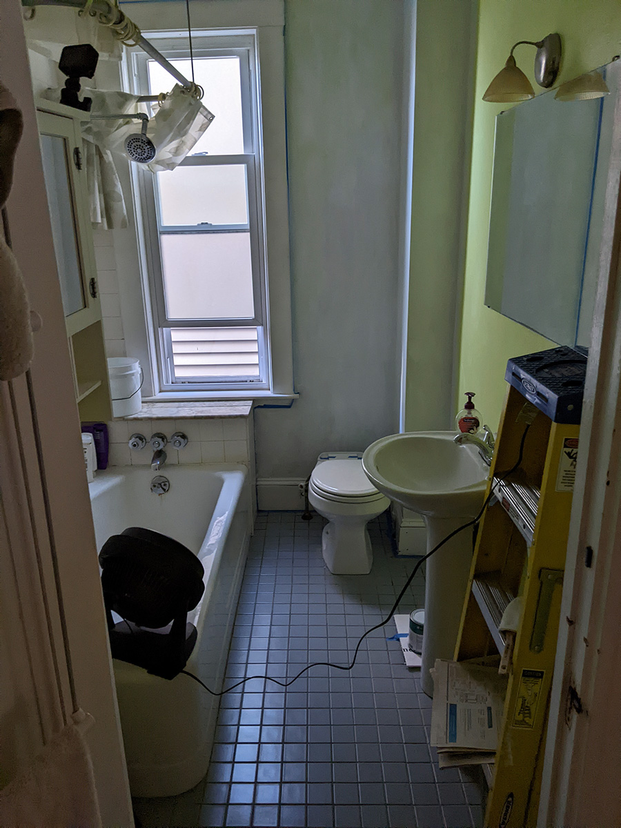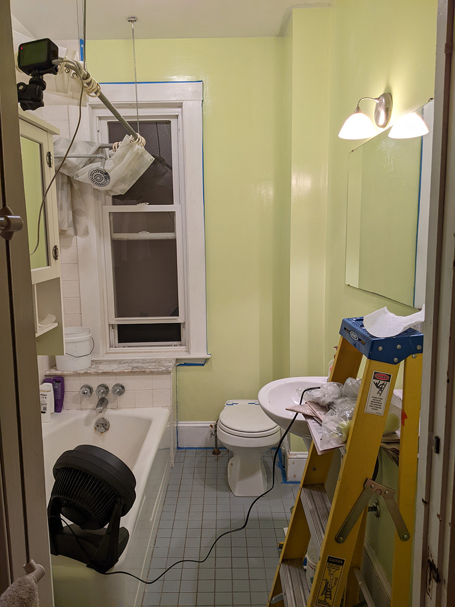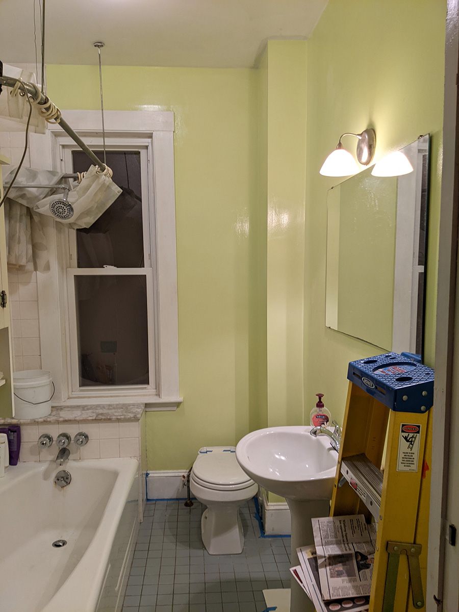 when midnight rolled around, i was back in the bathroom, painting the second and final coat. reading the benjamin moore instructions on the can, apparently it's self-priming, so the part where i painted with 123 primer was unnecessary. however 123 primer can also stain-block and provides a mold & mildew resistant barrier. another thing about benjamin moore paint is it doesn't necessarily need a second coat. in fact, when examining the first coat, it was already pretty good, i could've stopped there.