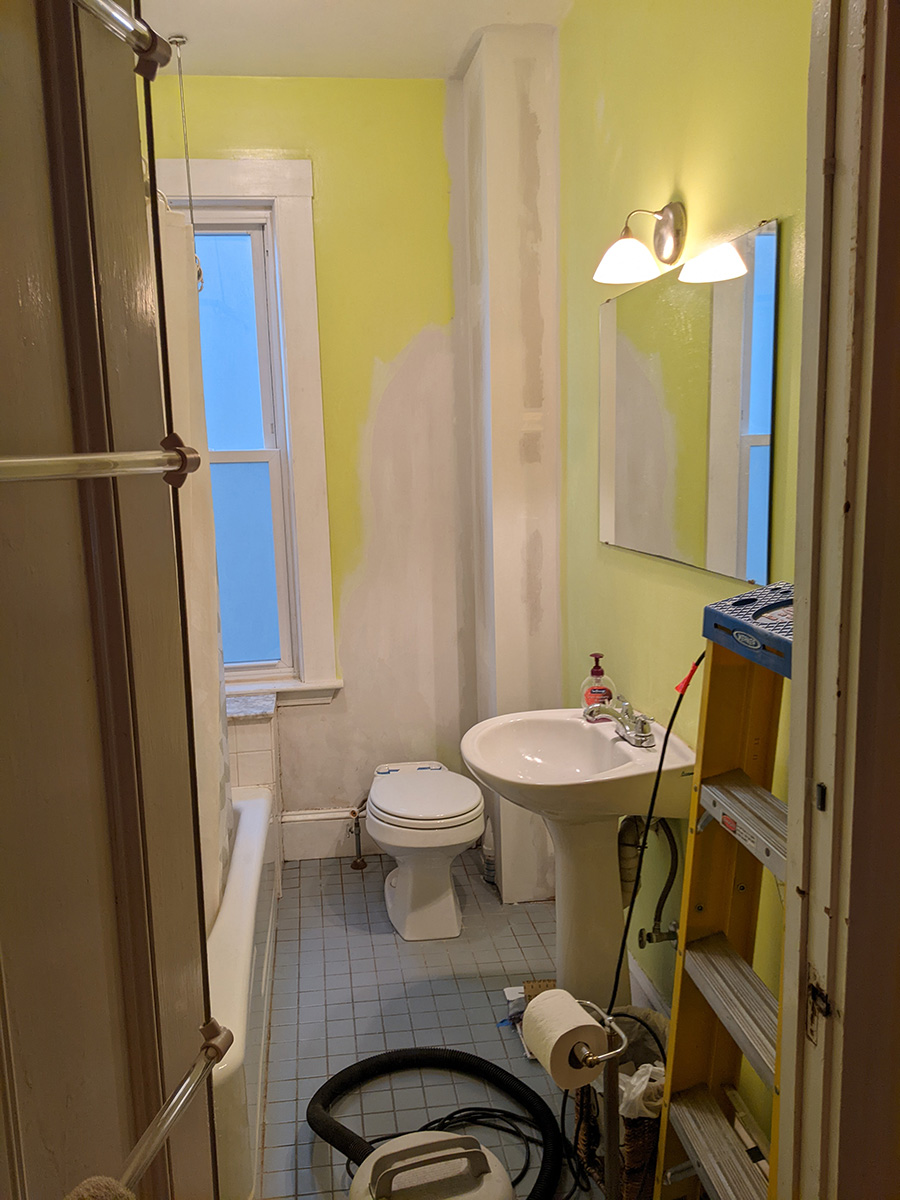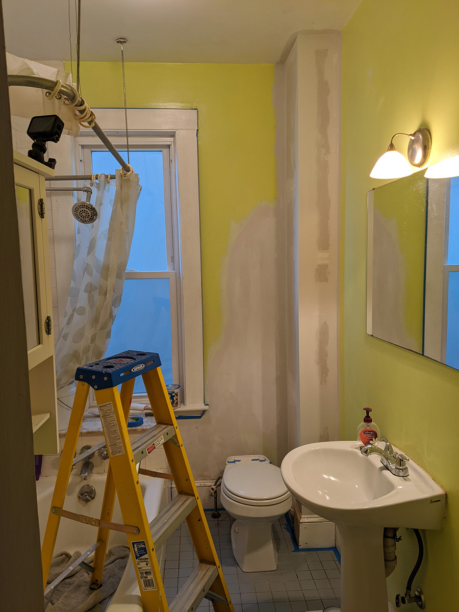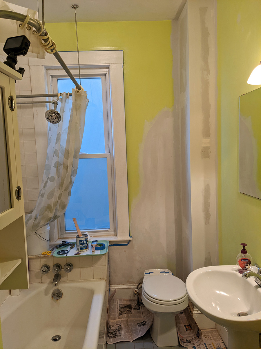 now with the fresh paint, the bathroom looks nearly finished. benjamin moore paint dries to the touch in one hour and can be recoated after 3 hours. that means i'll be painting the second coat around midnight. the new paint matches perfectly with the old paint, even was having a hard time seeing the difference. i did however notice imperfections upon closer inspection, and it's probably only things i would notice. for instance, those blisters i saw yesterday after i coated? well, they're back. it can be fixed (popping and refilling with joint compound) but more difficult since i've already applied primer and the first coat. butt joints that i taped? i can spot them, because they bulge out slightly. just little things. if i had to give myself a score, i'd say 80 out of 100. the wall isn't perfect, but it's my first time finishing a drywall, so naturally they'd be mistakes. regardless, it looks much better than the gaping hole that was there before. to be honest, if my relatives weren't crashing at my place, most likely the bathroom wall still wouldn't be fixed, and would probably drag into next year. yes, even though i've been crash coursing the drywall repair, it was probably the only way it'd ever get done.