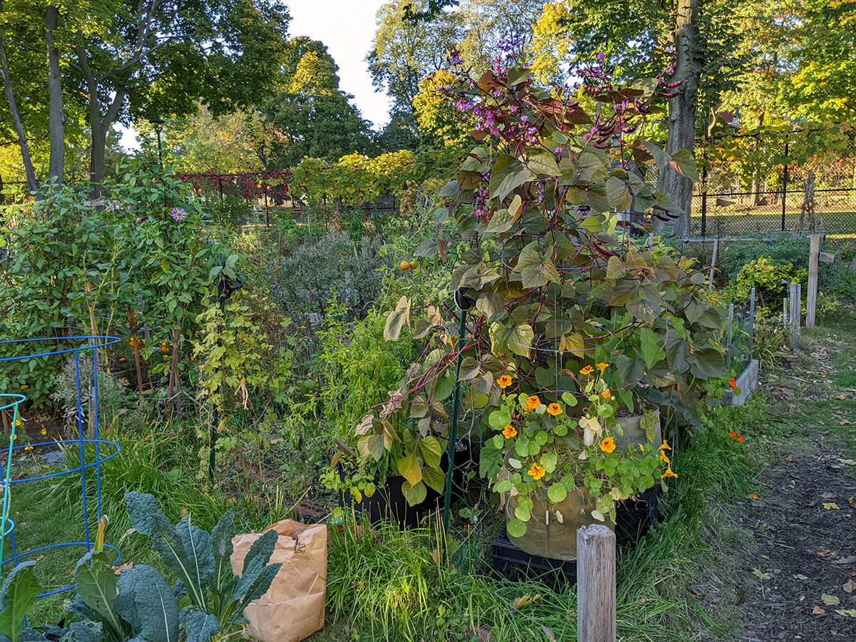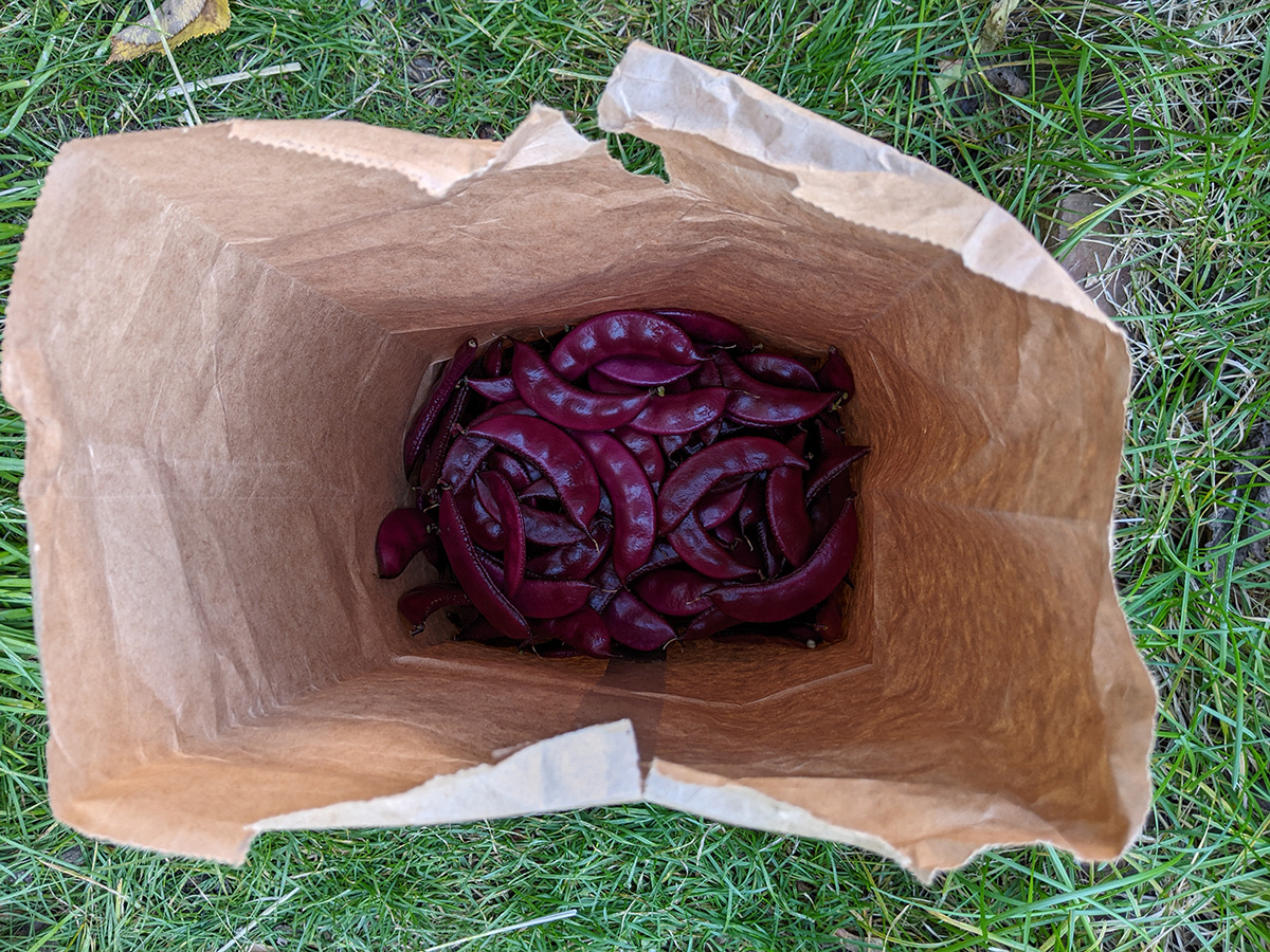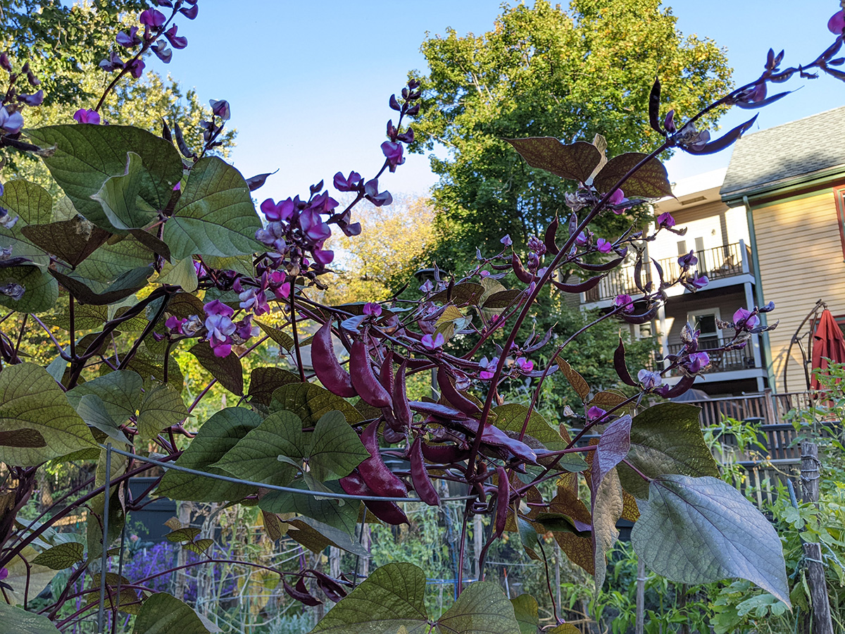 next i walked down to the community garden to harvest my hyacinth beans. the city has already turned off the water and there was nobody there when i showed up. seems like i just harvested these beans not so long ago, and now i have another harvest. i ended up with 2-1/2 lbs. of beans collected in a brown bag. when i left, gretchen was visiting her garden, picking some marigolds. be both managed to remember each others names.