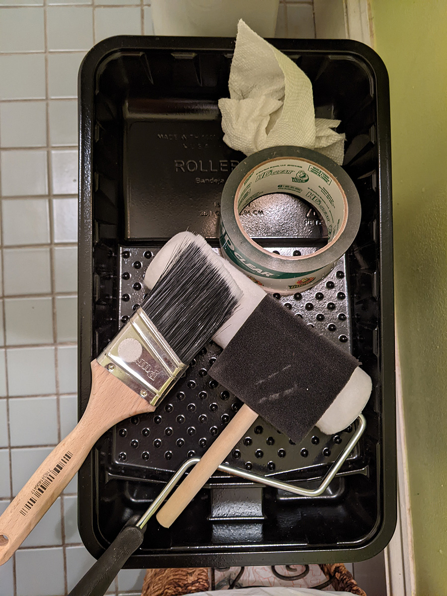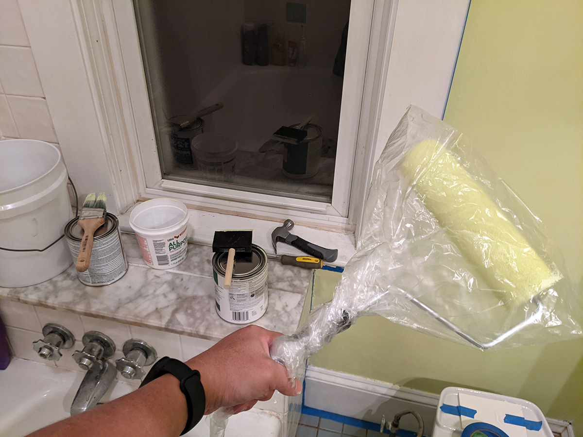 the foam brush is for detailed edging (like the border between the green wall and the white ceiling), roller for big flat sections, and the brush for everything in between, like the inner corners or pretaped edges. i started from top down, and from the hardest to reach area which is the wall behind the shower head above the window frame.