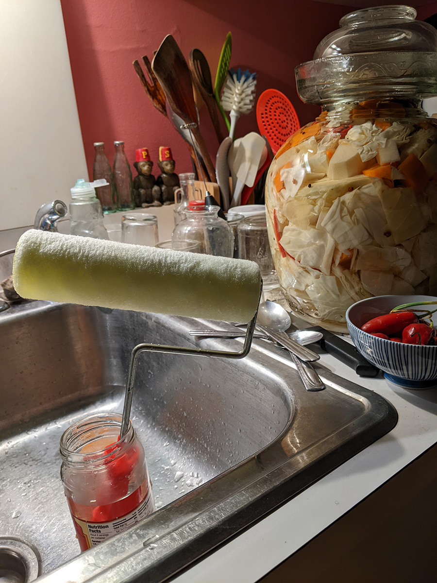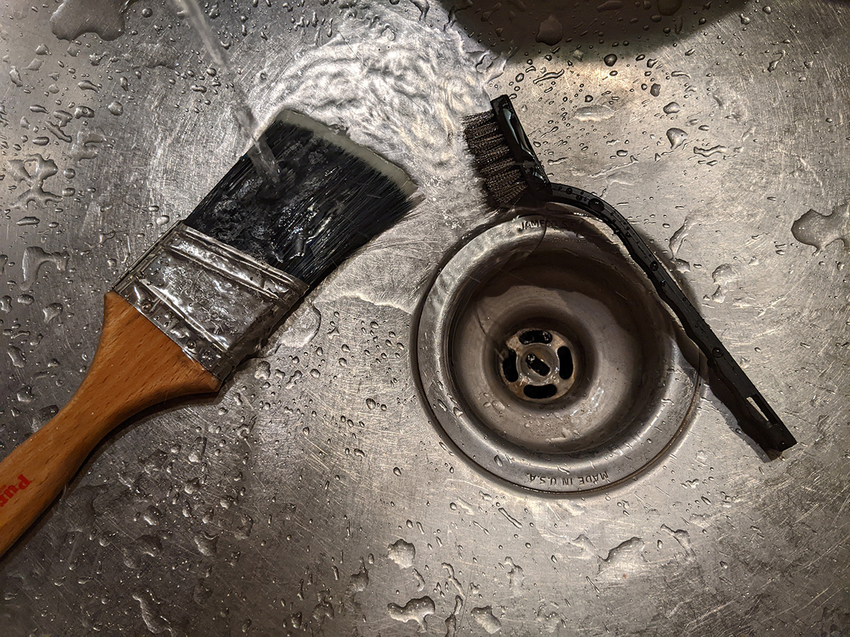 an hour later (8:30pm) i was done. i'd only used up about a quarter of the paint, so there'll be plenty left over for the 2nd coat. i put the roller and foam brush into sealed plastic bags but washed the regular brush. since it's acrylic paint, it can be washed with just water, which is what i did, using a brass brush to comb the hairs and to remove any embedded paint.