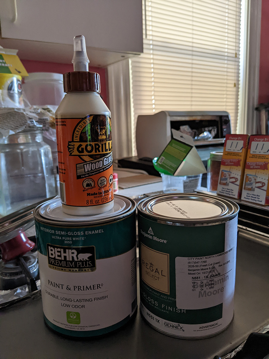besides wood glue, i also got a quart of behr premium plus semi-gloss enamel paint (ultra pure white) for the bit of ceiling and any wooden trims. it comes in many variations, i got the one that matched the paint i used 20 years ago.