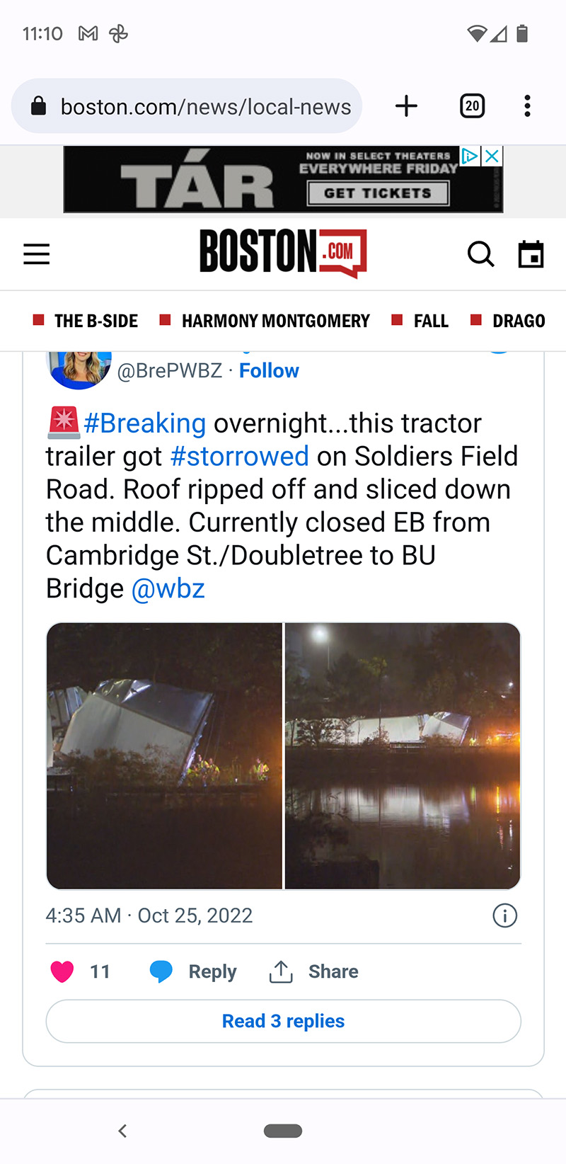 and was instead going to drive my relatives directly to JFK library, the first stop on their itinerary. anyway, my mother called asking me to work today, or at least until my father got back, whenever that was. i initially said no, told her to ask my sister instead, but then i changed my mind and called her back and said i'd be at the cafe by 9:30am. i checked my father's location on google map: they'd left 30 minutes ago but were still in front of the harvard business school. later i learned the reason for the insane traffic was a semi-truck getting storrowed on one of the bridges earlier today. in hindsight they should've taken the more direct (albeit slower in theory) route down mass ave towards the christian science building. not only would that have been more scenic, but they wouldn't be stuck on storrow drive.