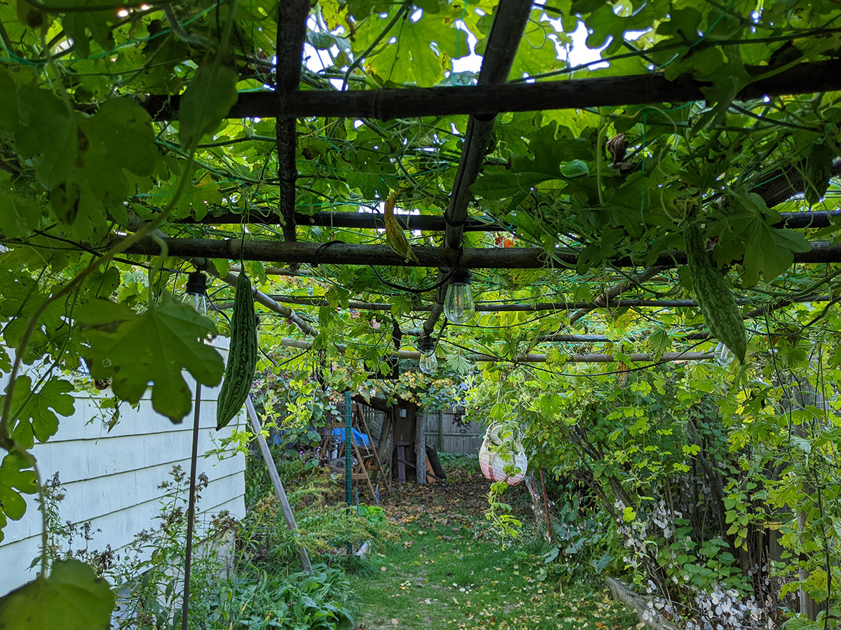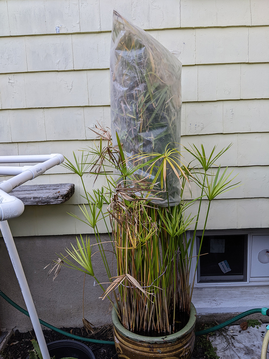 i got to my parents' place around 3:40pm. i was there for one purpose: to bring in the remaining houseplants so they don't freeze to death over the next few nights where the temperatures will drop into the lower 30's. i managed to move everything except for the water reeds; i put a plastic bag over it instead, with hopes of keeping it warm until i can move it this weekend. while i was there, i also watered the plants with mosquito-bit water.