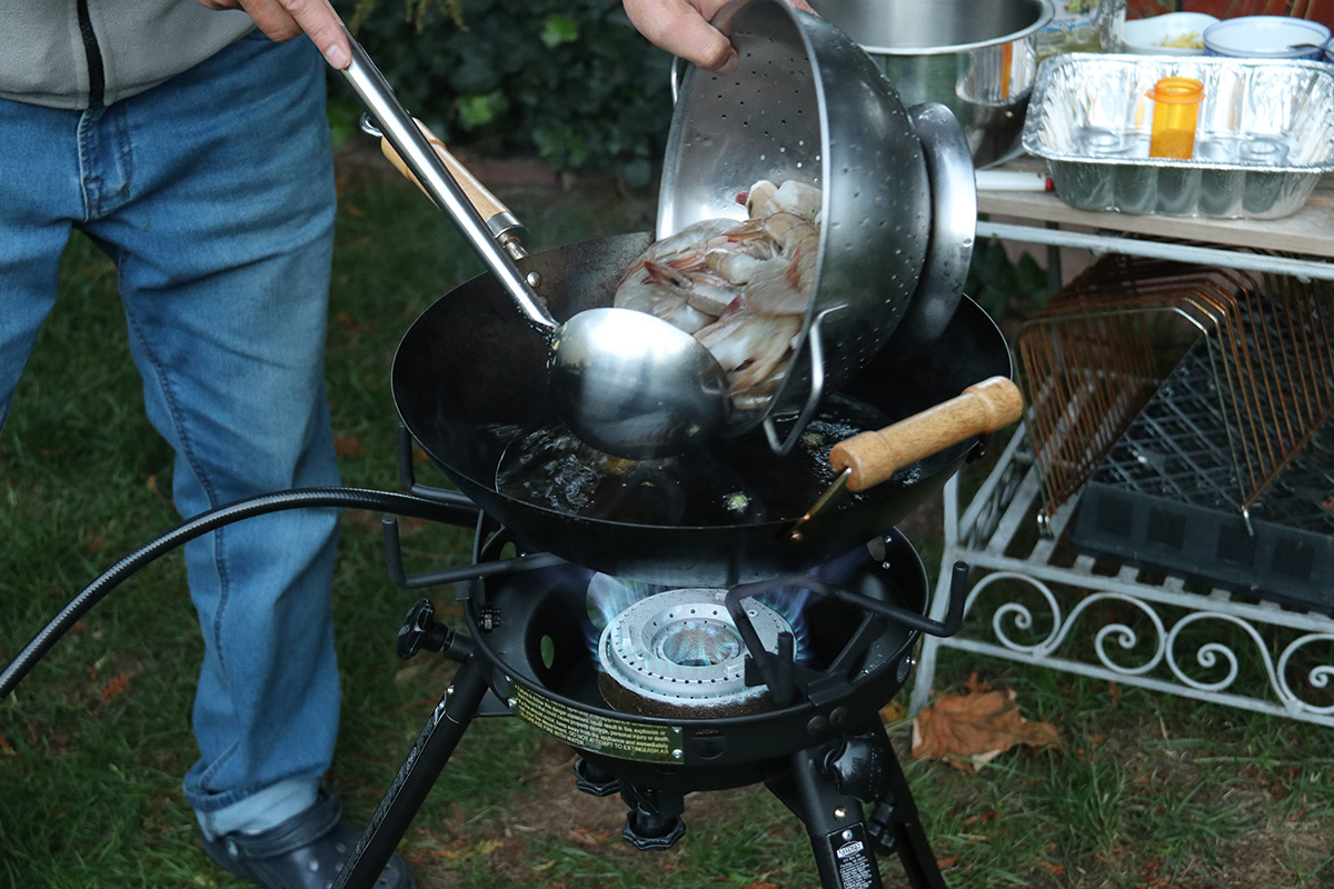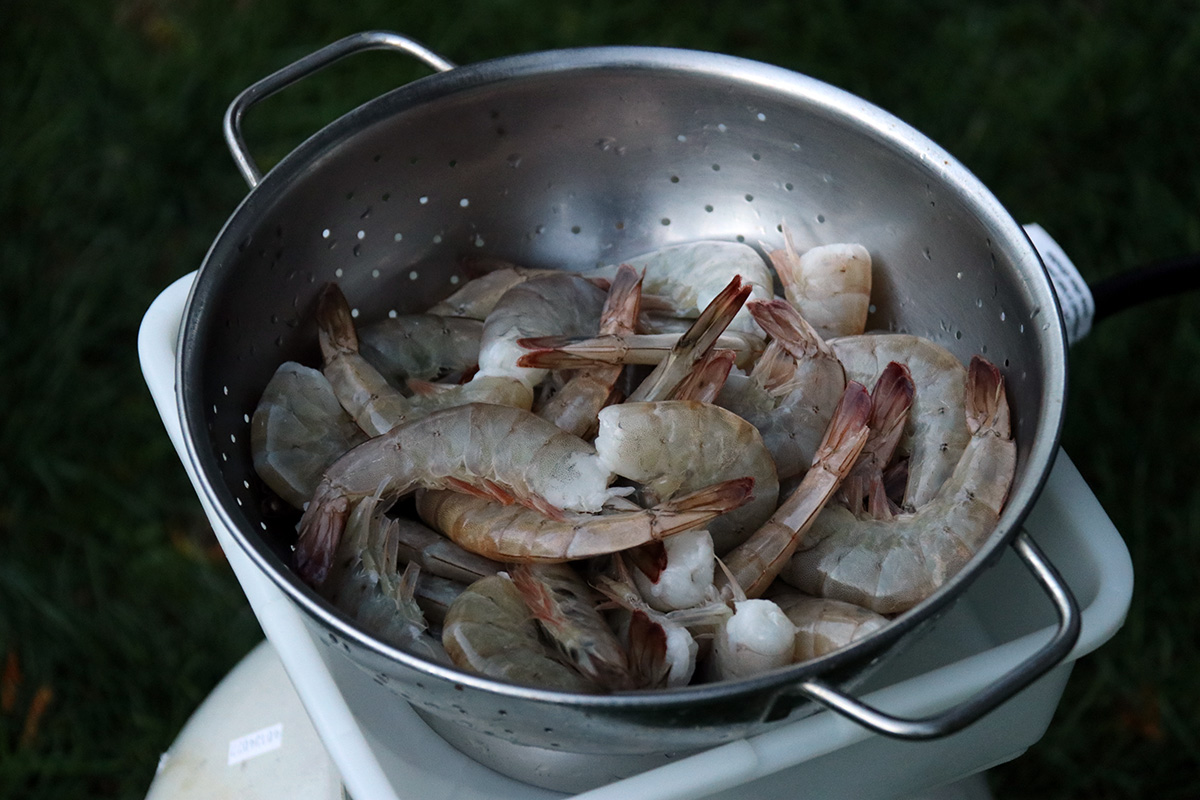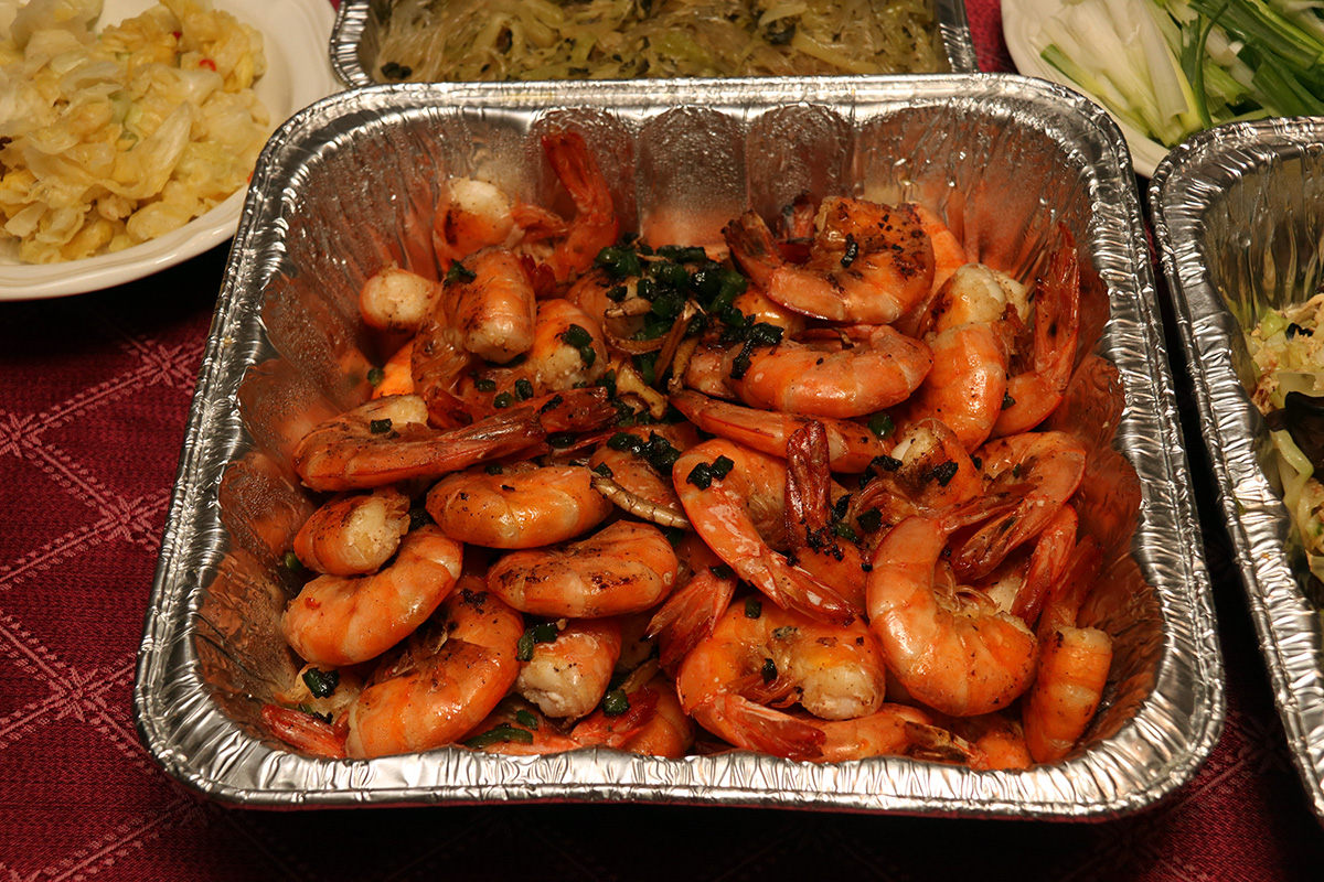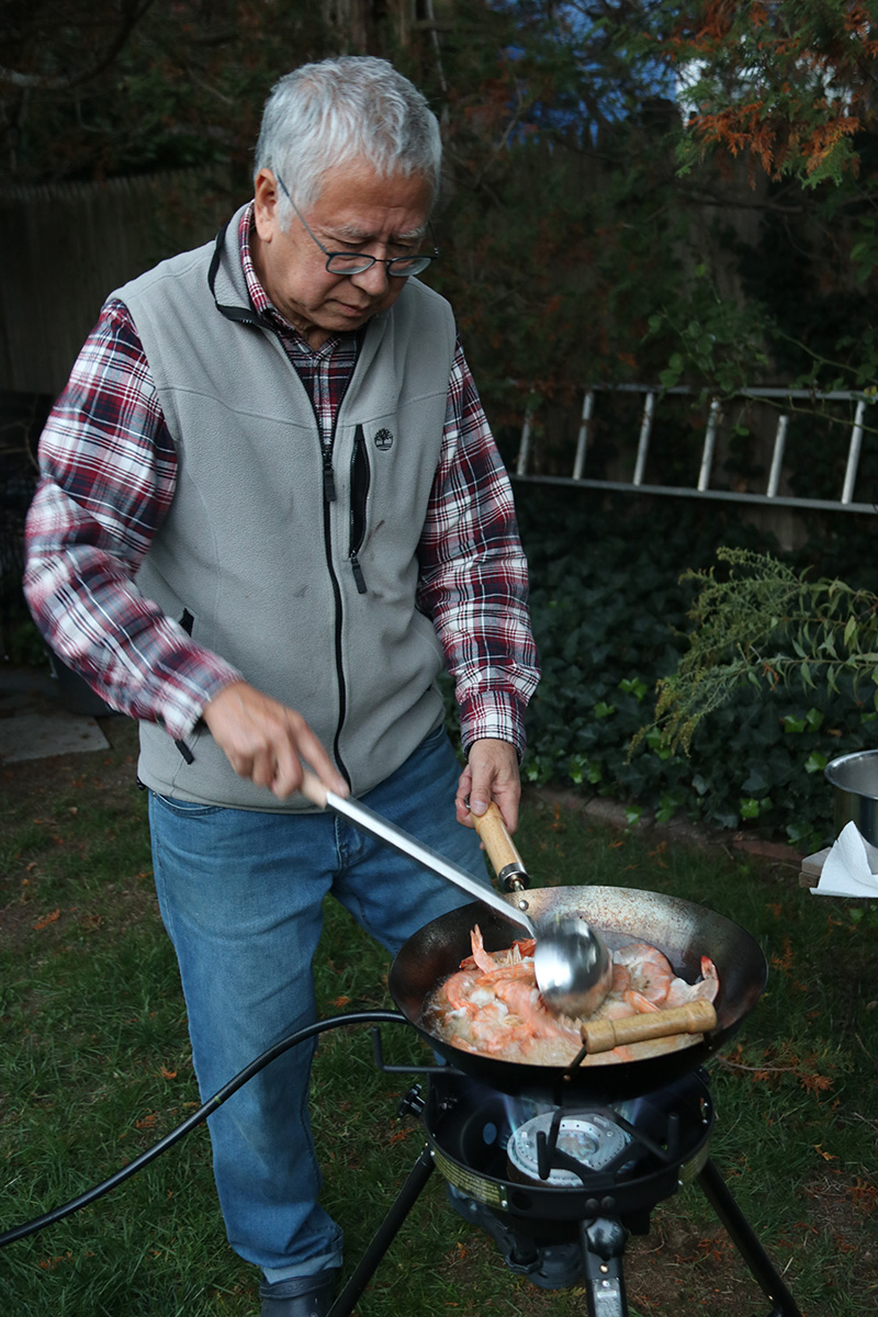 my father was waiting for me to deliver the jalapeno peppers so he could cook his salt & pepper shrimp. everyone went out to watch. he fried the shrimps first, but couldn't find his large skimmer, so the shrimps ended up overcooking while he resorted to a small skimmer. when he went to fry the shrimps a second time, i realized they weren't breaded, which meant they were going to be very crispy. the final result was a little disappointing, didn't look like the salt & pepper shrimp i had in mind.