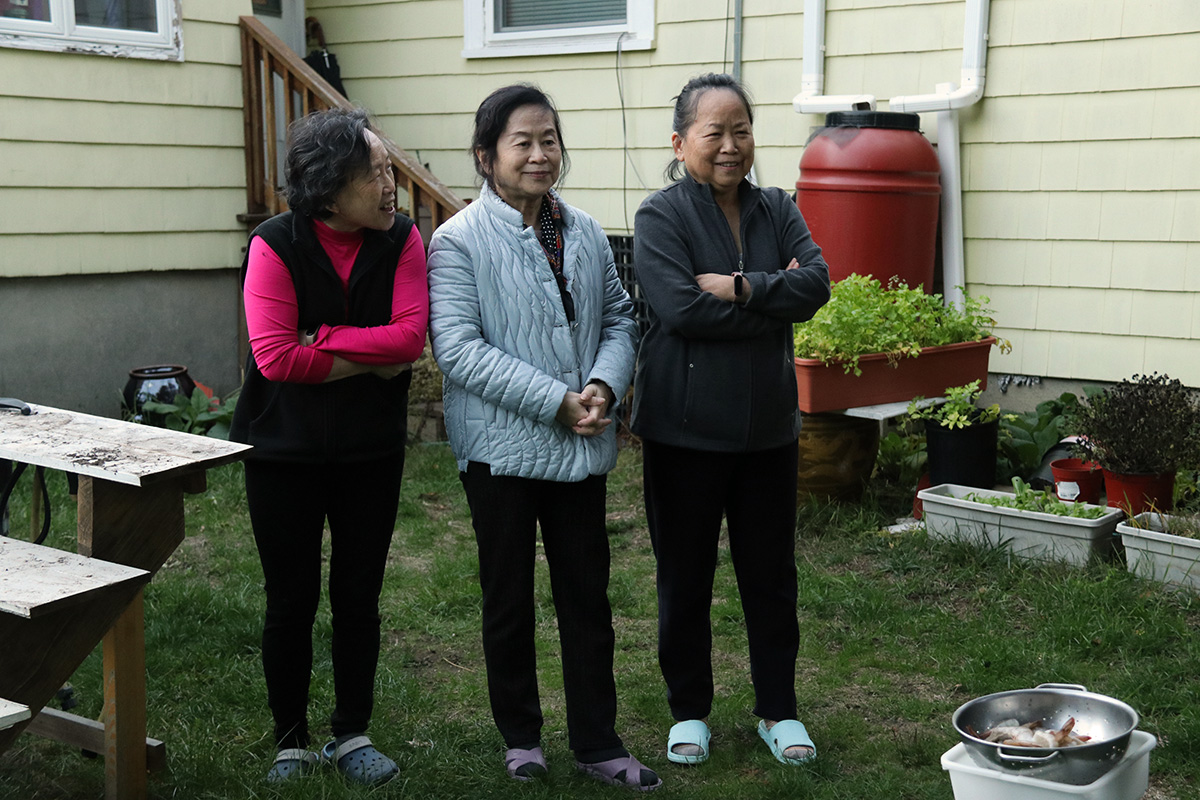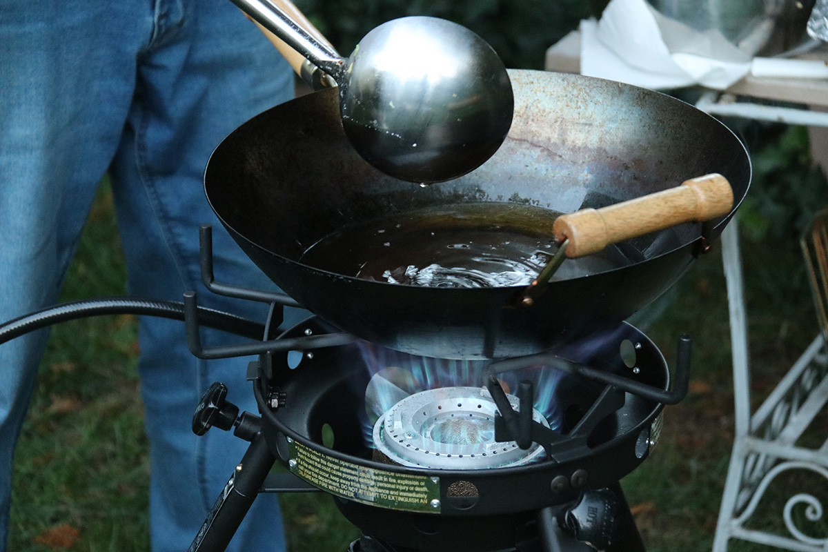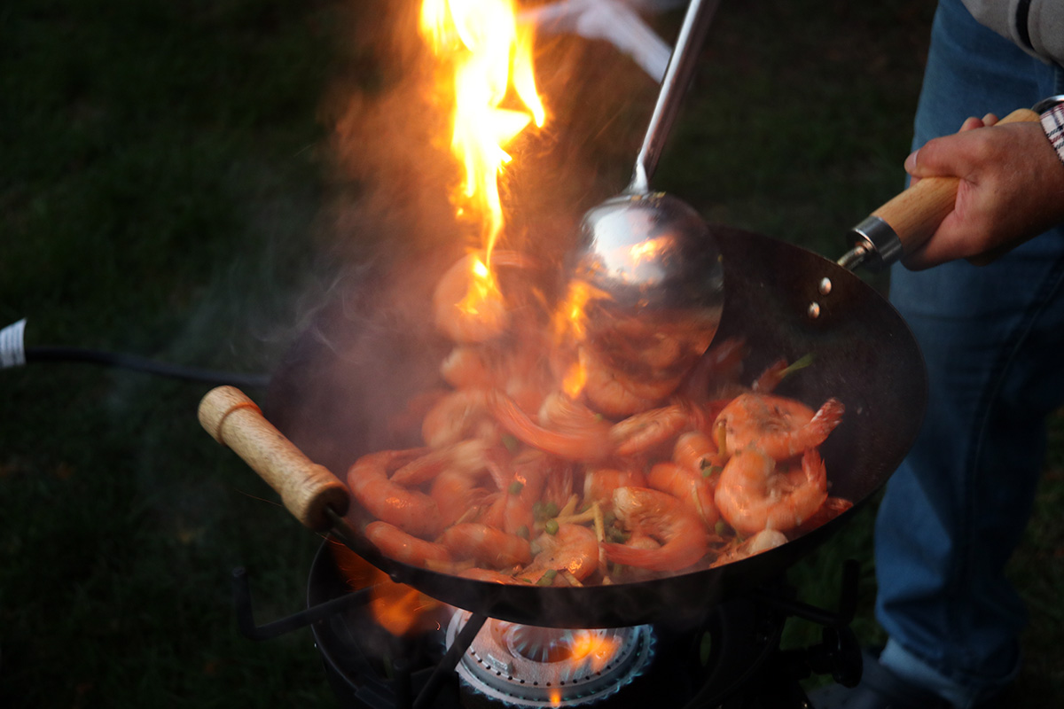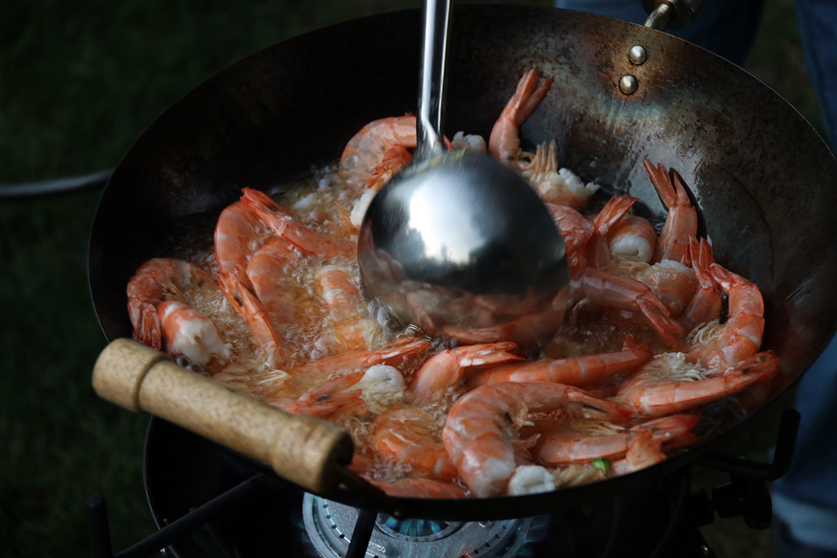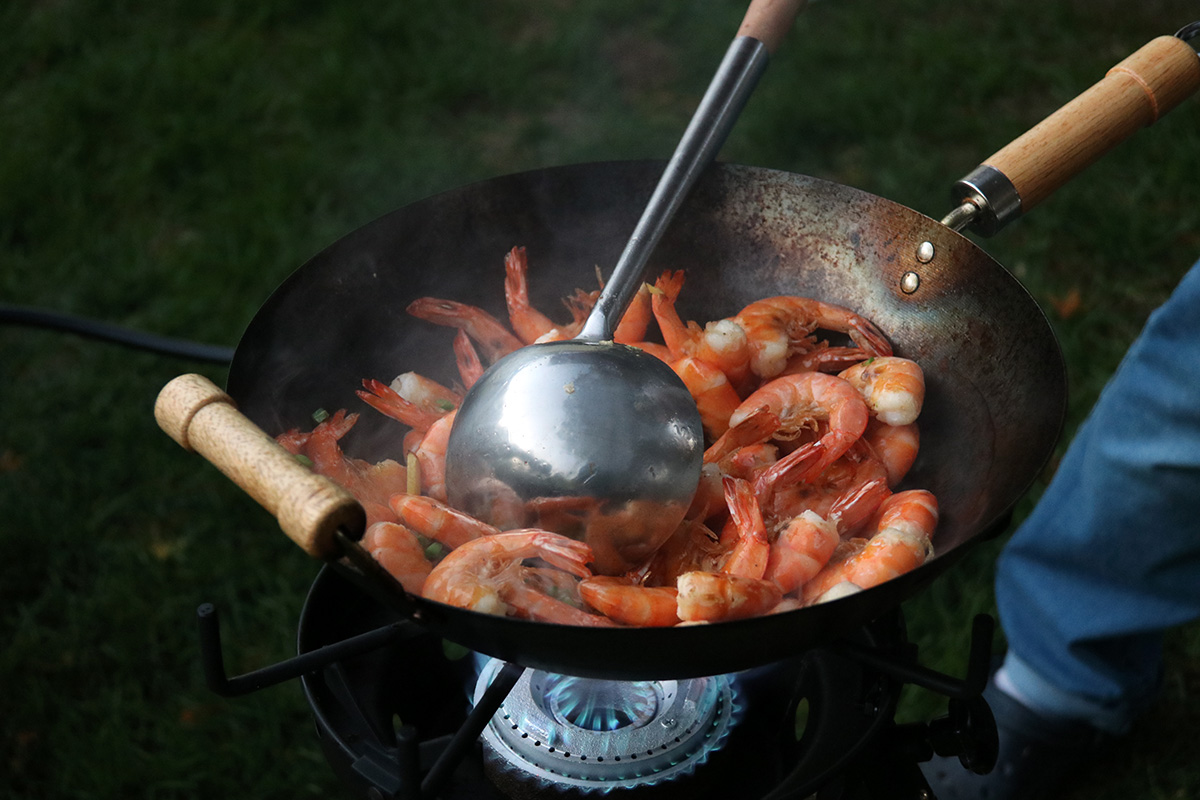 my father was waiting for me to deliver the jalapeno peppers so he could cook his salt & pepper shrimp. everyone went out to watch. he fried the shrimps first, but couldn't find his large skimmer, so the shrimps ended up overcooking while he resorted to a small skimmer. when he went to fry the shrimps a second time, i realized they weren't breaded, which meant they were going to be very crispy. the final result was a little disappointing, didn't look like the salt & pepper shrimp i had in mind.
