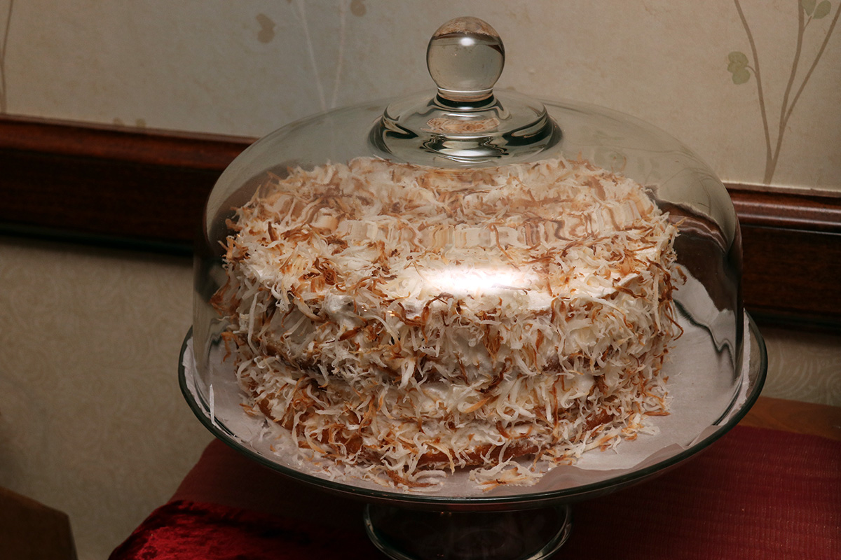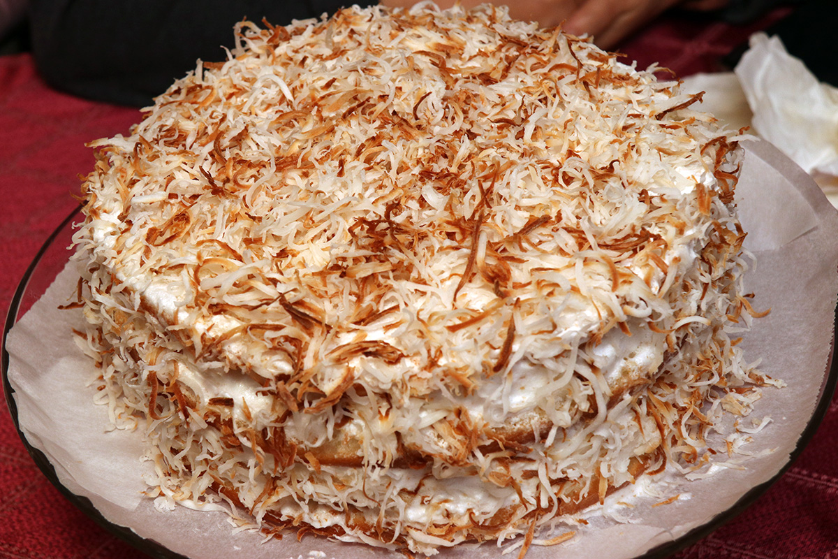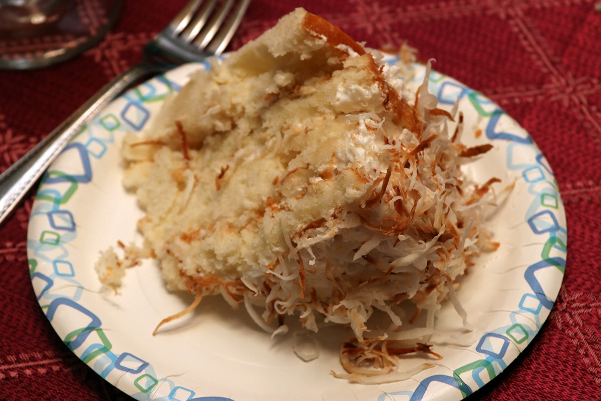 for dessert my aunt lili made a coconut cake consisting of 7 different coconut elements (coconut cream, coconut milk, coconut liquor, coconut extract, coconut water, fresh coconut). i accidentally took a large piece, but to be honest, the cake was delicious enough and fluffy enough that i would've had no problem eating the whole thing.