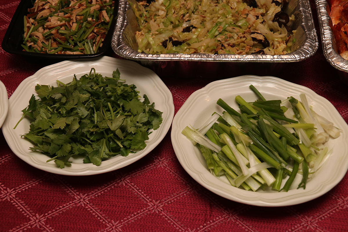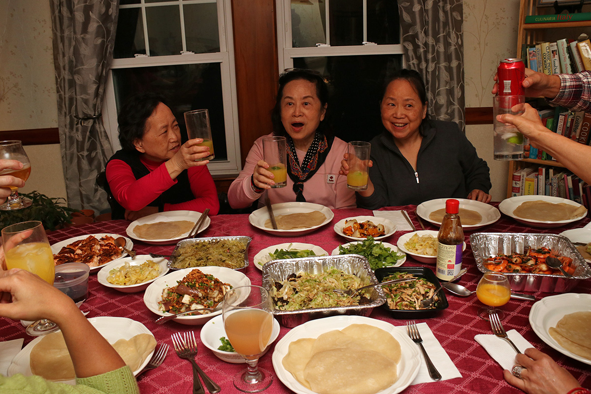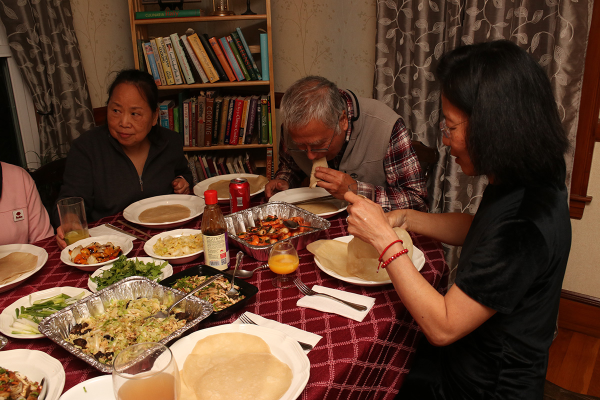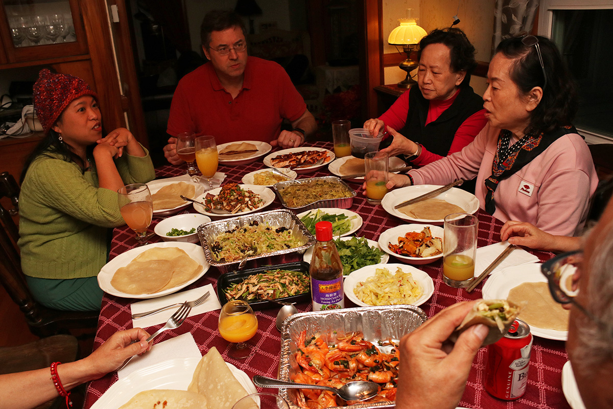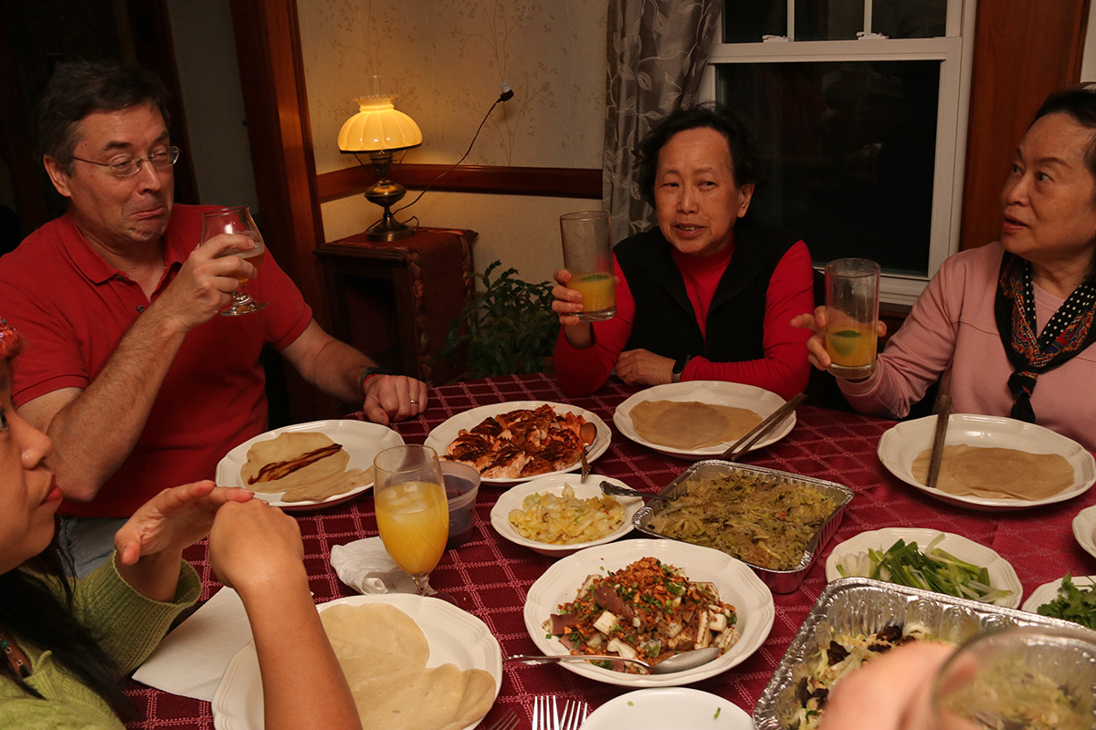 matthew was outside grilling some fish (arctic char from the salmon family). it was cold enough that i could see my breath. the main course was some mushu pork my father had made along with a stack of chunbing (spring pancakes). so used am i to eating chunbing for thanksgiving that it felt weird not to be eating it with the usual turkey.