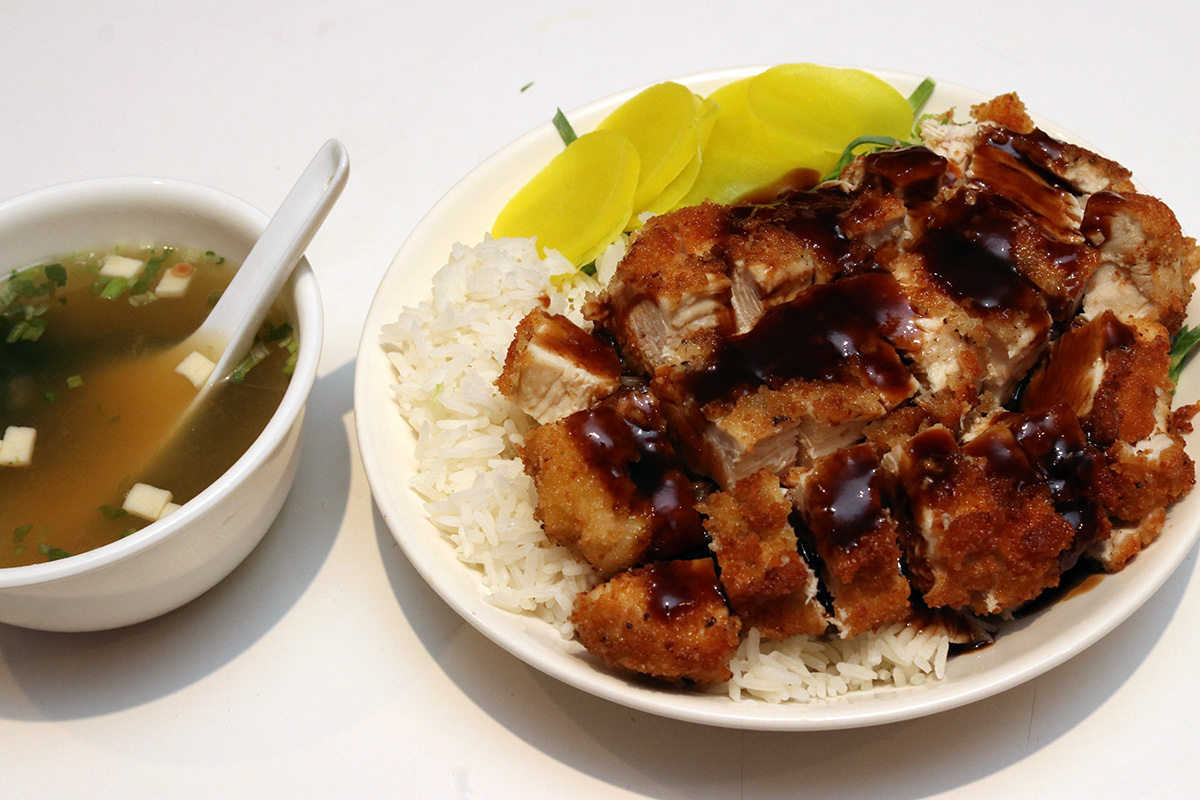 earlier i'd cooked 1 cup of jasmine rice. i also chopped some cabbage to go along with the katsu. i think i got the wrong kind though - green cabbage - which was overly tough and tasted like leaves. from the cafe i'd brought back a yellow pickled daikon radish and i cut a few slices. i made my own tonkatsu sauce too: 4 tbsp worcestershire sauce, 2 tbsp ketchup, 1 tbsp soy sauce, and 1 tsp brown sugar. the sauce tasted good, maybe not as good as kikkoman tonkatsu sauce, but still good enough that it's more than a worthy substitute. it was too runny though, maybe add equal parts worcestershire to ketchup next time (worcestershire gave it a spicy kick). finally, a prepared a bowl of instant miso soup to go along with the chicken katsu.