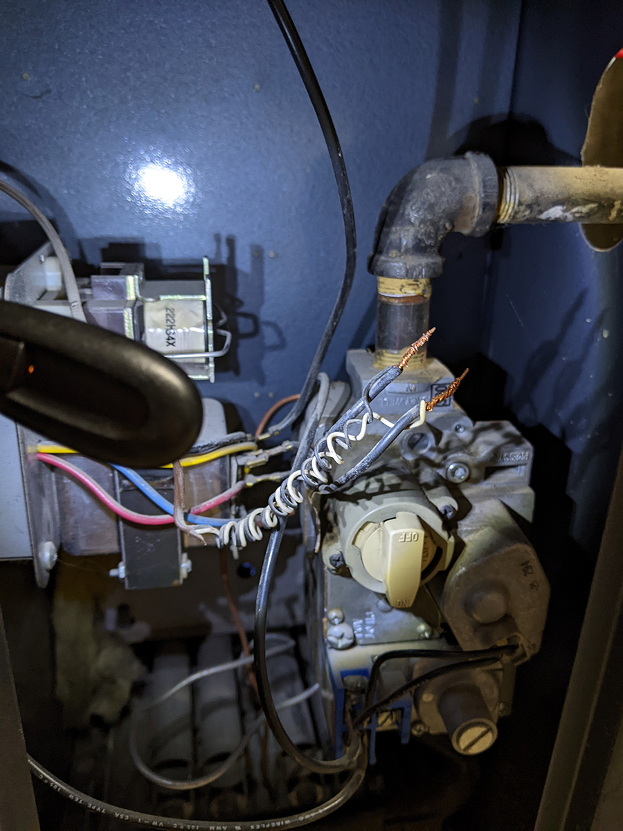 i tested the new power switch (which is essentially just a light switch) before installing it: no continuity when off, yes continuity when on. once the new switch was installed, i went upstairs to flip on the breaker and check the nest thermostat. it still said it wasn't getting electricity on the Rh wire, but now that i think about it, it's always said that because we basically hacked the wiring of the thermostat so that it has it's own dedicated 24v transformer. just ignore the error. when i turned up the heat on the thermostat, the furnace in the basement fired up immediately. $1.48 fix for a furnace that up until 30 minutes ago we thought was broken. my father called xiaowu to cancel the appointment.