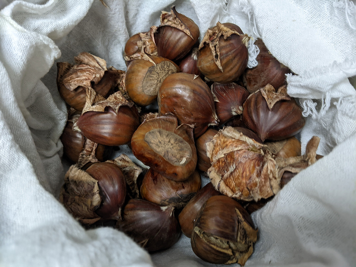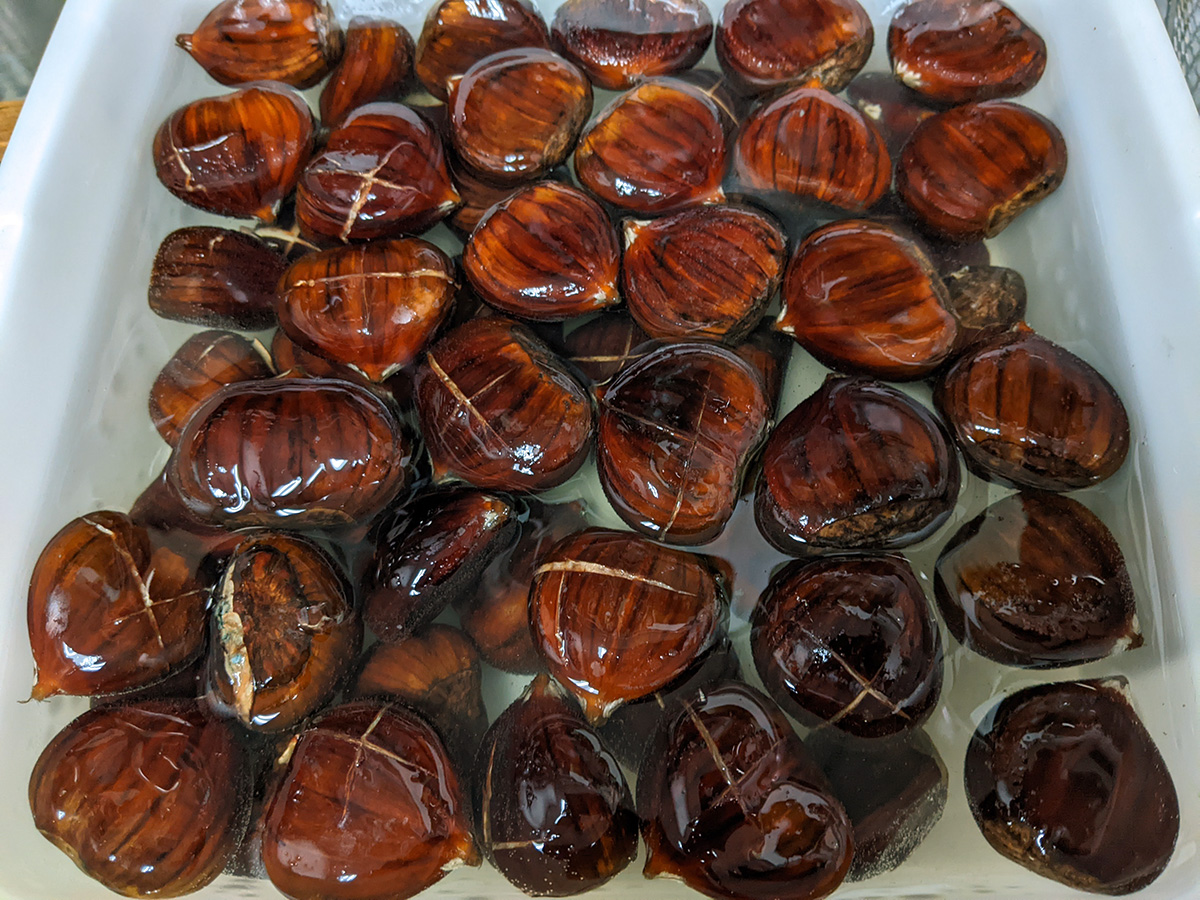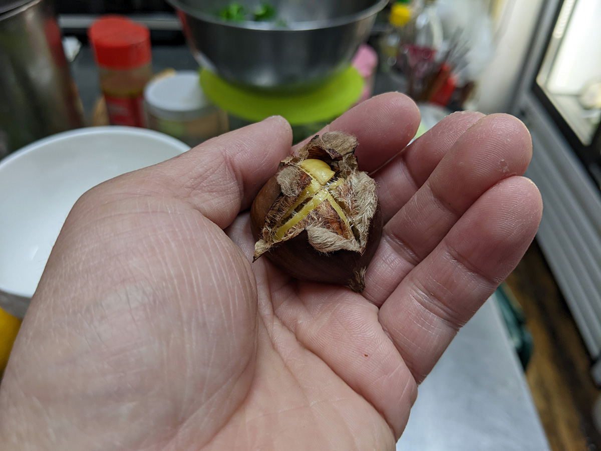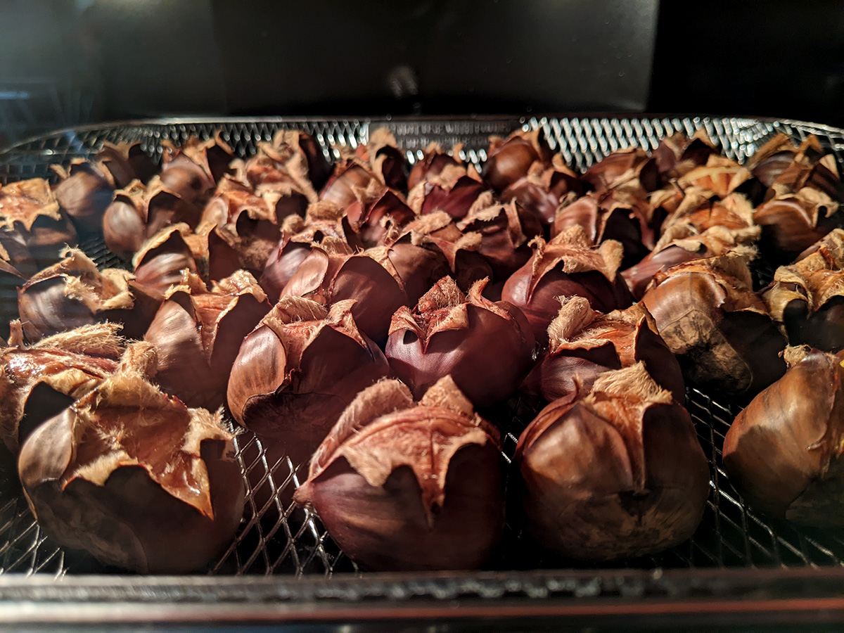 i'd been waiting all day for my sister to finish cooking so i could use the oven to roast the 2 lbs. of chestnuts i bought from haymarket on friday. earlier my father had scored them with an X to prevent bursting and easy peeling, and we'd been soaking the chestnuts in salt water since this morning. i was finally able to roast the chestnuts by around 5pm, 25 minutes at 450°.