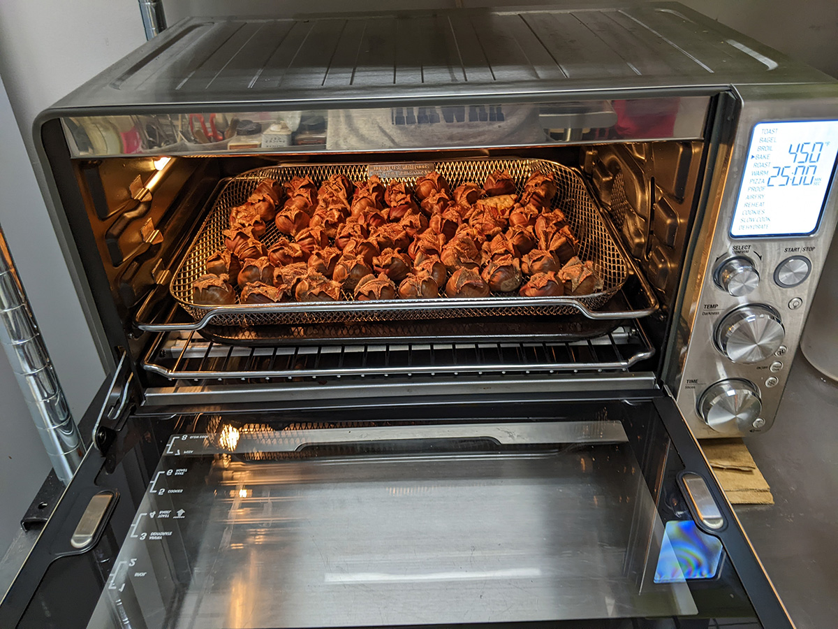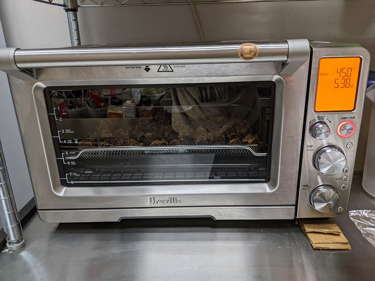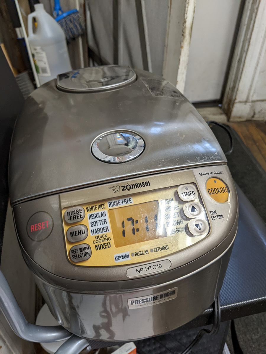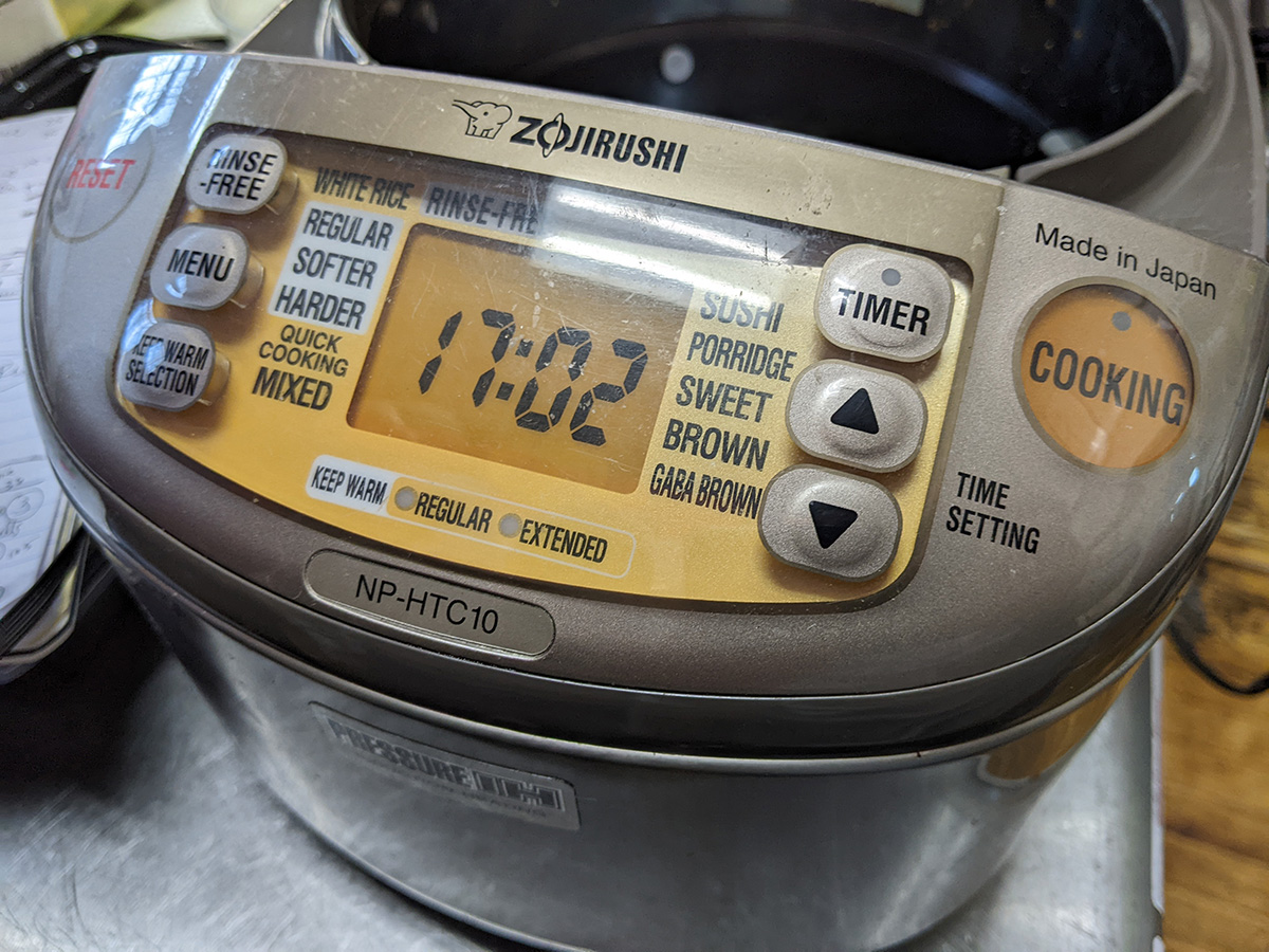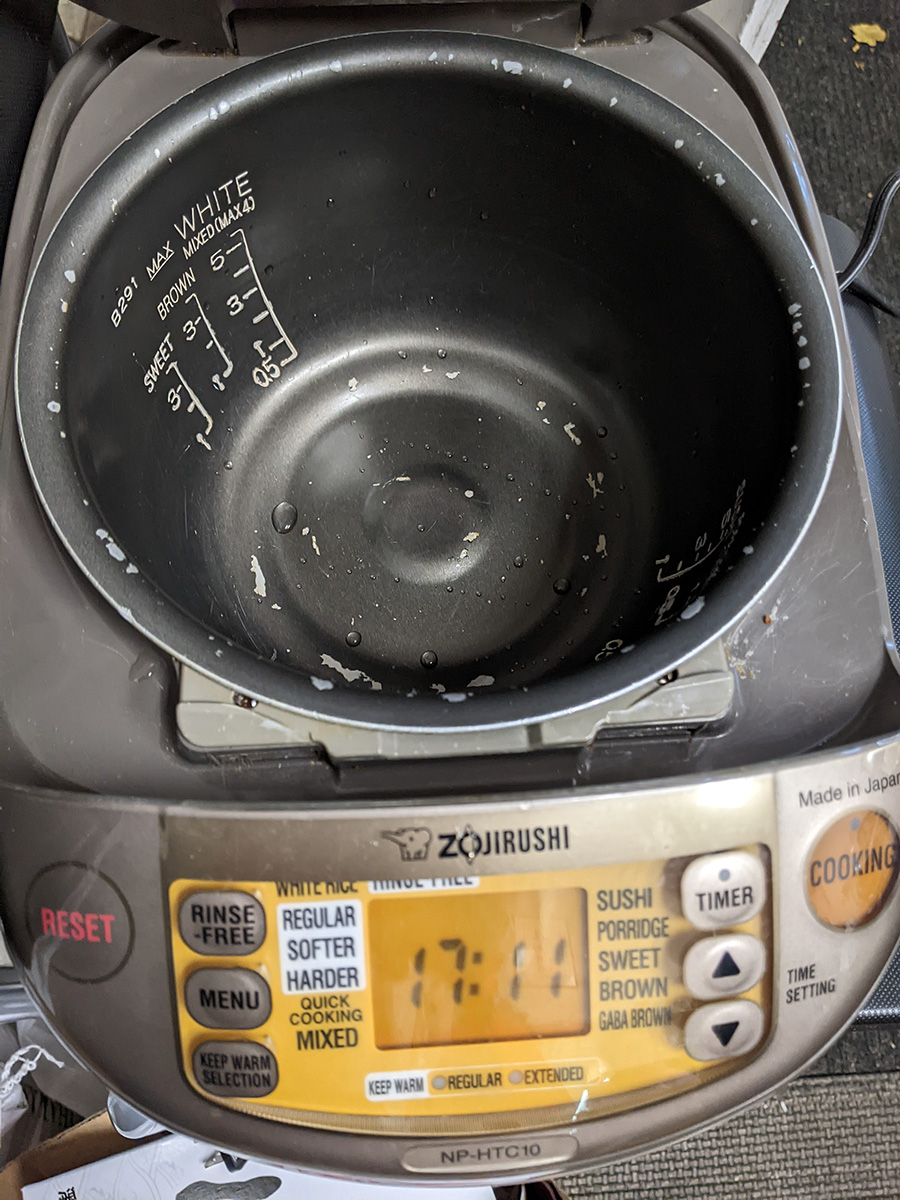 when my aunt came to the cafe later in the afternoon to pick up her catered order, she also brought along a zojirushi rice cooker she just happened to find on the curb. nobody finds more discounted high end rice cooker than my aunt. the 10 cup zojirushi rice cooker we currently use at the cafe was one she discovered at a good will store for cheap. the one that she brought today was the NP-HTC10 model (5.5 cups of rice), featuring pressure and induction cooking. induction meant the rice pot was stainless steel, and no spring-loaded pressure plate on the bottom like a typical rice cooker, but instead the cooker interior was completely smooth, other than a few contact points for activating the induction coils. it seemed to be in working condition and my aunt even tested it before dropping it off. it even had a battery backup because the clock was still running. the only catch was the non-stick interior of the pot was badly scratched, with multiple pieces of coating material flaking off. fortunately zojirushi does sell replacement pots, but they go for $89 (i later found out the pot is actually platinum coated, to alkalize water on contact; alkaline water breaks down rice protein which increases the sweetness apparently pots for later models come platinum coated, making them even more expensive). as for this rice cooker itself, it's actually one of zojirushi's flagship cookers, so it typically sells for around $500.