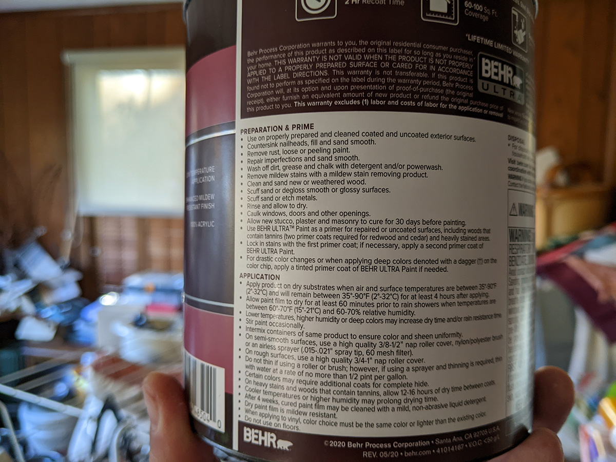 i went to home depot first to get some exterior paint. the 123 primer was okay for a primer, but i wanted something that was both primer and paint. last night i looked up home depot's paint selection, and saw some behr exterior paints that might be good. they only sold them by the gallon online, but i saw they had quart-sized in the store. i ended up getting a container of behr ultra exterior stain-blocking paint & primer in flat pure white 4850 ($24.98). the paint can be applied between 35°-90° and needs just 4 hours to dry, though can be exposed to rain showers after an hour when temperatures are above 60°. i protects against sunlight, moisture, and mildew, and can be cleaned with just soap and water.