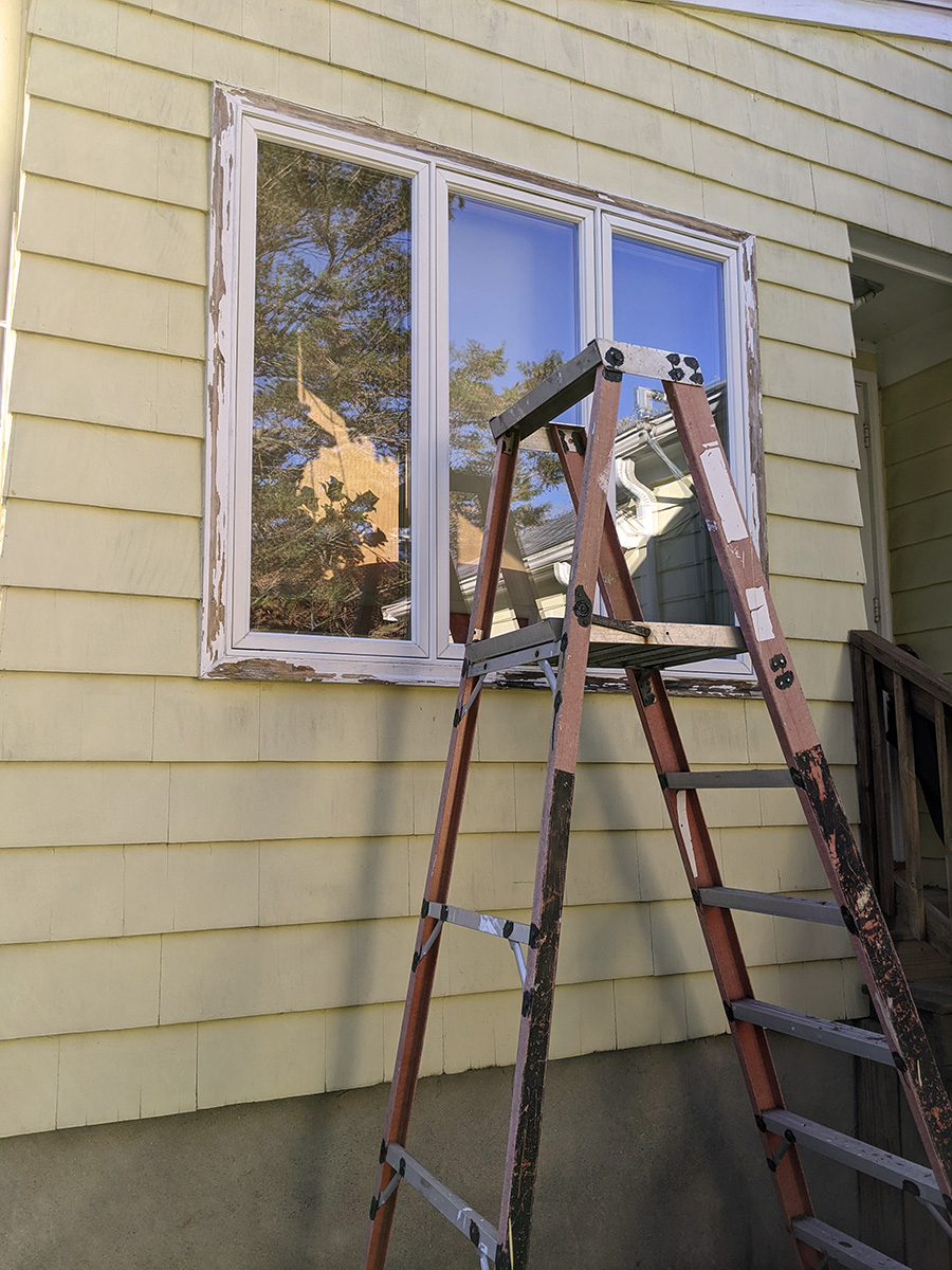 after a bit of light sanding on a wood-filler patched area in the molding, i started painting. i was finished after less than half an hour. i also scraped off some peeling paint from the exterior frame of the living room window and did a bit of caulking (requiring just 30 minutes of dry time before painting). before i left i came out and painted over this area as well.