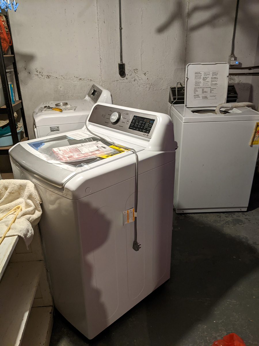 i was eager for closing time, so i could head to belmont and install the washer and dryer. the first thing i did when i got there was go down to the basement and see the new appliances. my father and i decided what additional materials we needed to get. since we had an hour to kill before dinner, we drove down to home depot to pick up the supplies.