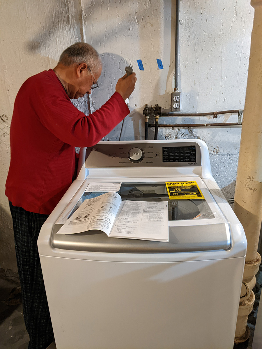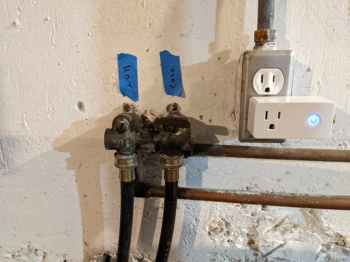 instead of trying to replace the valve, we didn't to just live with it for now. it wasn't like the valve was leaking, it just wouldn't shut off. but we could still connect the washer, just had to shut off the water main to the house. so we went ahead and did that. we had everything connected, the legs leveled, the washer plugged in. we went upstairs and turned on all the faucets to force the air out of the plumbing. before we ran a washer test, i checked the water connections one last time to make sure it wasn't leaking. it wasn't, but my father had connected the hot water inlet to the cold, and vice versa. so we had to shut off the water again, switch the hoses, turn the water back on, bleed all the plumbing upstairs, and only then could we run the test.
