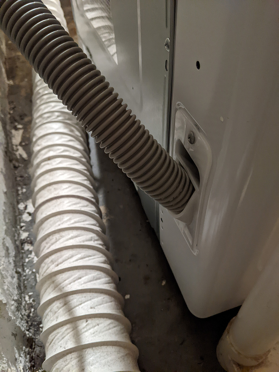 there was also the issue of the dryer duct. i bought an 8-ft semi-rigid duct online, but we took a measurement, and the distance from the washer to the exhaust vent in the window seems to be more than 8ft. so instead we put back the old flexible pvc duct, which is a fire hazard (filled with lint), but it's only a temporary measure, until we can figure out a better duct system.