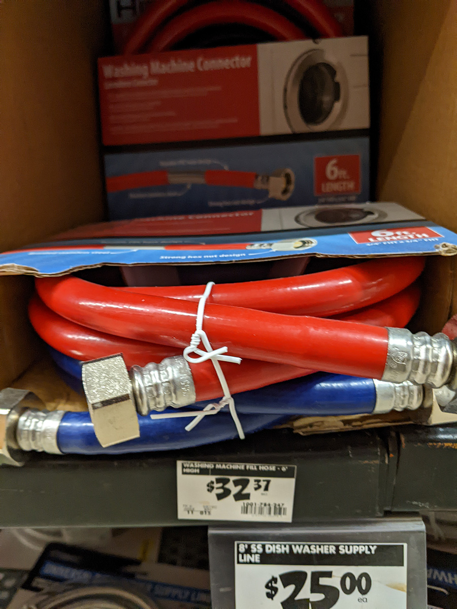 when we went to go pay, the inlet hoses we picked up that was one price ended up to be way more expensive (everbilt $36). by then we didn't care anymore, we just paid and left. in the car i decided we would reuse our old inlet hoses, and return these more expensive hoses in exchange for something cheaper i might find on amazon.