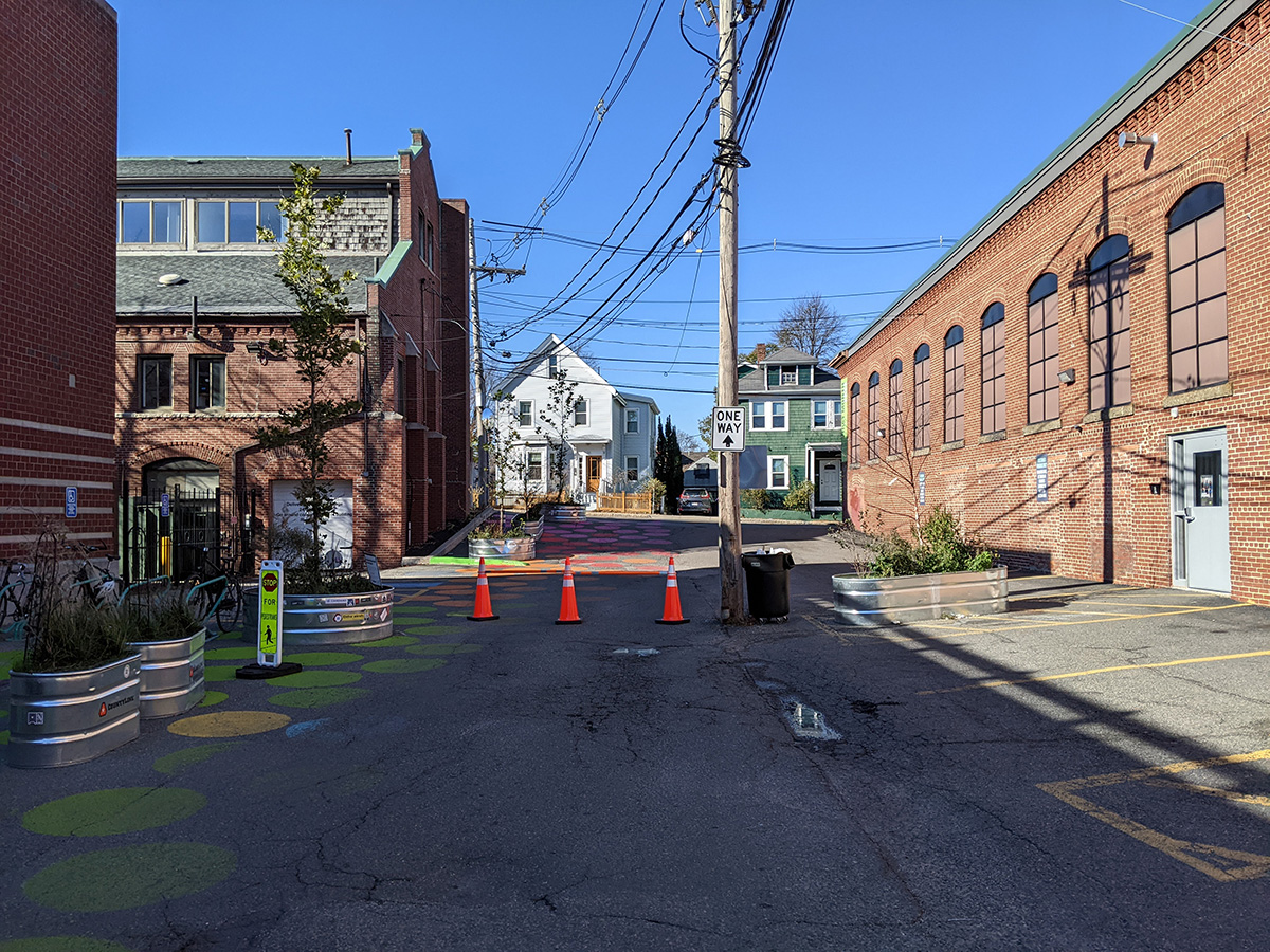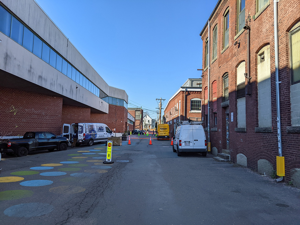 i went to market basket this morning in search of mussels and more drinks. for some reason they set up road blocks in the alleyway that goes from dane street to the supermarket. i noticed they (the handful of offices and lab spaces that use that alleyway) have been trying to restrict access for years now, from installing planters to make it harder to drive down to a few months ago when they put up a do not enter sign. but the locals are so used to going that way, none of those measures can stop them from using the alleyway as a shortcut.